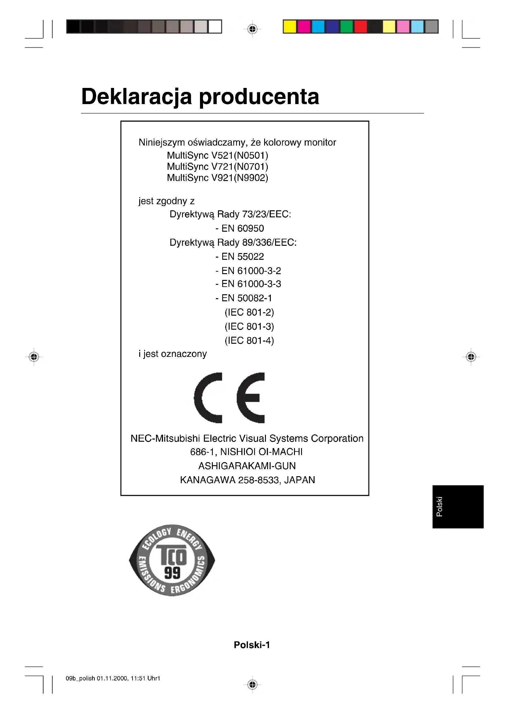 Jako partner Energy Star, firma NEC-Mitsubishi Electronics Display of America Inc. deklaruje, ˝e monitor spe∏nia zalecenia Energy Star w zakresie sprawnoÊci energetycznej. Znak ENERGY STAR nie oznacza, ˝e EPA promuje jakiekolwiek produkty lub us∏ugi. IBM jest zarejestrowanym znakiem towarowym firmy International Business MachinesCorporation.Apple i Macintosh sà zarejestrowanymi znakami handlowymi firmy Apple Computer Inc.Microsoft i Windows sà zarejestrowanymi znakami handlowymi firmy Microsoft Corporation. ENERGY STA R jest znakiem towarowym zarejestrowanym w Stanach Zjednoczonych. NEC STAR jest zarejestrowanym znakiem handlowym firmy NEC Corporation.Wszystkie inne znaki handlowe lub zarejestrowane znaki handlowe stanowià w∏asnoÊç ichw∏aÊcicieli.09b_polish 01.11.2000, 11:51 Uhr2Polski-3 Polski ZawartoÊç opakowania Wewnàtrz kartonu z monitorem serii V* powinny znajdowaç si´ nast´pujàce elementy: