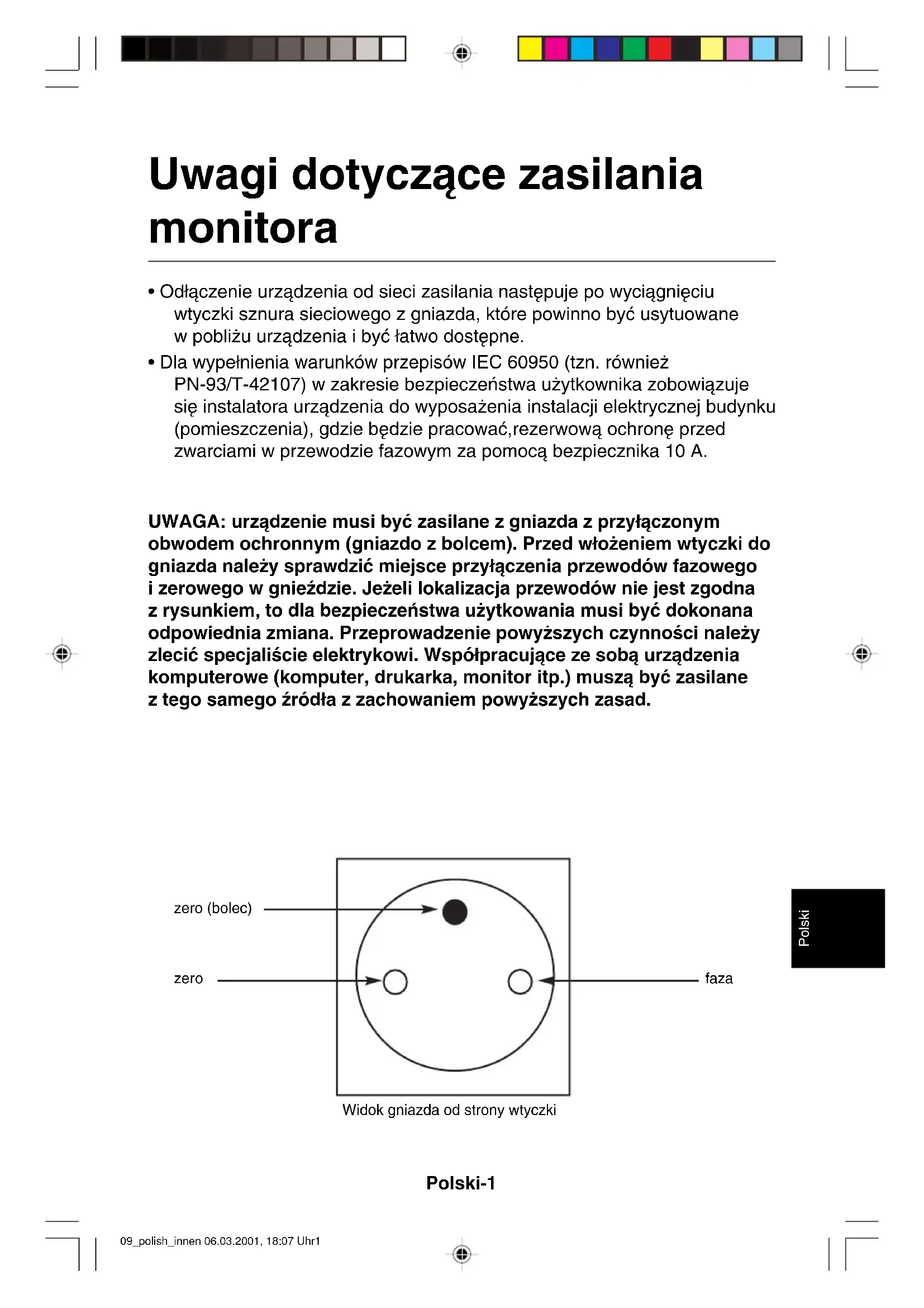 - Dla wype∏nienia warunków przepisów IEC 60950 (tzn. równie˝ PN-93/T-42107) w zakresie bezpieczeƒstwa u˝ytkownika zobowiàzuje si´ instalatora urzàdzenia do wyposa˝enia instalacji elektrycznej budynku (pomieszczenia), gdzie b´dzie pracowaç,rezerwowà ochron´ przed zwarciami w przewodzie fazowym za pomocà bezpiecznika 10 A. UWAGA: urzàdzenie musi byç zasilane z gniazda z przy∏àczonym obwodem ochronnym (gniazdo z bolcem). Przed w∏o˝eniem wtyczki do gniazda nale˝y sprawdziç miejsce przy∏àczenia przewodów fazowego izerowego w gnieêdzie. Je˝eli lokalizacja przewodów nie jest zgodna zrysunkiem, to dla bezpieczeƒstwa u˝ytkowania musi byç dokonana odpowiednia zmiana. Przeprowadzenie powy˝szych czynnoÊci nale˝y zleciç specjaliÊcie elektrykowi. Wspó∏pracujàce ze sobà urzàdzenia komputerowe (komputer, drukarka, monitor itp.) muszà byç zasilane ztego samego êród∏a z zachowaniem powy˝szych zasad. zero (bolec) zero faza Widok gniazda od strony wtyczki 09_polish_innen 06.03.2001, 18:07 Uhr1Polski-2 ZawartoÊç opakowania Wewnàtrz kartonu* z monitorem MultiSync FP1375X powinny znajdowaç si´ nast´pujàce elementy: