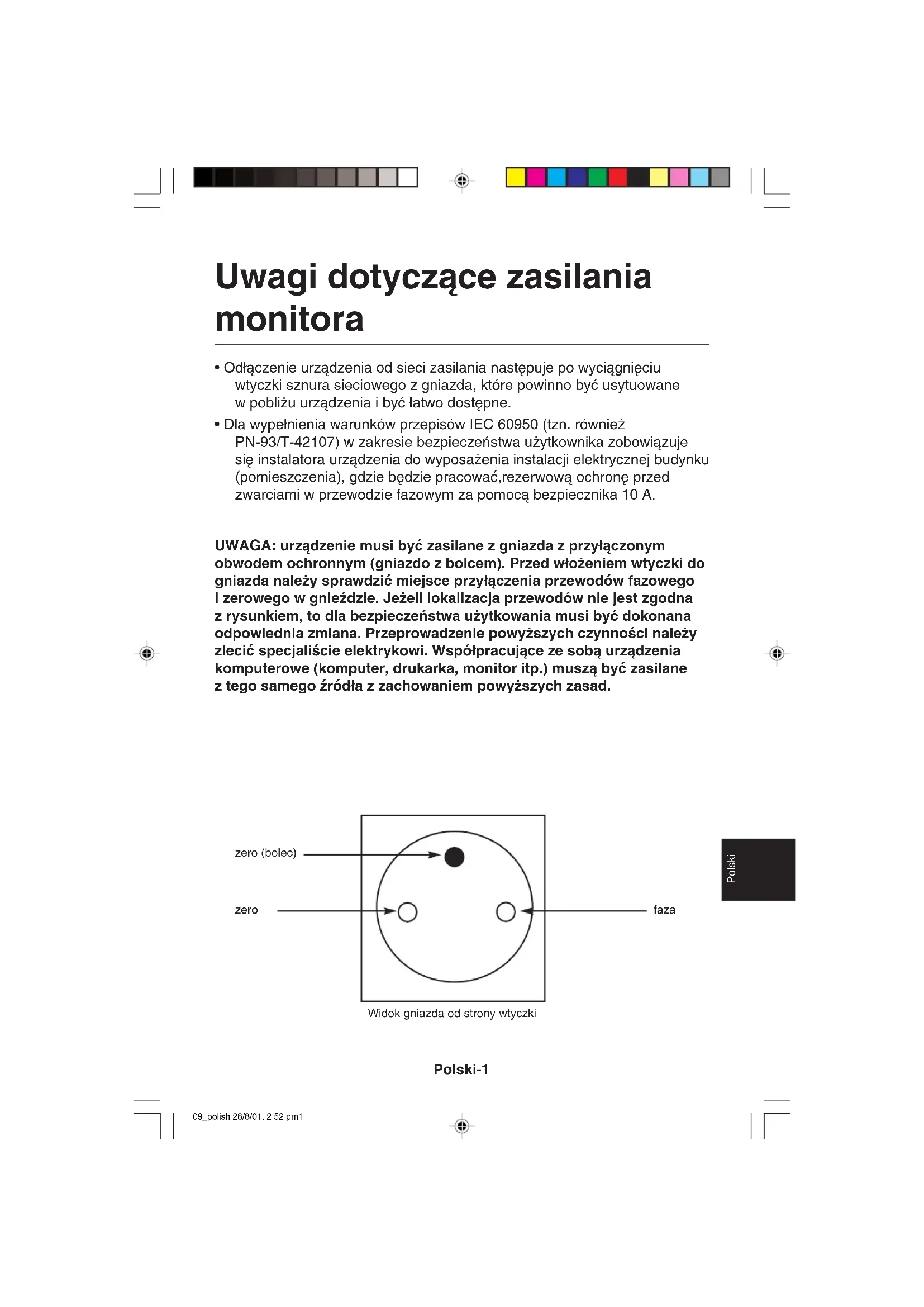 - Dla wype∏nienia warunków przepisów IEC 60950 (tzn. równie˝ PN-93/T-42107) w zakresie bezpieczeƒstwa u˝ytkownika zobowiàzuje si´ instalatora urzàdzenia do wyposa˝enia instalacji elektrycznej budynku (pomieszczenia), gdzie b´dzie pracowaç,rezerwowà ochron´ przed zwarciami w przewodzie fazowym za pomocà bezpiecznika 10A. UWAGA: urzàdzenie musi byç zasilane z gniazda z przy∏àczonym obwodem ochronnym (gniazdo z bolcem). Przed w∏o˝eniem wtyczki do gniazda nale˝y sprawdziç miejsce przy∏àczenia przewodów fazowego izerowego w gnieêdzie. Je˝eli lokalizacja przewodów nie jest zgodna zrysunkiem, to dla bezpieczeƒstwa u˝ytkowania musi byç dokonana odpowiednia zmiana. Przeprowadzenie powy˝szych czynnoÊci nale˝y zleciç specjaliÊcie elektrykowi. Wspó∏pracujàce ze sobà urzàdzenia komputerowe (komputer, drukarka, monitor itp.) muszà byç zasilane ztego samego êród∏a z zachowaniem powy˝szych zasad. zero (bolec) zero faza Widok gniazda od strony wtyczki 09_polish 28/8/01, 2:52 pm1Polski-2 W CELU UNIKNI¢CIA NIEBEZPIECZE¡STWA PO˚ARU LUB PORA˚ENIA PRÑDEM NIE NALE˚Y WYSTAWIAå MONITORA NA DESZCZ LUB NA DZIA¸ANIE WILGOCI. NALE˚Y TAK˚E SPRAWDZIå, CZY BOLCE WTYCZKI KABLA ZASILAJÑCEGO SÑ PRAWID¸OWO W¸O˚ONE DO GNIAZDA ZASILAJÑCEGO LUB GNIAZDA PRZED¸U˚ACZA. WTYCZKI NIE NALE˚Y WK¸ADAå DO GNIAZDA NA SI¸¢. NIE NALE˚Y OTWIERAå OBUDOWY, PONIEWA˚ WEWNÑTRZ ZNAJDUJÑ SI¢ ELEMENTY POD WYSOKIM NAPI¢CIEM. WSZELKIE PRACE SERWISOWE MO˚E WYKONYWAå JEDYNIE WYKWALIFIKOWANY PERSONEL. UWAGA ZDJ¢CIE OBUDOWY GROZI PORA˚ENIEM PRÑDEM ELEKTRYCZNYM. WEWNÑTRZ MONITORA NIE MA ˚ADNYCH ELEMENTÓW, KTÓRE U˚YTKOWNIK MÓG¸BY SAMODZIELNIE NAPRAWIAÅ. WSZELKIE PRACE SERWISOWE MO˚E WYKONYWAå JEDYNIE WYKWALIFIKOWANY PERSONEL. Ten symbol ostrzega u˝ytkownika, ˝e nieizolowane elementy wewnàtrz znajdujà si´ pod tak du˝ym napi´ciem, ˝e mo˝e ono spowodowaç pora˝enie pràdem elektrycznym. Jakikolwiek bezpoÊredni kontakt z dowolnym elementem wewnàtrz obudowy jest niebezpieczny. Ten symbol ostrzega u˝ytkownika, ˝e istotne informacje dotyczàce pracy iobs∏ugi monitora znajdujà si´ w za∏àczonej literaturze. W zwiàzku z tym nale˝y si´ szczegó∏owo z nimi zapoznaç w celu unikni´cia problemów. UWAGA OSTRZE˚ENIE