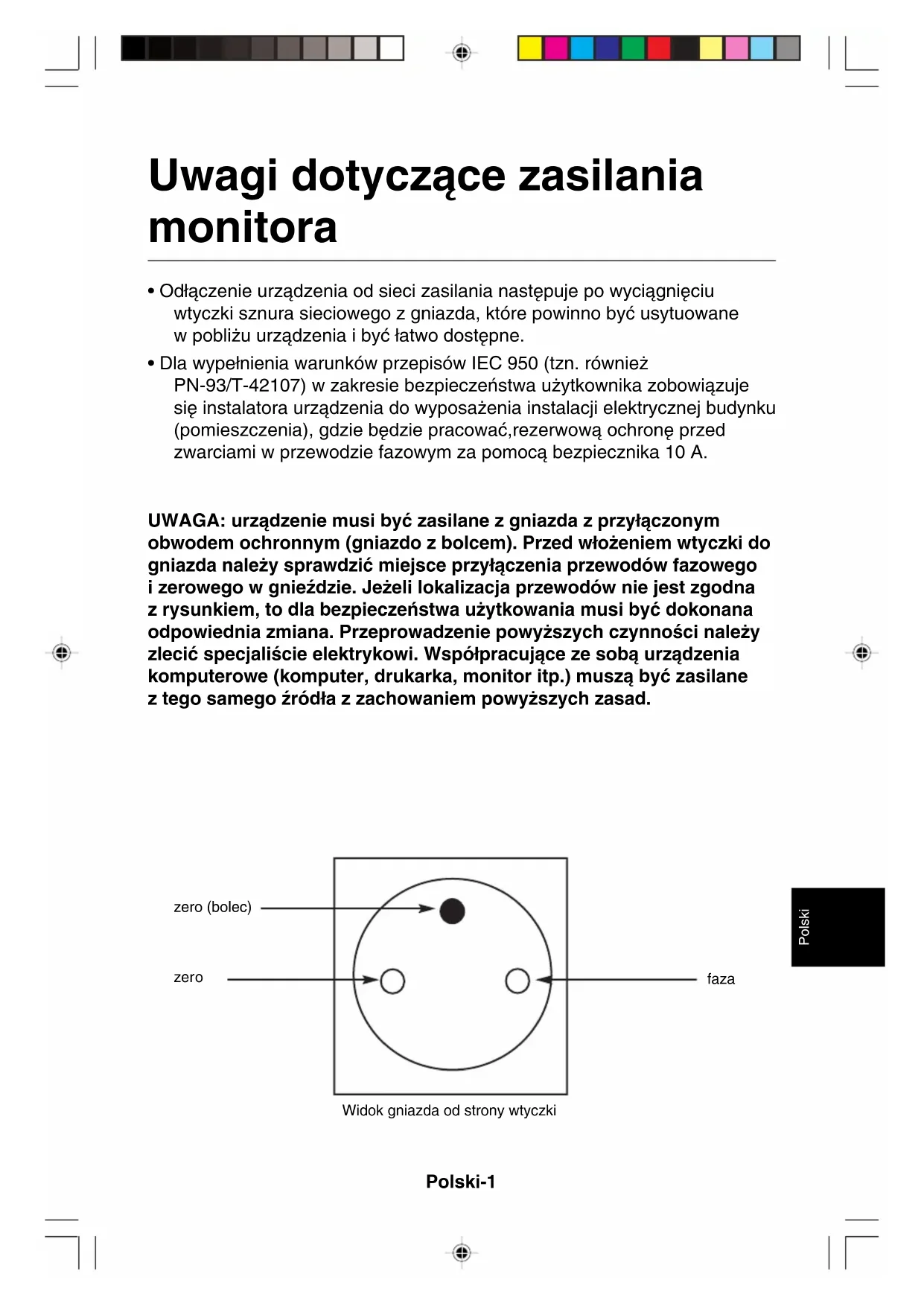 - Dla wype∏nienia warunków przepisów IEC 950 (tzn. równie˝ PN-93/T-42107) w zakresie bezpieczeƒstwa u˝ytkownika zobowiàzuje si´ instalatora urzàdzenia do wyposa˝enia instalacji elektrycznej budynku (pomieszczenia), gdzie b´dzie pracowaç,rezerwowà ochron´ przed zwarciami w przewodzie fazowym za pomocà bezpiecznika 10 A. UWAGA: urzàdzenie musi byç zasilane z gniazda z przy∏àczonym obwodem ochronnym (gniazdo z bolcem). Przed w∏o˝eniem wtyczki do gniazda nale˝y sprawdziç miejsce przy∏àczenia przewodów fazowego izerowego w gnieêdzie. Je˝eli lokalizacja przewodów nie jest zgodna zrysunkiem, to dla bezpieczeƒstwa u˝ytkowania musi byç dokonana odpowiednia zmiana. Przeprowadzenie powy˝szych czynnoÊci nale˝y zleciç specjaliÊcie elektrykowi. Wspó∏pracujàce ze sobà urzàdzenia komputerowe (komputer, drukarka, monitor itp.) muszà byç zasilane ztego samego êród∏a z zachowaniem powy˝szych zasad. zero (bolec) zero faza Widok gniazda od strony wtyczkiPolski-2 W CELU UNIKNI¢CIA NIEBEZPIECZE¡STWA PO˚ARU LUB PORA˚ENIA PRÑDEM NIENALE˚Y WYSTAWIAå MONITORA NA DESZCZ LUB NA DZIA¸ANIE WILGOCI. JAKRÓWNIE˚ NALE˚Y UPEWNIå SI¢, ˚E BOLCE WTYCZKI KABLA ZASILAJÑCEGO SÑCA¸KOWICIE WSADZONE W GNIAZDO ZASILAJÑCE LUB W GNIAZDO PRZED¸U˚ACZA.NIE NALE˚Y OTWIERAå OBUDOWY PONIEWA˚ WEWNÑTRZ SÑ ELEMENTYZNAJDUJÑCE SI¢ POD WYSOKIM NAPI¢CIEM. Wszelkie prace serwisowe mo˝e wykonywaçjedynie wykwalifikowany personel. UWAGA Zdj´cie obudowy grozi pora˝eniem pràdem elektrycznym. Wewnàtrz monitora nie ma˝adnych elementów, które u˝ytkownik móg∏by obs∏ugiwaç. Wszelkie prace serwisowemo˝e wykonywaç jedynie wykwalifikowany personel.Ten symbol ostrzega u˝ytkownika, ˝e nieizolowane elementy wewnàtrz znajdujà si´pod tak du˝ym napi´ciem, i˝ mo˝e ono spowodowaç pora˝enie pràdem elektrycznym.Jakikolwiek bezpoÊredni kontakt z jakimkolwiek elementem wewnàtrz obudowy mo˝egroziç niebezpieczeƒstwem.Ten symbol ostrzega u˝ytkownika, ˝e istotne informacje dotyczàce pracy i obs∏ugimonitora znajdujà si´ w za∏àczonej literaturze. W zwiàzku z tym, nale˝y szczegó∏owozapoznaç si´ z nimi w celu unikni´cia problemów. UWAGA OSTRZE˚ENIE NIEBEZPIECZE¡STWO PORA˚ENIA PRÑDEMELEKTRYCZNYM NIE OTWIERAå ENERGY STAR jest zarejestrowanym znakiem handlowym w USA. Jako Partner firmy ENERGY STAR