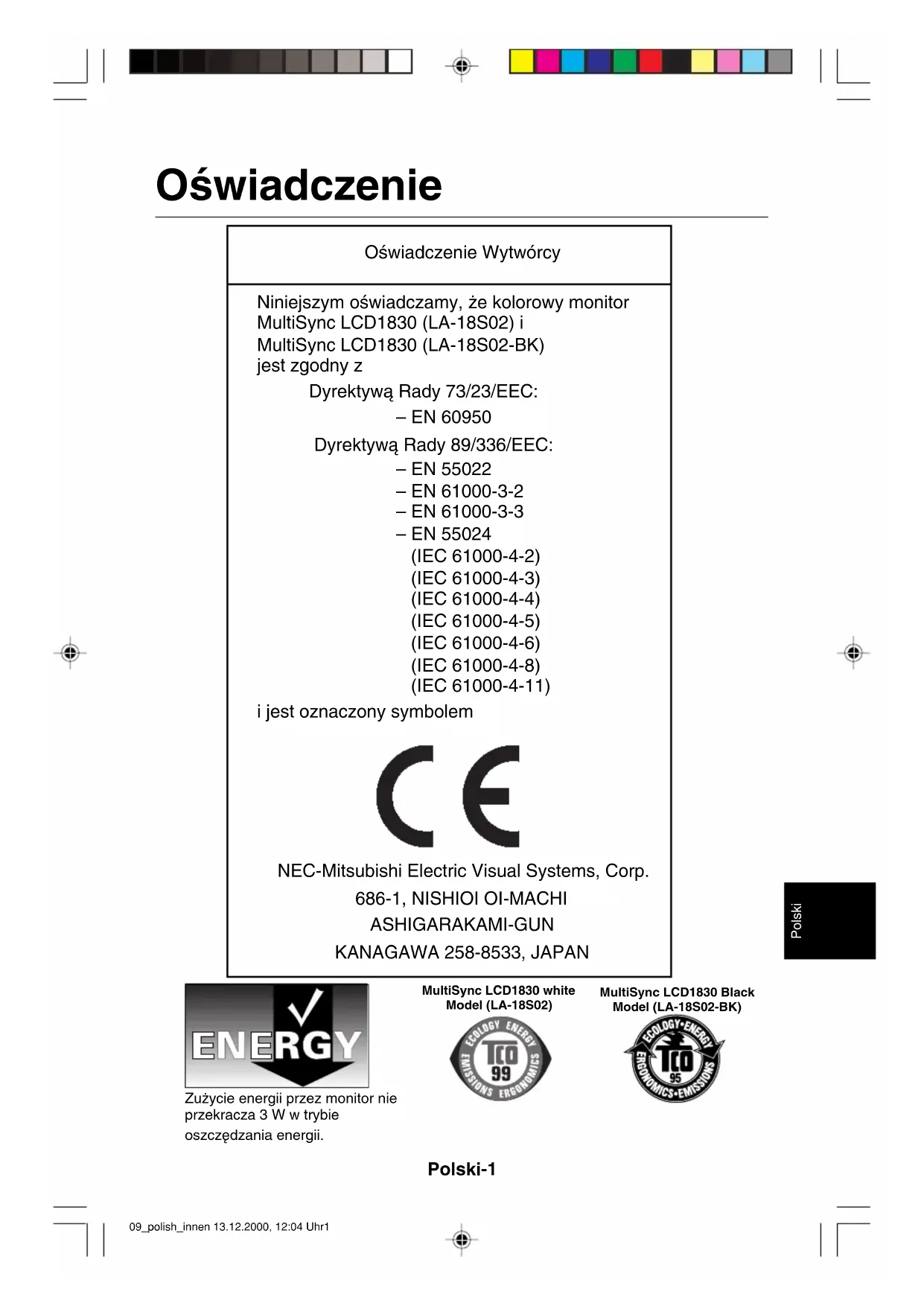 Zu˝ycie energii przez monitor nie przekracza 3W w trybie oszcz´dzania energii. MultiSync LCD1830 white Model (LA-18S02) MultiSync LCD1830 Black Model (LA-18S02-BK) 09_polish_innen 13.12.2000, 12:04 Uhr1Polski-2 ZawartoÊç opakowania Wewnàtrz kartonu* z nowym monitorem NEC MultiSync LCD powinny znajdowaç si´ nastepujàce elementy: