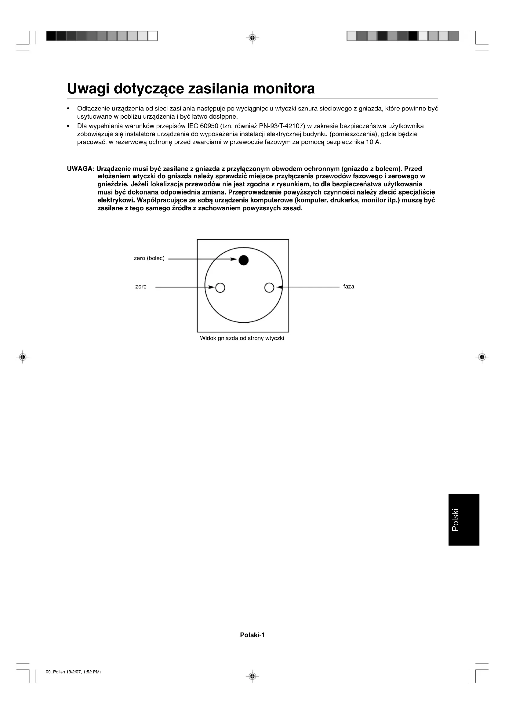 - Dla wype∏nienia warunków przepisów IEC 60950 (tzn. równie˝ PN-93/T-42107) w zakresie bezpieczeƒstwa u˝ytkownika zobowiàzuje si´ instalatora urzàdzenia do wyposa˝enia instalacji elektrycznej budynku (pomieszczenia), gdzie b´dzie pracowaç, w rezerwowà ochron´ przed zwarciami w przewodzie fazowym za pomocà bezpiecznika 10A. UWAGA: Urzàdzenie musi byç zasilane z gniazda z przy∏àczonym obwodem ochronnym (gniazdo z bolcem). Przed w∏o˝eniem wtyczki do gniazda nale˝y sprawdziç miejsce przy∏àczenia przewodów fazowego izerowego w gnieêdzie. Je˝eli lokalizacja przewodów nie jest zgodna zrysunkiem, to dla bezpieczeƒstwa u˝ytkowania musi byç dokonana odpowiednia zmiana. Przeprowadzenie powy˝szych czynnoÊci nale˝y zleciç specjaliÊcie elektrykowi. Wspó∏pracujàce ze sobà urzàdzenia komputerowe (komputer, drukarka, monitor itp.) muszà byç zasilane ztego samego êród∏a z zachowaniem powy˝szych zasad. zero (bolec) zero faza Widok gniazda od strony wtyczki 09_Polish 19/2/07, 1:52 PM1Polski-2 OSTRZE˚ENIE UWAGA UWAGA: W CELU UNIKNI¢CIA NIEBEZPIECZE¡STWA PORA˚ENIA PRÑDEM ELEKTRYCZNYM UPEWNIJ SI¢, ˚E WTYCZKA PRZEWODU ZASILAJÑCEGO ZOSTA¸A WYCIÑGNI¢TA Z GNIAZDKA. ABY CA¸KOWICIE OD¸ÑCZYå ZASILANIE, NALE˚Y WYCIÑGNÑå WTYCZK¢ Z GNIAZDKA ZASILAJÑCEGO NIE WOLNO ZDEJMOWAå OS¸ONY (ANI TYLNEJ ÂCIANKI). WEWNÑTRZ MONITORA NIE MA ˚ADNYCH ELEMENTÓW, KTÓRE U˚YTKOWNIK MÓG¸BY SAMODZIELNIE NAPRAWIAå. WSZELKIE PRACE SERWISOWE MO¯E WYKONYWA˚ JEDYNIE WYKWALIFIKOWANY PERSONEL. Ten symbol ostrzega u˝ytkownika, ˝e nieizolowane elementy wewnàtrz znajdujà si´ pod tak du˝ym napi´ciem, ˝e mo˝e ono spowodowaç pora˝enie pràdem elektrycznym. Jakikolwiek bezpoÊredni kontakt z dowolnym elementem wewnàtrz obudowy jest niebezpieczny. Ten symbol ostrzega u˝ytkownika, ˝e istotne informacje dotyczàce pracy i obs∏ugi monitora znajdujà si´ w za∏àczonej literaturze. W zwiàzku z tym nale˝y si´ szczegó∏owo z nimi zapoznaç w celu unikni´cia problemów. Ostrze˝enie: Je˝eli monitor MultiSync 20WGX