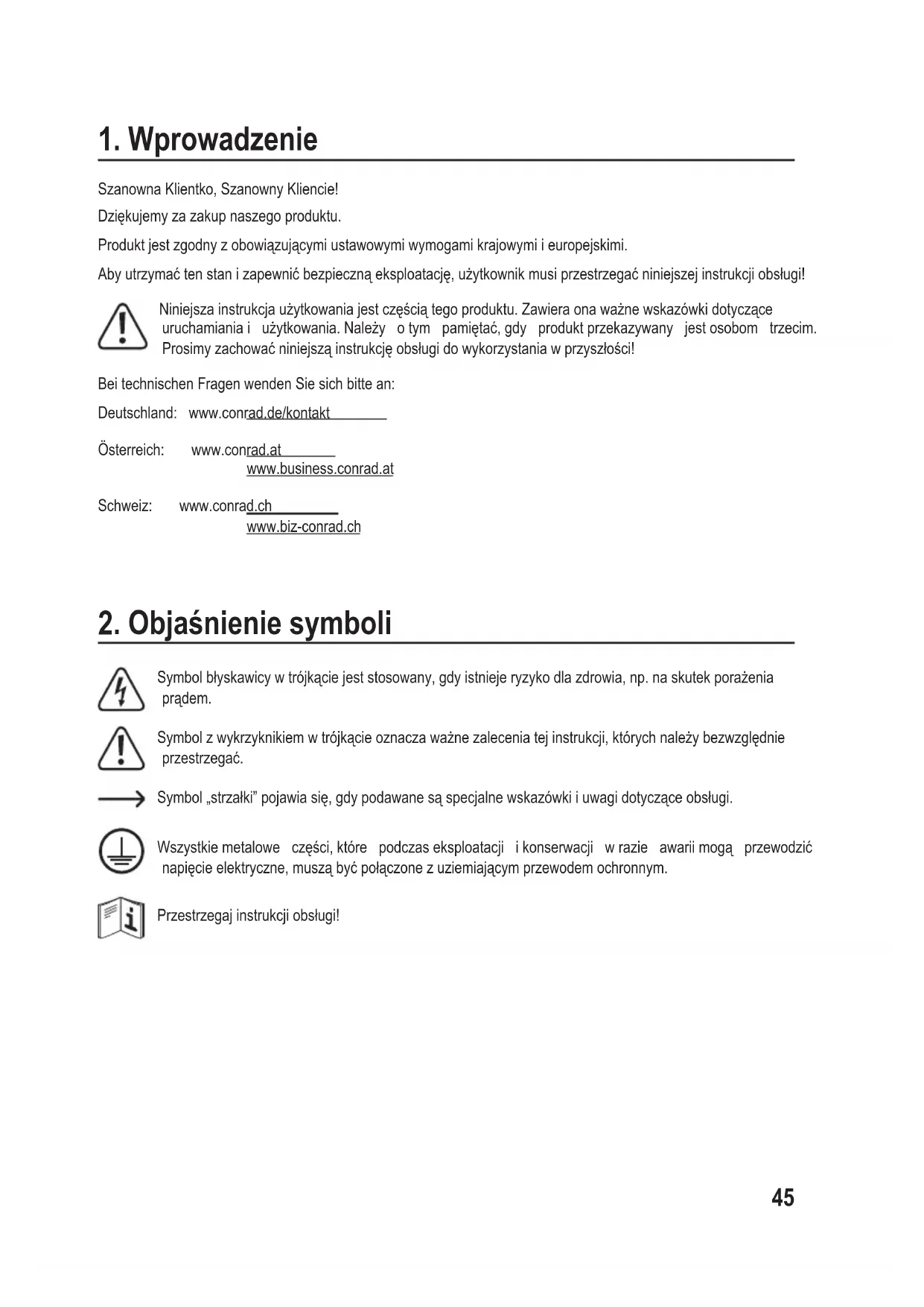 SzanownaKlientko,SzanownyKliencie! Dziękujemyzazakupnaszegoproduktu. Produktjestzgodnyzobowiązującymiustawowymiwymogamikrajowymiieuropejskimi. Abyutrzymaćtenstanizapewnićbezpiecznąeksploatację,użytkownikmusiprzestrzegaćniniejszejinstrukcjiobsługi! Niniejszainstrukcjaużytkowaniajestczęściątegoproduktu.Zawieraonaważnewskazówkidotyczące uruchamianiai użytkowania.Należy otym pamiętać,gdy produktprzekazywany jestosobom trzecim. Prosimyzachowaćniniejsząinstrukcjęobsługidowykorzystaniawprzyszłości! BeitechnischenFragenwendenSiesichbittean: Deutschland: www.conrad.de/kontakt Österreich: www.conrad.at www.business.conrad.at Schweiz: www.conrad.ch www.biz-conrad.ch
