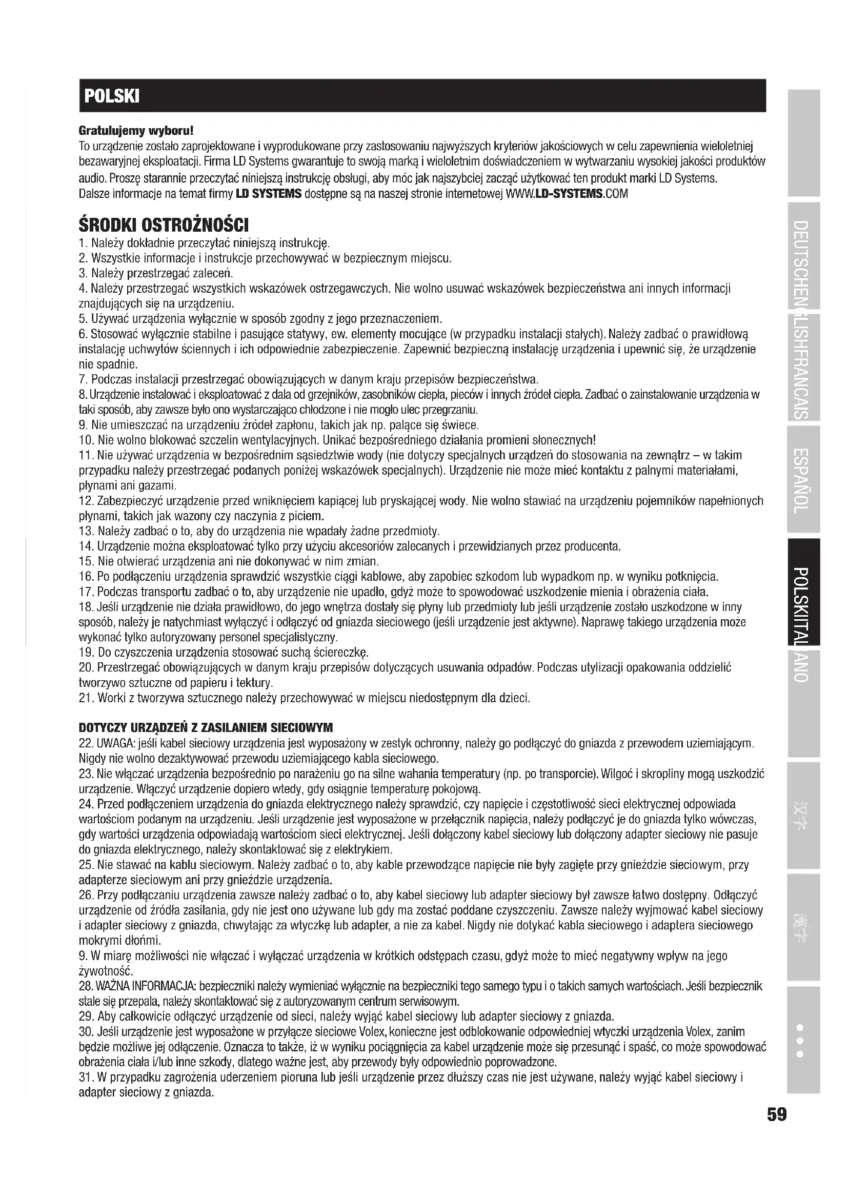 POLSKI Gratulujemy wyboru! To urządzenie zostało zaprojektowane i wyprodukowane przy zastosowaniu najwyższych kryteriów jakościowych w celu zapewnienia wieloletniej bezawaryjnej eksploatacji. Firma LD Systems gwarantuje to swoją marką i wieloletnim doświadczeniem w wytwarzaniu wysokiej jakości produktów audio. Proszę starannie przeczytać niniejszą instrukcję obsługi, aby móc jak najszybciej zacząć użytkować ten produkt marki LD Systems. Dalsze informacje na temat firmy LD SYSTEMS dostępne są na naszej stronie internetowej WWW.LD-SYSTEMS.COM