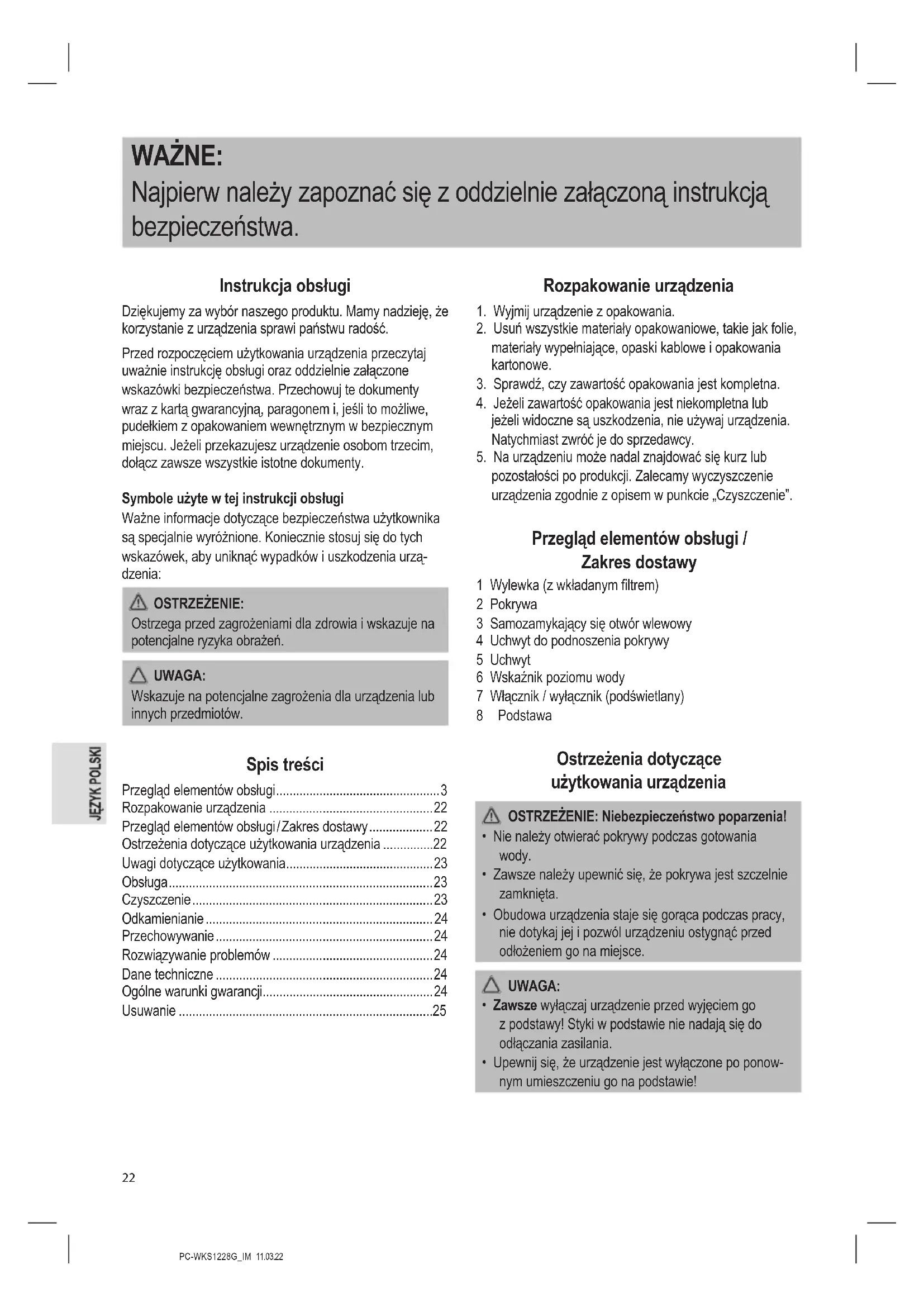 - Ostrzeżenia dotyczące użytkowania urządzenia p. 22