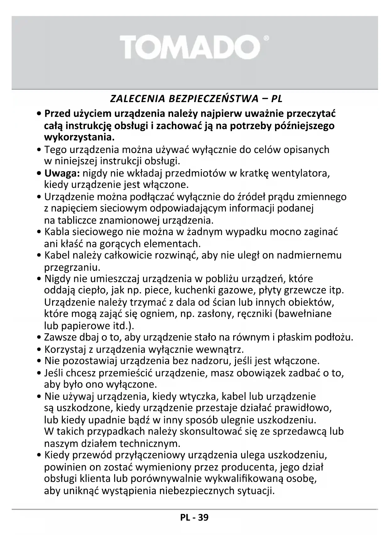TFC7503B - Wentylator Tomado - Bezpłatna instrukcja obsługi