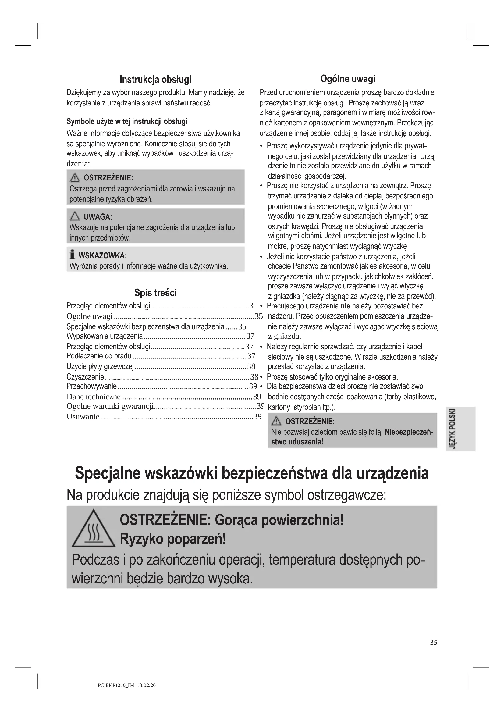 - Dla bezpieczeństwa dzieci proszę nie zostawiać swo- bodnie dostępnych części opakowania (torby plastikowe, kartony, styropian itp.). OSTRZEŻENIE: Nie pozwalaj dzieciom bawić się folią. Niebezpieczeń- stwo uduszenia! Specjalne wskazówki bezpieczeństwa dla urządzenia Na produkcie znajdują się poniższe symbol ostrzegawcze: OSTRZEŻENIE: Gorąca powierzchnia! Ryzyko poparzeń! Podczas i po zakończeniu operacji, temperatura dostępnych po- wierzchni będzie bardzo wysoka.PC-EKP1210_IM 13.02.20