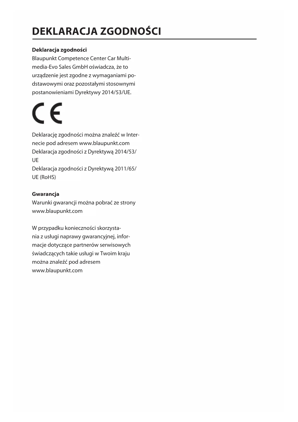 Deklaracja zgodności z Dyrektywą 2011/65/ UE (RoHS) Gwarancja Warunki gwarancji można pobrać ze strony www.blaupunkt.com W przypadku konieczności skorzysta- nia z usługi naprawy gwarancyjnej, infor- macje dotyczące partnerów serwisowych świadczących takie usługi w Twoim kraju można znaleźć pod adresem www.blaupunkt.com