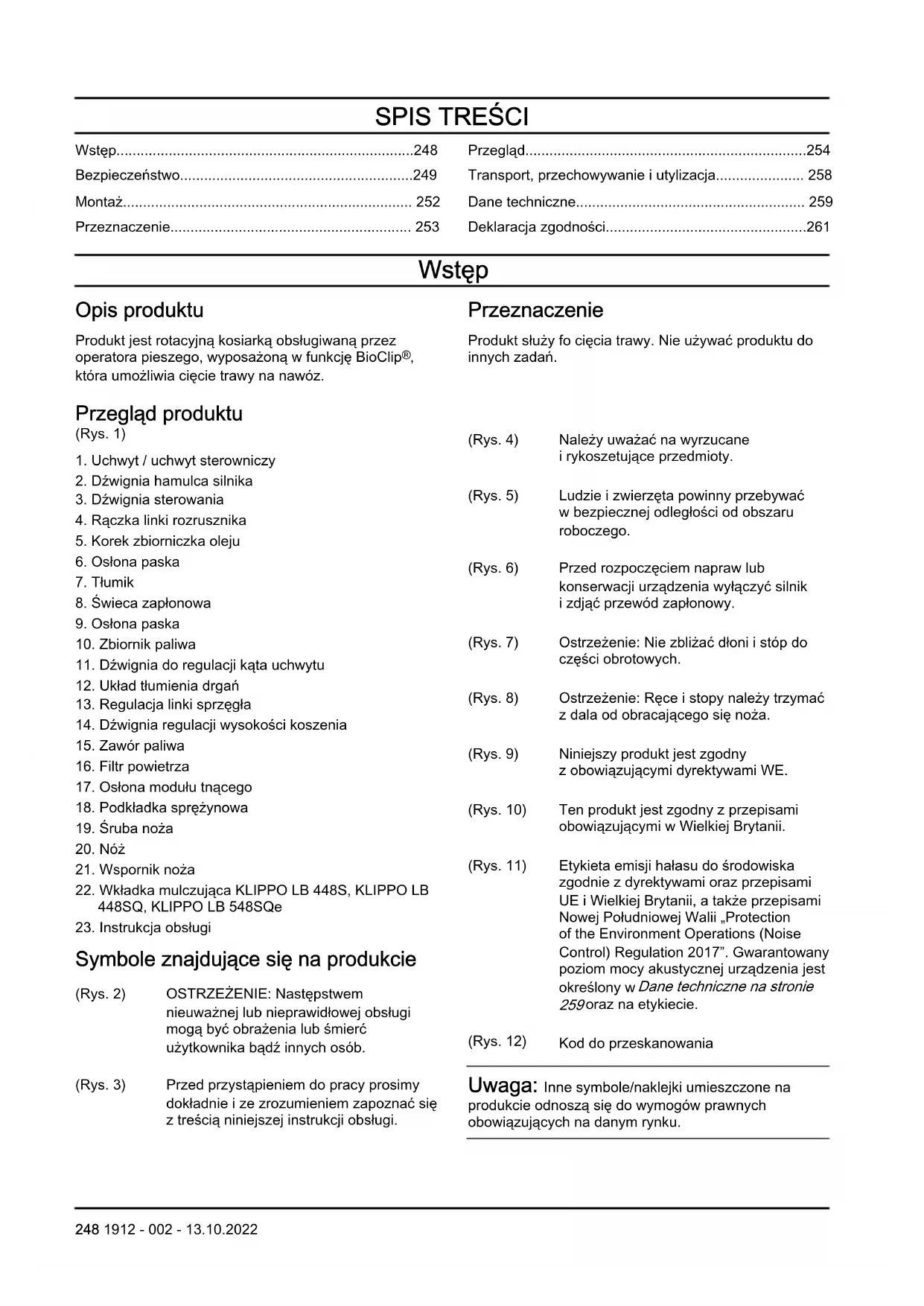 - Deklaracja zgodności Wstęp Opis produktu Produkt jest rotacyjną kosiarką obsługiwaną przez operatora pieszego, wyposażoną w funkcję BioClip p. 261