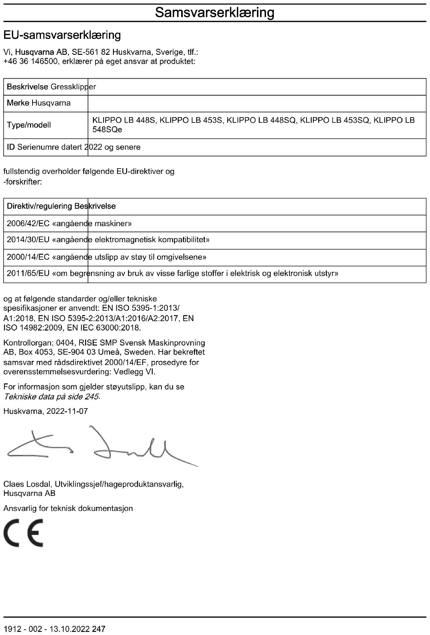 260 1912 - 002 - 13.10.2022Deklaracja zgodności Deklaracja zgodności UE Firma Husqvarna AB, SE-561 82 Huskvarna, Szwecja, tel.: +46-36-146500, deklarujemy z pełną odpowiedzialnością, że produkt: Opis Kosiarka Marka Husqvarna Typ/model KLIPPO LB 448S, KLIPPO LB 453S, KLIPPO LB 448SQ, KLIPPO LB 453SQ, KLIPPO LB 548SQe Identyfikacja Numery seryjne z roku 2022 i nowsze spełnia wszystkie wymogi określone w odpowiednich dyrektywach i przepisach UE: Dyrektywa/przepis Opis 2006/42/WE „w sprawie maszyn” 2014/30/UE „dotycząca zgodności elektromagnetycznej” 2000/14/WE „dotycząca emisji hałasu do środowiska” 2011/65/UE „dotycząca ograniczenia użycia niektórych substancji niebezpiecznych w sprzęcie elektrycz- nym i elektronicznym” oraz został zaprojektowany zgodnie z następującymi normami i specyfikacjami technicznymi: EN ISO