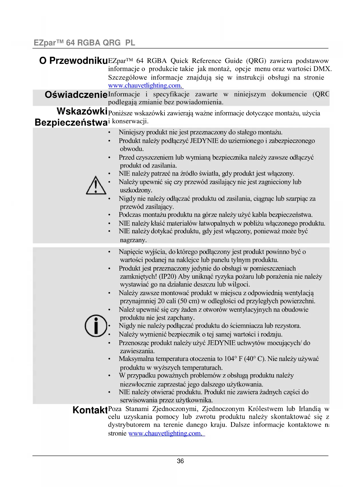 - NIE należy otwierać produktu. Produkt nie zawiera żadnych części do serwisowania przez użytkownika. Kontakt Poza Stanami Zjednoczonymi, Zjednoczonym Królestwem lub Irlandią w celu uzyskania pomocy lub zwrotu produktu należy skontaktować się z dystrybutorem na terenie danego kraju. Dalsze informacje kontaktowe na stronie www.chauvetlighting.com.PL EZpar™ 64 RGBA QRG
