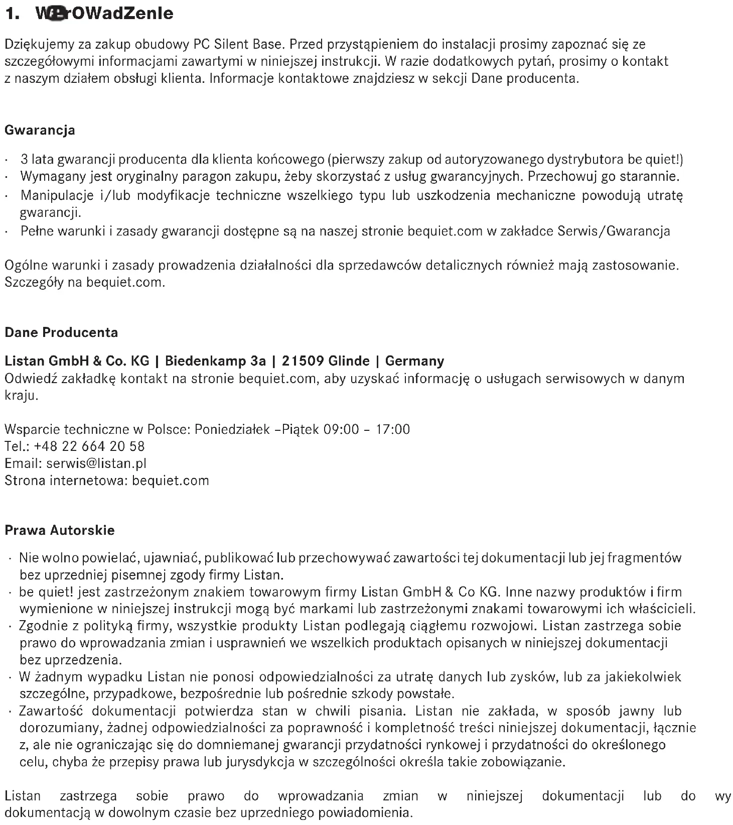 DziękujemyzazakupobudowyPCSilentBase.Przedprzystąpieniemdoinstalacjiprosimyzapoznaćsięze szczegółowymiinformacjamizawartymiwniniejszejinstrukcji.Wraziedodatkowychpytań,prosimyokontakt znaszymdziałemobsługiklienta.InformacjekontaktoweznajdzieszwsekcjiDaneproducenta. Gwarancja ∙ 3latagwarancjiproducentadlaklientakońcowego(pierwszyzakupodautoryzowanegodystrybutorabequiet!) ∙ Wymaganyjestoryginalnyparagonzakupu,żebyskorzystaćzusługgwarancyjnych.Przechowujgostarannie. ∙ Manipulacje i/lub modykacje techniczne wszelkiego typu lub uszkodzenia mechaniczne powodują utratę gwarancji. ∙ Pełnewarunkiizasadygwarancjidostępnesąnanaszejstroniebequiet.comwzakładceSerwis/Gwarancja Ogólnewarunkiizasadyprowadzeniadziałalnościdlasprzedawcówdetalicznychrównieżmajązastosowanie. Szczegółynabequiet.com. Dane Producenta Listan GmbH & Co. KG | Biedenkamp 3a | 21509 Glinde | Germany Odwiedźzakładkękontaktnastroniebequiet.com,abyuzyskaćinformacjęousługachserwisowychwdanym kraju. WsparcietechnicznewPolsce:Poniedziałek–Piątek09:00–17:00 Tel.: +48 22 664 20 58 Email: serwis@listan.pl Strona internetowa: bequiet.com Prawa Autorskie ∙ Niewolnopowielać,ujawniać,publikowaćlubprzechowywaćzawartościtejdokumentacjilubjejfragmentów bezuprzedniejpisemnejzgodyrmyListan. ∙ bequiet!jestzastrzeżonymznakiemtowarowymrmyListanGmbH&CoKG.Innenazwyproduktówirm wymienionewniniejszejinstrukcjimogąbyćmarkamilubzastrzeżonymiznakamitowarowymiichwłaścicieli. ∙ Zgodniezpolitykąrmy,wszystkieproduktyListanpodlegająciągłemurozwojowi.Listanzastrzegasobie prawodowprowadzaniazmianiusprawnieńwewszelkichproduktachopisanychwniniejszejdokumentacji bez uprzedzenia. ∙ WżadnymwypadkuListannieponosiodpowiedzialnościzautratędanychlubzysków,lubzajakiekolwiek szczególne,przypadkowe,bezpośrednielubpośrednieszkodypowstałe. ∙ Zawartość dokumentacji potwierdza stan w chwili pisania. Listan nie zakłada, w sposób jawny lub dorozumiany,żadnejodpowiedzialnościzapoprawnośćikompletnośćtreścininiejszejdokumentacji,łącznie z,alenieograniczającsiędodomniemanejgwarancjiprzydatnościrynkowejiprzydatnościdookreślonego celu,chybażeprzepisyprawalubjurysdykcjawszczególnościokreślatakiezobowiązanie. Listan zastrzega sobie prawo do wprowadzania zmian w niniejszej dokumentacji lub do wycofania się z dokumentacjąwdowolnymczasiebezuprzedniegopowiadomienia.20 21