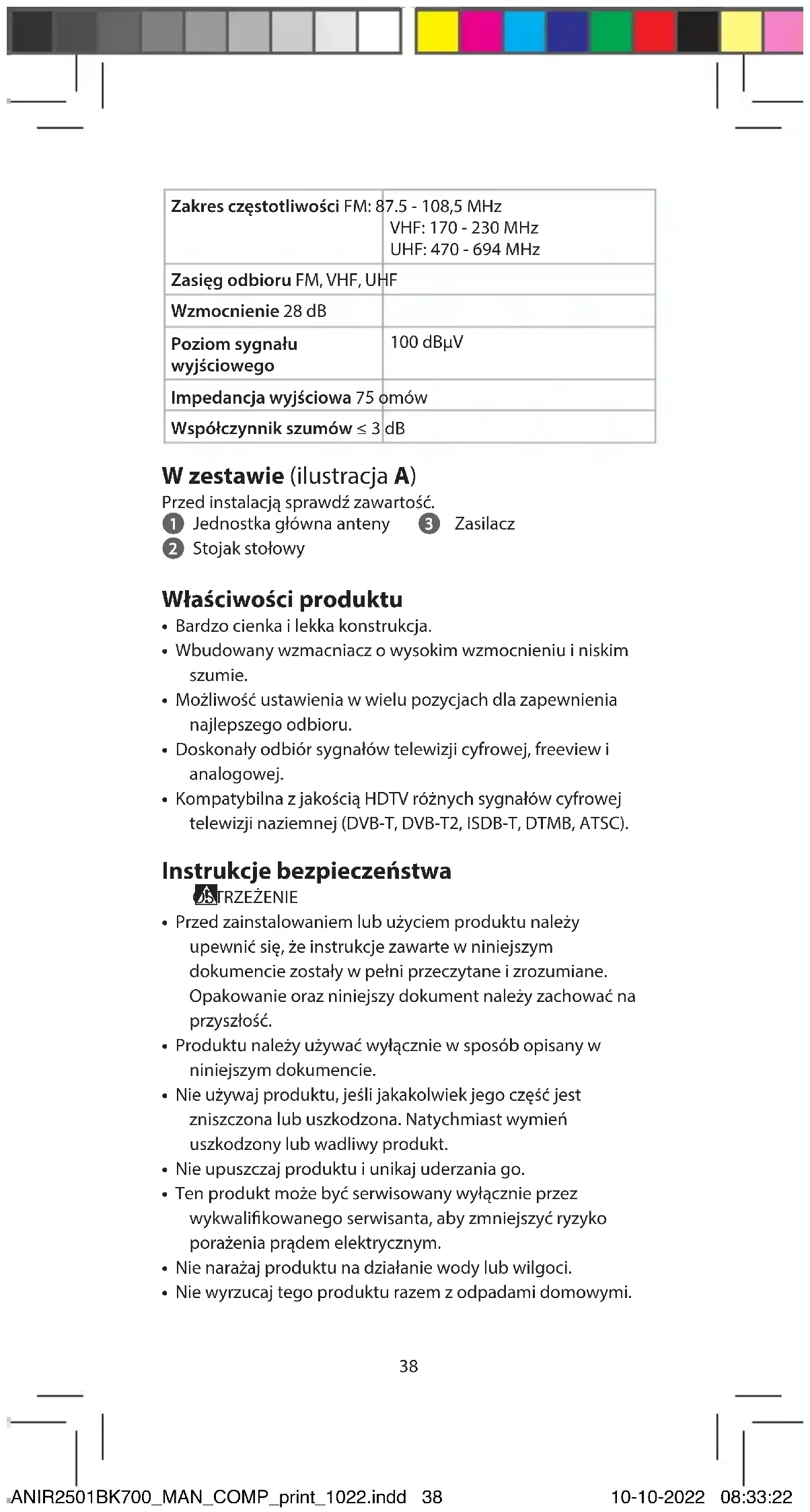 Przewodnik Szybki start Pokojowa antena telewizyjna ANIR2501BK700 Przeznaczenie Produkt jest anteną, którą można stosować z telewizorem lub dekoderem, który obsługuje zasilanie kablem koncentrycznym. Jest to antena zaprojektowana specjalnie do odbioru naziemnej telewizji cyfrowej. Produkt jest przeznaczony wyłącznie do użytku wewnątrz pomieszczeń. Dane techniczne Produkt Pokojowa antena telewizyjna Numer katalogowy ANIR2501BK700 Moc wejściowa Zasilacz AC/DC: 5.0 VDC ; 200 mA Dekoder DTV: 5.0 VDC ; 40 mA ANIR2501BK700_MAN_COMP_print_1022.indd 37ANIR2501BK700_MAN_COMP_print_1022.indd 37 10-10-2022 08:33:2210-10-2022 08:33:2238 Zakres częstotliwości FM: 87.5 - 108,5 MHz VHF: 170 - 230 MHz UHF: 470 - 694 MHz Zasięg odbioru FM, VHF, UHF Wzmocnienie 28 dB Poziom sygnału wyjściowego 100 dBµV Impedancja wyjściowa 75 omów Współczynnik szumów ≤ 3 dB W zestawie (ilustracja A) Przed instalacją sprawdź zawartość. 1 Jednostka główna anteny 2 Stojak stołowy 3 Zasilacz Właściwości produktu