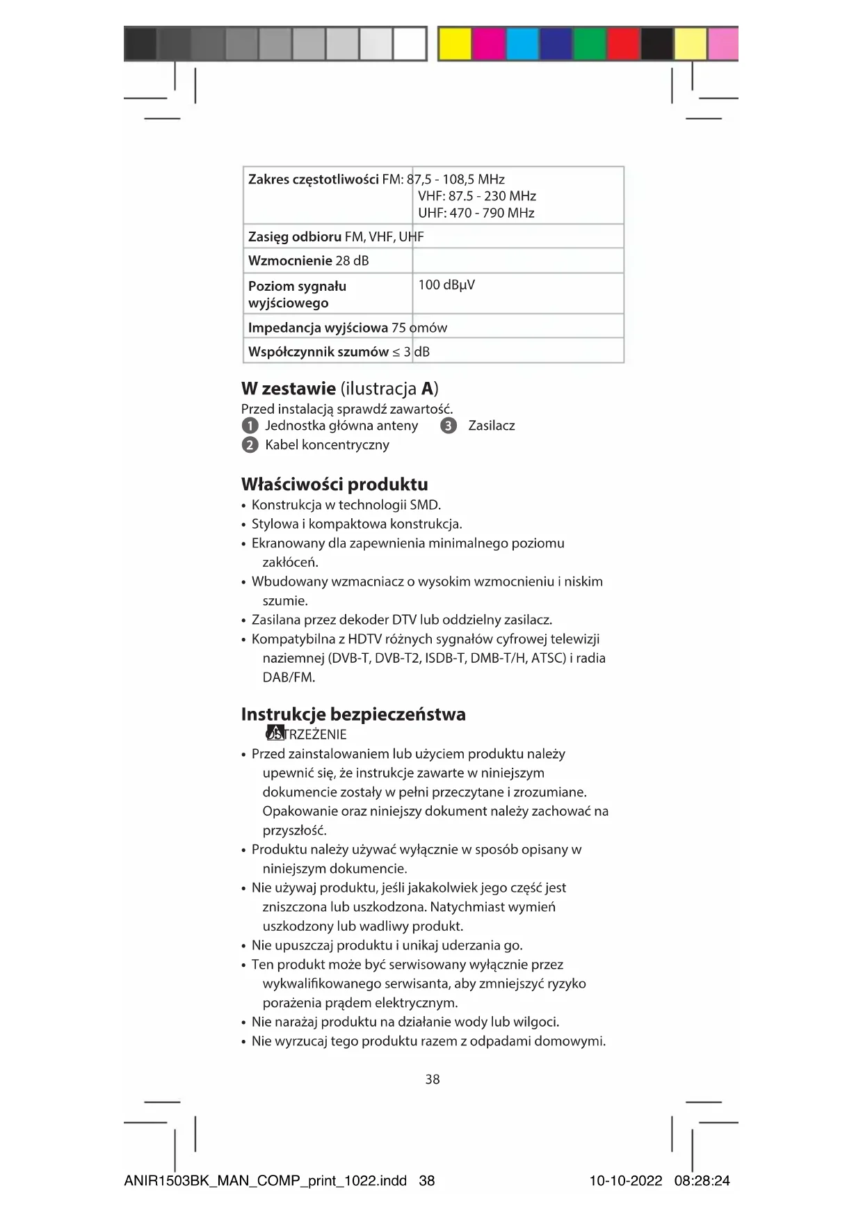 Przewodnik Szybki start Pokojowa antena telewizyjna ANIR1503BK Przeznaczenie Produkt jest anteną, którą można stosować z telewizorem lub dekoderem, który obsługuje zasilanie kablem koncentrycznym. Jest to antena zaprojektowana specjalnie do odbioru naziemnej telewizji cyfrowej. Produkt jest przeznaczony wyłącznie do użytku wewnątrz pomieszczeń. Dane techniczne Produkt Pokojowa antena telewizyjna Numer katalogowy ANIR1503BK Moc wejściowa Zasilacz AC/DC: 5.0 VDC ; 200 mA Dekoder DTV: 5.0 VDC ; 40 mA ANIR1503BK_MAN_COMP_print_1022.indd 37ANIR1503BK_MAN_COMP_print_1022.indd 37 10-10-2022 08:28:2410-10-2022 08:28:2438 Zakres częstotliwości FM: 87,5 - 108,5 MHz VHF: 87.5 - 230 MHz UHF: 470 - 790 MHz Zasięg odbioru FM, VHF, UHF Wzmocnienie 28 dB Poziom sygnału wyjściowego 100 dBµV Impedancja wyjściowa 75 omów Współczynnik szumów ≤ 3 dB W zestawie (ilustracja A) Przed instalacją sprawdź zawartość. 1 Jednostka główna anteny 2 Kabel koncentryczny 3 Zasilacz Właściwości produktu