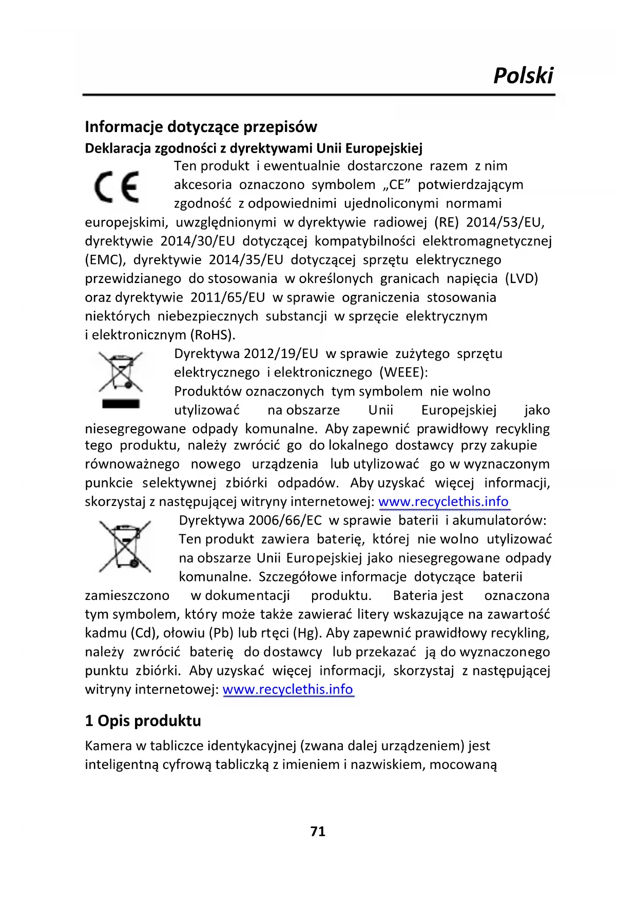 Informacje dotyczące przepisów Deklaracja zgodności z dyrektywami Unii Europejskiej Ten produkt i ewentualnie dostarczone razem z nim akcesoria oznaczono symbolem „CE” potwierdzającym zgodność z odpowiednimi ujednoliconymi normami europejskimi, uwzględnionymi w dyrektywie radiowej (RE) 2014/53/EU, dyrektywie 2014/30/EU dotyczącej kompatybilności elektromagnetycznej (EMC), dyrektywie 2014/35/EU dotyczącej sprzętu elektrycznego przewidzianego do stosowania w określonych granicach napięcia (LVD) oraz dyrektywie 2011/65/EU w sprawie ograniczenia stosowania niektórych niebezpiecznych substancji w sprzęcie elektrycznym i elektronicznym (RoHS). Dyrektywa 2012/19/EU w sprawie zużytego sprzętu elektrycznego i elektronicznego (WEEE): Produktów oznaczonych tym symbolem nie wolno utylizować na obszarze Unii Europejskiej jako niesegregowane odpady komunalne. Aby zapewnić prawidłowy recykling tego produktu, należy zwrócić go do lokalnego dostawcy przy zakupie równoważnego nowego urządzenia lub utylizować go w wyznaczonym punkcie selektywnej zbiórki odpadów. Aby uzyskać więcej informacji, skorzystaj z następującej witryny internetowej: www.recyclethis.info Dyrektywa 2006/66/EC w sprawie baterii i akumulatorów: Ten produkt zawiera baterię, której nie wolno utylizować na obszarze Unii Europejskiej jako niesegregowane odpady komunalne. Szczegółowe informacje dotyczące baterii zamieszczono w dokumentacji produktu. Bateria jest oznaczona tym symbolem, który może także zawierać litery wskazujące na zawartość kadmu (Cd), ołowiu (Pb) lub rtęci (Hg). Aby zapewnić prawidłowy recykling, należy zwrócić baterię do dostawcy lub przekazać ją do wyznaczonego punktu zbiórki. Aby uzyskać więcej informacji, skorzystaj z następującej witryny internetowej: www.recyclethis.info 1 Opis produktu Kamera w tabliczce identyfikacyjnej (zwana dalej urządzeniem) jest inteligentną cyfrową tabliczką z imieniem i nazwiskiem, mocowanąPolski