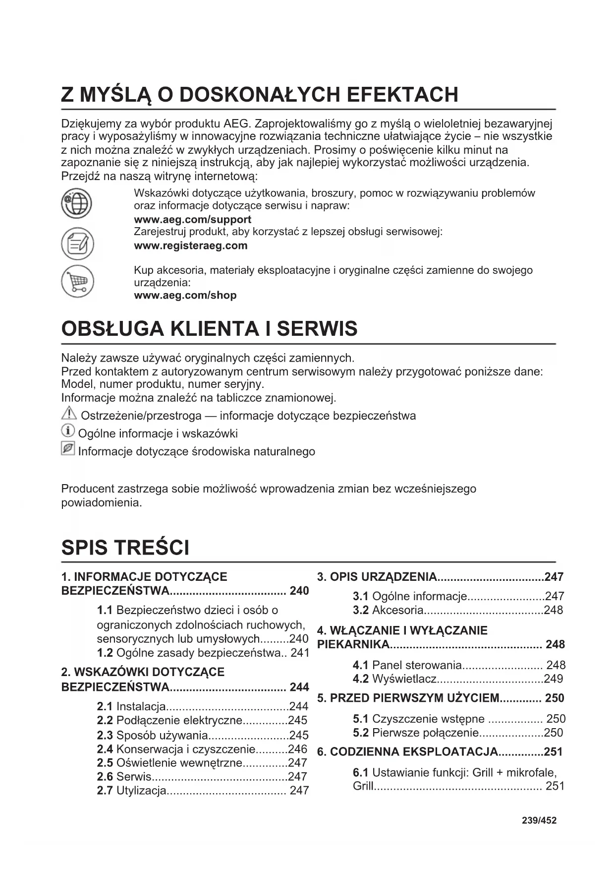 Riciclare i materiali con il simbolo . Buttare l'imballaggio negli appositi contenitori per il riciclaggio. Aiutare a proteggere l’ambiente e la salute umana e a riciclare rifiuti derivanti da apparecchiature elettriche ed elettroniche. Non smaltire le apparecchiature che riportano il simbolo insieme ai normali rifiuti domestici. Portare il prodotto al punto di riciclaggio più vicino o contattare il comune di residenza. 238/452 È SEMPLICE!Z MYŚLĄ O DOSKONAŁYCH EFEKTACH Dziękujemy za wybór produktu AEG. Zaprojektowaliśmy go z myślą o wieloletniej bezawaryjnej pracy i wyposażyliśmy w innowacyjne rozwiązania techniczne ułatwiające życie – nie wszystkie z nich można znaleźć w zwykłych urządzeniach. Prosimy o poświęcenie kilku minut na zapoznanie się z niniejszą instrukcją, aby jak najlepiej wykorzystać możliwości urządzenia. Przejdź na naszą witrynę internetową: Wskazówki dotyczące użytkowania, broszury, pomoc w rozwiązywaniu problemów oraz informacje dotyczące serwisu i napraw: www.aeg.com/support Zarejestruj produkt, aby korzystać z lepszej obsługi serwisowej: www.registeraeg.com Kup akcesoria, materiały eksploatacyjne i oryginalne części zamienne do swojego urządzenia: www.aeg.com/shop