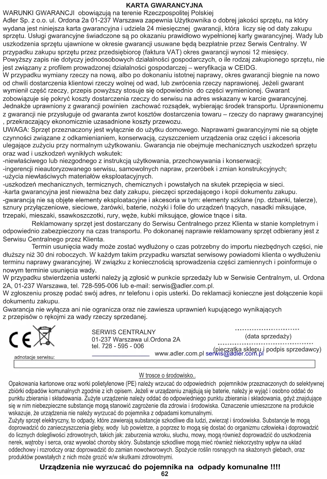 ﺪﯾﺪﮭﺗ تﺎﻧﻮﻜﻤﻟا ﻞﻜﺸﺗ ﺪﻗ زﺎﮭﺠﻟا ﻲﻓ تﺎﯾرﺎﻄﺑ كﺎﻨھ نﺎﻛ اذإ .ﺎﮭﻣاﺪﺨﺘﺳاو ﺎﮭﻣاﺪﺨﺘﺳا ةدﺎﻋإ ،.ﻞﺼﻔﻨﻣ ﻞﻜﺸﺑ ﺔﻧﺰﺨﻤﻟا ﺔﻄﻘﻨﻟا ﻰﻟإ ﺎﮭﺋﺎﻄﻋإو ﺎﮭﺟاﺮﺧإ ﻚﯿﻠﻌﻓ62 Adler Sp. z o.o. ul. Ordona 2a 01-237 Warszawa zapewnia Użytkownika o dobrej jakości sprzętu, na który wydana jest niniejsza karta gwarancyjna i udziela 24 miesięcznej gwarancji, która liczy się od daty zakupu sprzętu. Usługi gwarancyjne świadczone są po okazaniu prawidłowo wypełnionej karty gwarancyjnej. Wady lub uszkodzenia sprzętu ujawnione w okresie gwarancji usuwane będą bezpłatnie przez Serwis Centralny. W przypadku zakupu sprzętu przez przedsiębiorcę (faktura VAT) okres gwarancji wynosi 12 miesięcy. Powyższy zapis nie dotyczy jednoosobowych działalności gospodarczych, o ile rodzaj zakupionego sprzętu, nie jest związany z profilem prowadzonej działalności gospodarczej – weryfikacja w CEIDG. -niewłaściwego lub niezgodnego z instrukcją użytkowania, przechowywania i konserwacji; Reklamowany sprzęt jest dostarczany do Serwisu Centralnego przez Klienta w stanie kompletnym i odpowiednio zabezpieczony na czas transportu. Po dokonanej naprawie reklamowany sprzęt odbierany jest z Serwisu Centralnego przez Klienta. -karta gwarancyjna jest nieważna bez daty zakupu, pieczęci sprzedającego i kopii dokumentu zakupu. -gwarancją nie są objęte elementy eksploatacyjne i akcesoria w tym: elementy szklane (np. dzbanki, talerze), sznury przyłączeniowe, sieciowe, żarówki, baterie, nożyki i folie do urządzeń tnących, nasadki miksujące, trzepaki, mieszaki, ssawkoszczotki, rury, węże, kubki miksujące, głowice tnące i sita. KARTA GWARANCYJNA WARUNKI GWARANCJI obowiązują na terenie Rzeczpospolitej Polskiej UWAGA: Sprzęt przeznaczony jest wyłącznie do użytku domowego. Naprawami gwarancyjnymi nie są objęte czynności związane z odkamienianiem, konserwacją, czyszczeniem urządzenia oraz części i akcesoria ulegające zużyciu przy normalnym użytkowaniu. Gwarancja nie obejmuje mechanicznych uszkodzeń sprzętu oraz wad i uszkodzeń wynikłych wskutek: -ingerencji nieautoryzowanego serwisu, samowolnych napraw, przeróbek i zmian konstrukcyjnych; -użycia niewłaściwych materiałów eksploatacyjnych. W przypadku stwierdzenia usterki należy ją zgłosić w punkcie sprzedaży lub w Serwisie Centralnym, ul. Ordona 2A, 01-237 Warszawa, tel. 728-595-006 lub e-mail: serwis@adler.com.pl. -uszkodzeń mechanicznych, termicznych, chemicznych i powstałych na skutek przepięcia w sieci. W zgłoszeniu proszę podać swój adres, nr telefonu i opis usterki. Do reklamacji konieczne jest dołączenie kopii dokumentu zakupu. Gwarancja nie wyłącza ani nie ogranicza oraz nie zawiesza uprawnień kupującego wynikających W przypadku wymiany rzeczy na nową, albo po dokonaniu istotnej naprawy, okres gwarancji biegnie na nowo od chwili dostarczenia klientowi rzeczy wolnej od wad, lub zwrócenia rzeczy naprawionej. Jeżeli gwarant wymienił część rzeczy, przepis powyższy stosuje się odpowiednio do części wymienionej. Gwarant zobowiązuje się pokryć koszty dostarczenia rzeczy do serwisu na adres wskazany w karcie gwarancyjnej. Jednakże uprawniony z gwarancji powinien zachować rozsądek, wybierając środek transportu. Uprawnionemu z gwarancji nie przysługuje od gwaranta zwrot kosztów dostarczenia towaru – rzeczy do naprawy gwarancyjnej , przekraczający ekonomicznie uzasadnione koszty przewozu. z przepisów o rękojmi za wady rzeczy sprzedanej. Termin usunięcia wady może zostać wydłużony o czas potrzebny do importu niezbędnych części, nie dłuższy niż 30 dni roboczych. W każdym takim przypadku warsztat serwisowy powiadomi klienta o wydłużeniu terminu naprawy gwarancyjnej. W związku z koniecznością sprowadzenia części zamiennych i poinformuje o nowym terminie usunięcia wady. SERWIS CENTRALNY 01-237 Warszawa ul.Ordona 2A tel. 728 - 595 - 006 www.adler.com.pl serwis@adler.com.pl (data sprzedaży) (pieczątka sklepu i podpis sprzedawcy) adnotacje serwisu: Urządzenia nie wyrzucać do pojemnika na odpady komunalne !!!! W trosce o środowisko.. Opakowania kartonowe oraz worki polietylenowe (PE) należy wrzucać do odpowiednich pojemników przeznaczonych do selektywnej zbiórki odpadów komunalnych zgodnie z ich opisem. Jeżeli w urządzeniu znajdują się baterie, należy je wyjąć i osobno oddać do punktu zbierania i składowania. Zużyte urządzenie należy oddać do odpowiedniego punktu zbierania i składowania, gdyż znajdujące się w nim niebezpieczne substancje mogą stanowić zagrożenie dla zdrowia i środowiska. Oznaczenie umieszczone na produkcie wskazuje, że urządzenia nie należy wyrzucać do pojemnika z odpadami komunalnymi. Zużyty sprzęt elektryczny, to odpady, które zawierają substancje szkodliwe dla ludzi, zwierząt i środowiska. Substancje te mogą doprowadzić do zanieczyszczenia gleby, wody lub powietrze, a poprzez to mogą się dostać do organizmu człowieka i doprowadzić do licznych dolegliwości zdrowotnych, takich jak: zaburzenia wzroku, słuchu, mowy, mogą również doprowadzić do uszkodzenia nerek, wątroby i serca, oraz wywołać choroby skóry. Substancje szkodliwe mogą mieć również niekorzystny wpływ na układ oddechowy i rozrodczy oraz doprowadzić do zamian nowotworowych. Spożycie roślin rosnących na skażonych glebach, oraz produktów powstałych z nich może grozić w/w skutkami zdrowotnymi.63 POLSKI