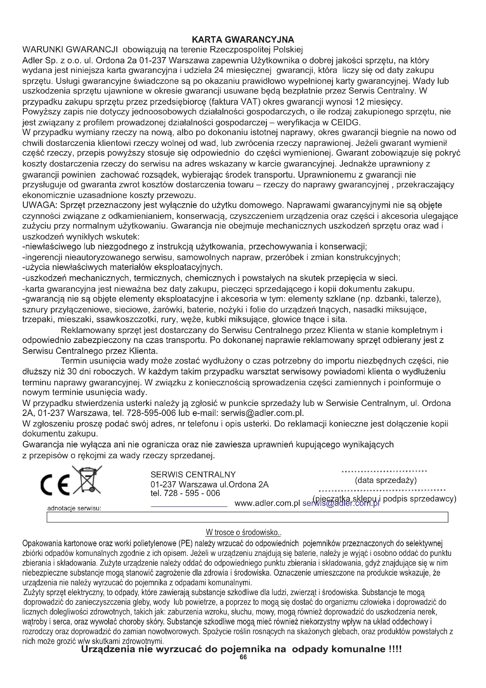 За да защитите околната си среда: моля, отделете картонените кутии и найлоновите торбички и ги изхвърлете в съответните кошчета за отпадъци. Използваният уред трябва да бъде доставен до специалните пунктове за събиране, които могат да повлияят на околната среда. Не изхвърляйте този уред в обикновен кош за отпадъци.66 KARTA GWARANCYJNA WARUNKI GWARANCJI obowiązują na terenie Rzeczpospolitej Polskiej Adler Sp. z o.o. ul. Ordona 2a 01-237 Warszawa zapewnia Użytkownika o dobrej jakości sprzętu, na który wydana jest niniejsza karta gwarancyjna i udziela 24 miesięcznej gwarancji, która liczy się od daty zakupu sprzętu. Usługi gwarancyjne świadczone są po okazaniu prawidłowo wypełnionej karty gwarancyjnej. Wady lub uszkodzenia sprzętu ujawnione w okresie gwarancji usuwane będą bezpłatnie przez Serwis Centralny. W przypadku zakupu sprzętu przez przedsiębiorcę (faktura VAT) okres gwarancji wynosi 12 miesięcy. Powyższy zapis nie dotyczy jednoosobowych działalności gospodarczych, o ile rodzaj zakupionego sprzętu, nie jest związany z profilem prowadzonej działalności gospodarczej – weryfikacja w CEIDG. -ingerencji nieautoryzowanego serwisu, samowolnych napraw, przeróbek i zmian konstrukcyjnych; -niewłaściwego lub niezgodnego z instrukcją użytkowania, przechowywania i konserwacji; Termin usunięcia wady może zostać wydłużony o czas potrzebny do importu niezbędnych części, nie dłuższy niż 30 dni roboczych. W każdym takim przypadku warsztat serwisowy powiadomi klienta o wydłużeniu terminu naprawy gwarancyjnej. W związku z koniecznością sprowadzenia części zamiennych i poinformuje o nowym terminie usunięcia wady. UWAGA: Sprzęt przeznaczony jest wyłącznie do użytku domowego. Naprawami gwarancyjnymi nie są objęte czynności związane z odkamienianiem, konserwacją, czyszczeniem urządzenia oraz części i akcesoria ulegające zużyciu przy normalnym użytkowaniu. Gwarancja nie obejmuje mechanicznych uszkodzeń sprzętu oraz wad i uszkodzeń wynikłych wskutek: W zgłoszeniu proszę podać swój adres, nr telefonu i opis usterki. Do reklamacji konieczne jest dołączenie kopii dokumentu zakupu. Reklamowany sprzęt jest dostarczany do Serwisu Centralnego przez Klienta w stanie kompletnym i odpowiednio zabezpieczony na czas transportu. Po dokonanej naprawie reklamowany sprzęt odbierany jest z Serwisu Centralnego przez Klienta. W przypadku stwierdzenia usterki należy ją zgłosić w punkcie sprzedaży lub w Serwisie Centralnym, ul. Ordona 2A, 01-237 Warszawa, tel. 728-595-006 lub e-mail: serwis@adler.com.pl. Gwarancja nie wyłącza ani nie ogranicza oraz nie zawiesza uprawnień kupującego wynikających W przypadku wymiany rzeczy na nową, albo po dokonaniu istotnej naprawy, okres gwarancji biegnie na nowo od chwili dostarczenia klientowi rzeczy wolnej od wad, lub zwrócenia rzeczy naprawionej. Jeżeli gwarant wymienił część rzeczy, przepis powyższy stosuje się odpowiednio do części wymienionej. Gwarant zobowiązuje się pokryć koszty dostarczenia rzeczy do serwisu na adres wskazany w karcie gwarancyjnej. Jednakże uprawniony z gwarancji powinien zachować rozsądek, wybierając środek transportu. Uprawnionemu z gwarancji nie przysługuje od gwaranta zwrot kosztów dostarczenia towaru – rzeczy do naprawy gwarancyjnej , przekraczający ekonomicznie uzasadnione koszty przewozu. -gwarancją nie są objęte elementy eksploatacyjne i akcesoria w tym: elementy szklane (np. dzbanki, talerze), sznury przyłączeniowe, sieciowe, żarówki, baterie, nożyki i folie do urządzeń tnących, nasadki miksujące, trzepaki, mieszaki, ssawkoszczotki, rury, węże, kubki miksujące, głowice tnące i sita. -karta gwarancyjna jest nieważna bez daty zakupu, pieczęci sprzedającego i kopii dokumentu zakupu. -użycia niewłaściwych materiałów eksploatacyjnych. -uszkodzeń mechanicznych, termicznych, chemicznych i powstałych na skutek przepięcia w sieci. z przepisów o rękojmi za wady rzeczy sprzedanej. SERWIS CENTRALNY 01-237 Warszawa ul.Ordona 2A tel. 728 - 595 - 006 www.adler.com.pl serwis@adler.com.pl (data sprzedaży) (pieczątka sklepu i podpis sprzedawcy) adnotacje serwisu: Urządzenia nie wyrzucać do pojemnika na odpady komunalne !!!! Zużyty sprzęt elektryczny, to odpady, które zawierają substancje szkodliwe dla ludzi, zwierząt i środowiska. Substancje te mogą doprowadzić do zanieczyszczenia gleby, wody lub powietrze, a poprzez to mogą się dostać do organizmu człowieka i doprowadzić do licznych dolegliwości zdrowotnych, takich jak: zaburzenia wzroku, słuchu, mowy, mogą również doprowadzić do uszkodzenia nerek, wątroby i serca, oraz wywołać choroby skóry. Substancje szkodliwe mogą mieć również niekorzystny wpływ na układ oddechowy i rozrodczy oraz doprowadzić do zamian nowotworowych. Spożycie roślin rosnących na skażonych glebach, oraz produktów powstałych z nich może grozić w/w skutkami zdrowotnymi. Opakowania kartonowe oraz worki polietylenowe (PE) należy wrzucać do odpowiednich pojemników przeznaczonych do selektywnej zbiórki odpadów komunalnych zgodnie z ich opisem. Jeżeli w urządzeniu znajdują się baterie, należy je wyjąć i osobno oddać do punktu zbierania i składowania. Zużyte urządzenie należy oddać do odpowiedniego punktu zbierania i składowania, gdyż znajdujące się w nim niebezpieczne substancje mogą stanowić zagrożenie dla zdrowia i środowiska. Oznaczenie umieszczone na produkcie wskazuje, że urządzenia nie należy wyrzucać do pojemnika z odpadami komunalnymi. W trosce o środowisko..67 (PL) POLSKI
