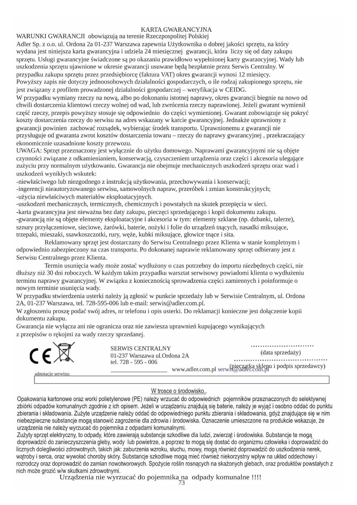 KARTA GWARANCYJNA Adler Sp. z o.o. ul. Ordona 2a 01-237 Warszawa zapewnia Użytkownika o dobrej jakości sprzętu, na który wydana jest niniejsza karta gwarancyjna i udziela 24 miesięcznej gwarancji, która liczy się od daty zakupu sprzętu. Usługi gwarancyjne świadczone są po okazaniu prawidłowo wypełnionej karty gwarancyjnej. Wady lub uszkodzenia sprzętu ujawnione w okresie gwarancji usuwane będą bezpłatnie przez Serwis Centralny. W przypadku zakupu sprzętu przez przedsiębiorcę (faktura VAT) okres gwarancji wynosi 12 miesięcy. W przypadku wymiany rzeczy na nową, albo po dokonaniu istotnej naprawy, okres gwarancji biegnie na nowo od chwili dostarczenia klientowi rzeczy wolnej od wad, lub zwrócenia rzeczy naprawionej. Jeżeli gwarant wymienił część rzeczy, przepis powyższy stosuje się odpowiednio do części wymienionej. Gwarant zobowiązuje się pokryć koszty dostarczenia rzeczy do serwisu na adres wskazany w karcie gwarancyjnej. Jednakże uprawniony z gwarancji powinien zachować rozsądek, wybierając środek transportu. Uprawnionemu z gwarancji nie przysługuje od gwaranta zwrot kosztów dostarczenia towaru – rzeczy do naprawy gwarancyjnej , przekraczający ekonomicznie uzasadnione koszty przewozu. -ingerencji nieautoryzowanego serwisu, samowolnych napraw, przeróbek i zmian konstrukcyjnych; -użycia niewłaściwych materiałów eksploatacyjnych. UWAGA: Sprzęt przeznaczony jest wyłącznie do użytku domowego. Naprawami gwarancyjnymi nie są objęte czynności związane z odkamienianiem, konserwacją, czyszczeniem urządzenia oraz części i akcesoria ulegające zużyciu przy normalnym użytkowaniu. Gwarancja nie obejmuje mechanicznych uszkodzeń sprzętu oraz wad i uszkodzeń wynikłych wskutek: -karta gwarancyjna jest nieważna bez daty zakupu, pieczęci sprzedającego i kopii dokumentu zakupu. WARUNKI GWARANCJI obowiązują na terenie Rzeczpospolitej Polskiej Powyższy zapis nie dotyczy jednoosobowych działalności gospodarczych, o ile rodzaj zakupionego sprzętu, nie jest związany z profilem prowadzonej działalności gospodarczej – weryfikacja w CEIDG. -niewłaściwego lub niezgodnego z instrukcją użytkowania, przechowywania i konserwacji; -uszkodzeń mechanicznych, termicznych, chemicznych i powstałych na skutek przepięcia w sieci. -gwarancją nie są objęte elementy eksploatacyjne i akcesoria w tym: elementy szklane (np. dzbanki, talerze), sznury przyłączeniowe, sieciowe, żarówki, baterie, nożyki i folie do urządzeń tnących, nasadki miksujące, trzepaki, mieszaki, ssawkoszczotki, rury, węże, kubki miksujące, głowice tnące i sita. W przypadku stwierdzenia usterki należy ją zgłosić w punkcie sprzedaży lub w Serwisie Centralnym, ul. Ordona 2A, 01-237 Warszawa, tel. 728-595-006 lub e-mail: serwis@adler.com.pl. W zgłoszeniu proszę podać swój adres, nr telefonu i opis usterki. Do reklamacji konieczne jest dołączenie kopii dokumentu zakupu. Reklamowany sprzęt jest dostarczany do Serwisu Centralnego przez Klienta w stanie kompletnym i odpowiednio zabezpieczony na czas transportu. Po dokonanej naprawie reklamowany sprzęt odbierany jest z Serwisu Centralnego przez Klienta. Termin usunięcia wady może zostać wydłużony o czas potrzebny do importu niezbędnych części, nie dłuższy niż 30 dni roboczych. W każdym takim przypadku warsztat serwisowy powiadomi klienta o wydłużeniu terminu naprawy gwarancyjnej. W związku z koniecznością sprowadzenia części zamiennych i poinformuje o nowym terminie usunięcia wady. z przepisów o rękojmi za wady rzeczy sprzedanej. Gwarancja nie wyłącza ani nie ogranicza oraz nie zawiesza uprawnień kupującego wynikających SERWIS CENTRALNY 01-237 Warszawa ul.Ordona 2A tel. 728 - 595 - 006 www.adler.com.pl serwis@adler.com.pl (data sprzedaży) (pieczątka sklepu i podpis sprzedawcy) adnotacje serwisu: Urządzenia nie wyrzucać do pojemnika na odpady komunalne !!!! Opakowania kartonowe oraz worki polietylenowe (PE) należy wrzucać do odpowiednich pojemników przeznaczonych do selektywnej zbiórki odpadów komunalnych zgodnie z ich opisem. Jeżeli w urządzeniu znajdują się baterie, należy je wyjąć i osobno oddać do punktu zbierania i składowania. Zużyte urządzenie należy oddać do odpowiedniego punktu zbierania i składowania, gdyż znajdujące się w nim niebezpieczne substancje mogą stanowić zagrożenie dla zdrowia i środowiska. Oznaczenie umieszczone na produkcie wskazuje, że urządzenia nie należy wyrzucać do pojemnika z odpadami komunalnymi. Zużyty sprzęt elektryczny, to odpady, które zawierają substancje szkodliwe dla ludzi, zwierząt i środowiska. Substancje te mogą doprowadzić do zanieczyszczenia gleby, wody lub powietrze, a poprzez to mogą się dostać do organizmu człowieka i doprowadzić do licznych dolegliwości zdrowotnych, takich jak: zaburzenia wzroku, słuchu, mowy, mogą również doprowadzić do uszkodzenia nerek, wątroby i serca, oraz wywołać choroby skóry. Substancje szkodliwe mogą mieć również niekorzystny wpływ na układ oddechowy i rozrodczy oraz doprowadzić do zamian nowotworowych. Spożycie roślin rosnących na skażonych glebach, oraz produktów powstałych z nich może grozić w/w skutkami zdrowotnymi. W trosce o środowisko..74 (PL) POLSKI