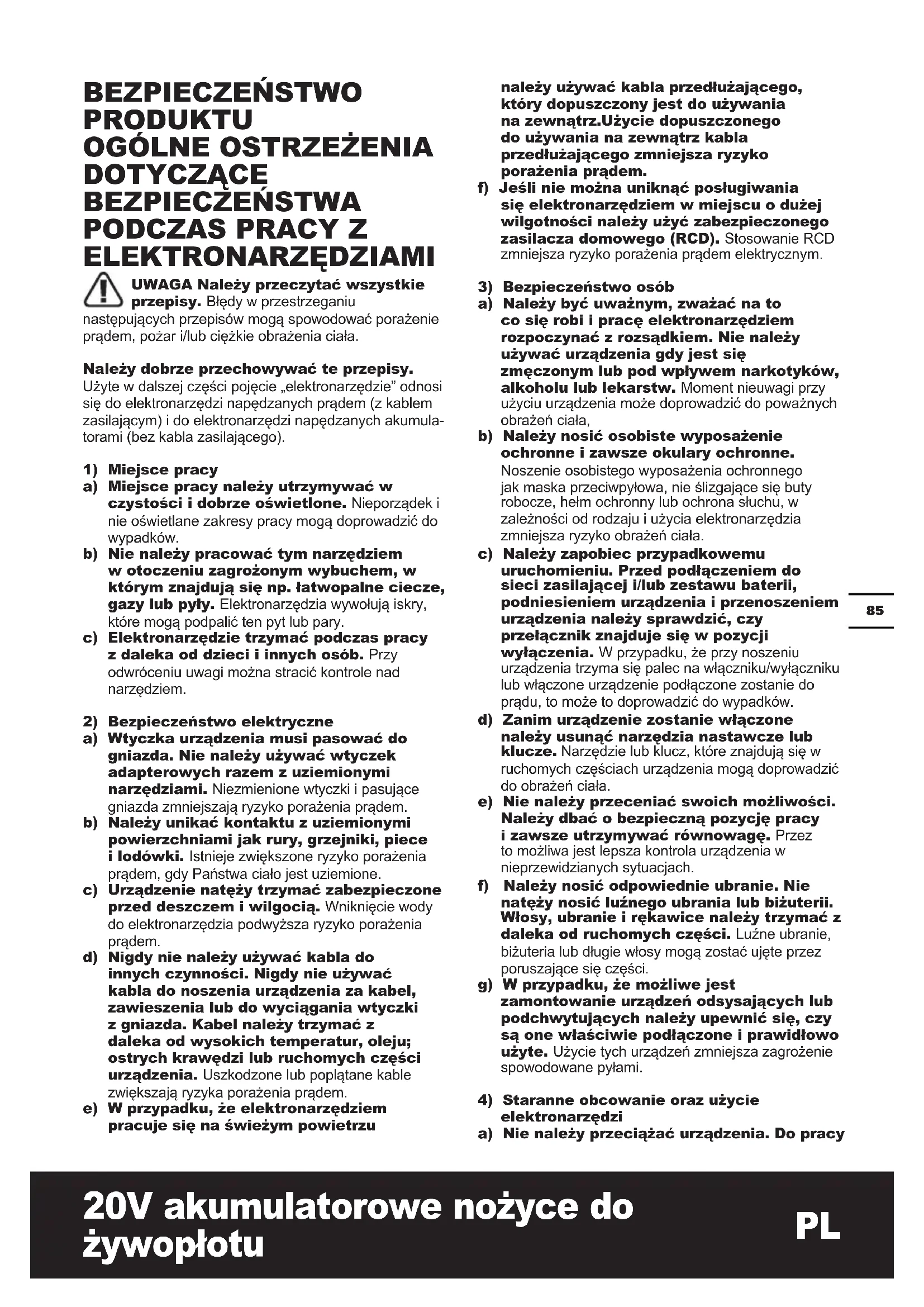 należy przed użyciem naładować. Zawsze używaj właściwej ładowarki i przestrzegaj instrukcji ładowania zawartej w instrukcji obsługi dostarczonej przez producenta urządzenia. j) Nie pozostawiaj modułu akumulatora na długie ładowanie, jeśli go nie używasz. k) Po dłuższym okresie składowania może być niezbędne kilkukrotne naładowanie i rozładowanie ogniw lub modułu akumulatora, aby uzyskać optymalną wydajność. l) Ogniwa pomocnicze oraz moduł akumulatora osiągają największą88 20V akumulatorowe nożyce do żywopłotu