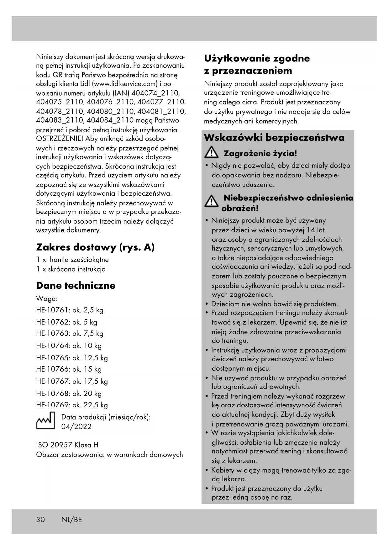 Belangrijk: let er hierbij op dat uw bo- venbenen naast elkaar blijven. Kantel uw bekken naar voren, maar houd uw bovenlichaam rechtop. Opslag, reiniging Bewaar het artikel wanneer u dit niet gebruikt altijd droog en schoon op kamertemperatuur. Reinig het artikel alleen met een vochtige schoonmaakdoek en droog het vervolgens af. BELANGRIJK! Reinig nooit met agressieve reini- gingsmiddelen.30 Niniejszy dokument jest skróconą wersją drukowa- ną pełnej instrukcji użytkowania. Po zeskanowaniu kodu QR trafią Państwo bezpośrednio na stronę obsługi klienta Lidl (www.lidl-service.com) i po wpisaniu numeru artykułu (IAN) 404074_2110, 404075_2110, 404076_2110, 404077_2110, 404078_2110, 404080_2110, 404081_2110, 404083_2110, 404084_2110 mogą Państwo przejrzeć i pobrać pełną instrukcję użytkowania. OSTRZEŻENIE! Aby uniknąć szkód osobo- wych i rzeczowych należy przestrzegać pełnej instrukcji użytkowania i wskazówek dotyczą- cych bezpieczeństwa. Skrócona instrukcja jest częścią artykułu. Przed użyciem artykułu należy zapoznać się ze wszystkimi wskazówkami dotyczącymi użytkowania i bezpieczeństwa. Skróconą instrukcję należy przechowywać w bezpiecznym miejscu a w przypadku przekaza- nia artykułu osobom trzecim należy dołączyć wszystkie dokumenty. Zakres dostawy (rys. A) 1 x hantle sześciokątne 1 x skrócona instrukcja Dane techniczne Waga: HE-10761: ok. 2,5 kg HE-10762: ok. 5 kg HE-10763: ok. 7,5 kg HE-10764: ok. 10 kg HE-10765: ok. 12,5 kg HE-10766: ok. 15 kg HE-10767: ok. 17,5 kg HE-10768: ok. 20 kg HE-10769: ok. 22,5 kg Data produkcji (miesiąc/rok): 04/2022 ISO 20957 Klasa H Obszar zastosowania: w warunkach domowych Użytkowanie zgodne z przeznaczeniem Niniejszy produkt został zaprojektowany jako urządzenie treningowe umożliwiające tre- ning całego ciała. Produkt jest przeznaczony do użytku prywatnego i nie nadaje się do celów medycznych ani komercyjnych. Wskazówki bezpieczeństwa Zagrożenie życia!