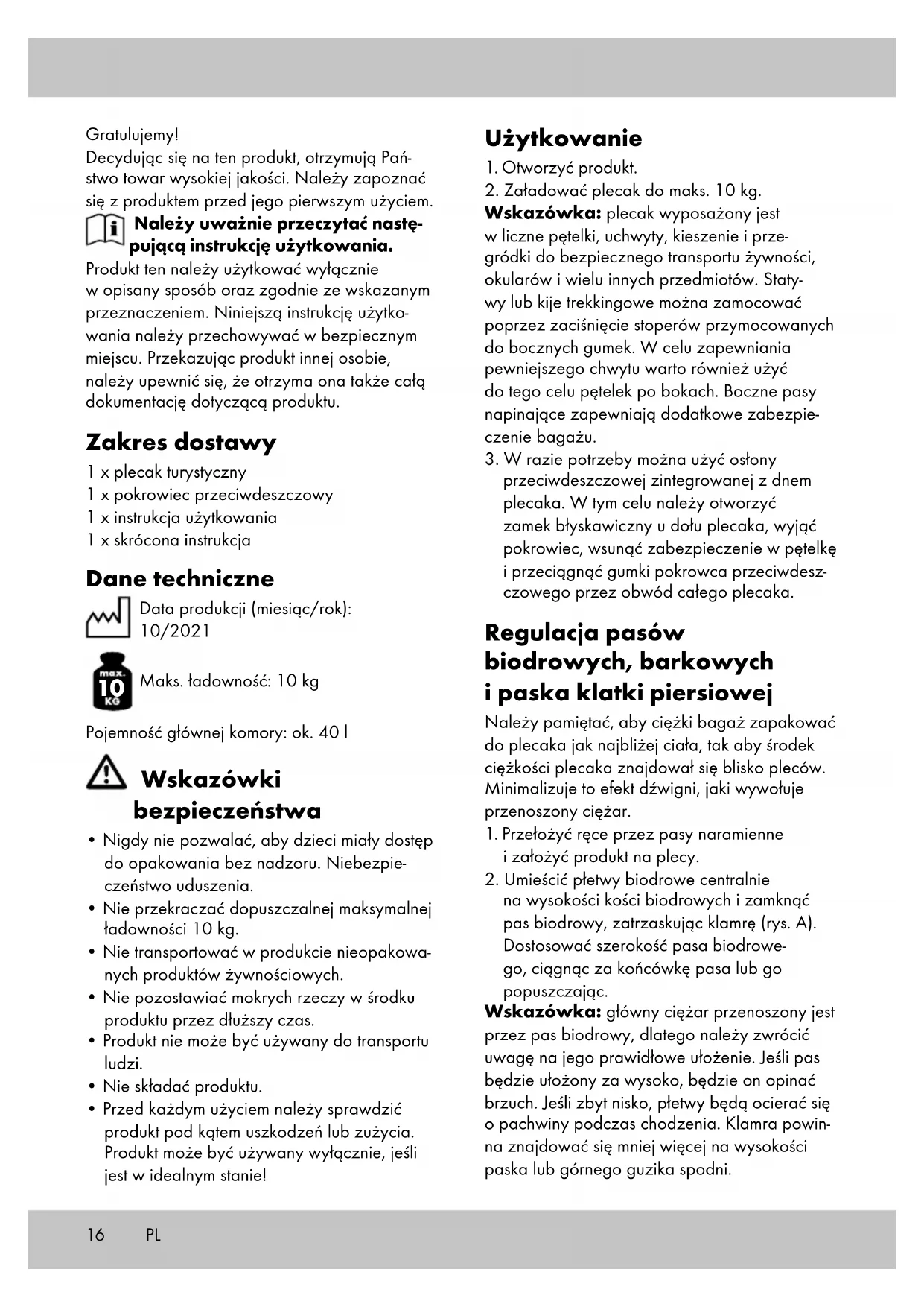 Maks. ładowność: 10 kg Pojemność głównej komory: ok. 40 l Wskazówki bezpieczeństwa