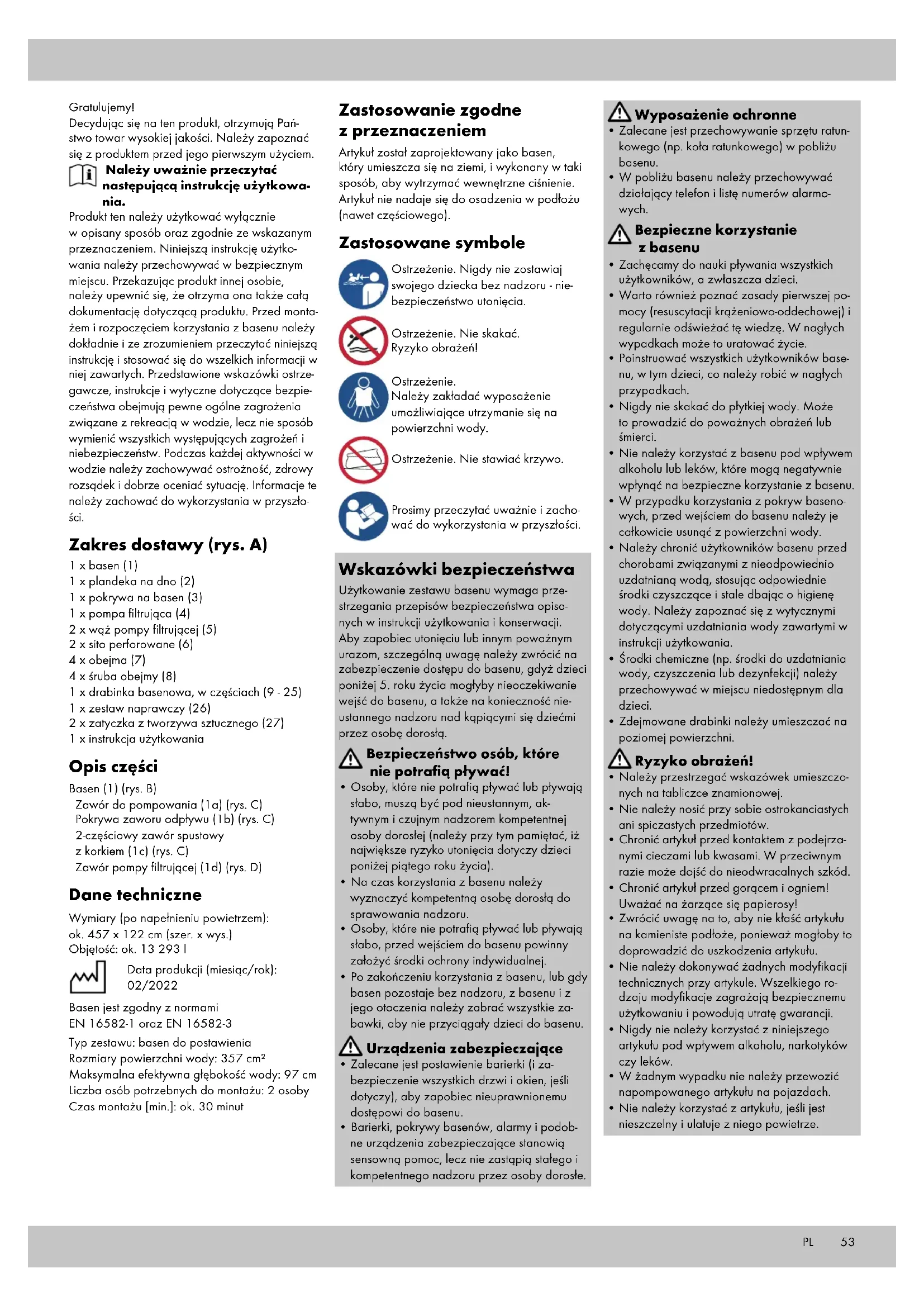 ton/80 - 98: composietmaterialen. Het artikel en de verpakkingsmaterialen zijn recyclebaar; voer ze gescheiden af voor een be- tere afvalbehandeling. Het Triman-logo is alleen van toepassing voor Frankrijk. Informatie over de mogelijkheden om het afge- dankte artikel af te voeren, wordt verstrekt door de gemeentelijke overheid.53 Gratulujemy! Decydując się na ten produkt, otrzymują Pań- stwo towar wysokiej jakości. Należy zapoznać się z produktem przed jego pierwszym użyciem. Należy uważnie przeczytać następującą instrukcję użytkowa- nia. Produkt ten należy użytkować wyłącznie w opisany sposób oraz zgodnie ze wskazanym przeznaczeniem. Niniejszą instrukcję użytko- wania należy przechowywać w bezpiecznym miejscu. Przekazując produkt innej osobie, należy upewnić się, że otrzyma ona także całą dokumentację dotyczącą produktu. Przed monta- żem i rozpoczęciem korzystania z basenu należy dokładnie i ze zrozumieniem przeczytać niniejszą instrukcję i stosować się do wszelkich informacji w niej zawartych. Przedstawione wskazówki ostrze- gawcze, instrukcje i wytyczne dotyczące bezpie- czeństwa obejmują pewne ogólne zagrożenia związane z rekreacją w wodzie, lecz nie sposób wymienić wszystkich występujących zagrożeń i niebezpieczeństw. Podczas każdej aktywności w wodzie należy zachowywać ostrożność, zdrowy rozsądek i dobrze oceniać sytuację. Informacje te należy zachować do wykorzystania w przyszło- ści. Zakres dostawy (rys. A) 1 x basen (1) 1 x plandeka na dno (2) 1 x pokrywa na basen (3) 1 x pompa filtrująca (4) 2 x wąż pompy filtrującej (5) 2 x sito perforowane (6) 4 x obejma (7) 4 x śruba obejmy (8) 1 x drabinka basenowa, w częściach (9 - 25) 1 x zestaw naprawczy (26) 2 x zatyczka z tworzywa sztucznego (27) 1 x instrukcja użytkowania Opis części Basen (1) (rys. B) Zawór do pompowania (1a) (rys. C) Pokrywa zaworu odpływu (1b) (rys. C) 2-częściowy zawór spustowy z korkiem (1c) (rys. C) Zawór pompy filtrującej (1d) (rys. D) Dane techniczne Wymiary (po napełnieniu powietrzem): ok. 457 x 122 cm (szer. x wys.) Objętość: ok. 13 293 l Data produkcji (miesiąc/rok): 02/2022 Basen jest zgodny z normami EN 16582-1 oraz EN 16582-3 Typ zestawu: basen do postawienia Rozmiary powierzchni wody: 357 cm² Maksymalna efektywna głębokość wody: 97 cm Liczba osób potrzebnych do montażu: 2 osoby Czas montażu [min.]: ok. 30 minut Zastosowanie zgodne z przeznaczeniem Artykuł został zaprojektowany jako basen, który umieszcza się na ziemi, i wykonany w taki sposób, aby wytrzymać wewnętrzne ciśnienie. Artykuł nie nadaje się do osadzenia w podłożu (nawet częściowego). Zastosowane symbole Ostrzeżenie. Nigdy nie zostawiaj swojego dziecka bez nadzoru - nie- bezpieczeństwo utonięcia. Ostrzeżenie. Nie skakać. Ryzyko obrażeń! Ostrzeżenie. Należy zakładać wyposażenie umożliwiające utrzymanie się na powierzchni wody. Ostrzeżenie. Nie stawiać krzywo. Prosimy przeczytać uważnie i zacho- wać do wykorzystania w przyszłości. Wskazówki bezpieczeństwa Użytkowanie zestawu basenu wymaga prze- strzegania przepisów bezpieczeństwa opisa- nych w instrukcji użytkowania i konserwacji. Aby zapobiec utonięciu lub innym poważnym urazom, szczególną uwagę należy zwrócić na zabezpieczenie dostępu do basenu, gdyż dzieci poniżej 5. roku życia mogłyby nieoczekiwanie wejść do basenu, a także na konieczność nie- ustannego nadzoru nad kąpiącymi się dziećmi przez osobę dorosłą. Bezpieczeństwo osób, które nie potrafią pływać!