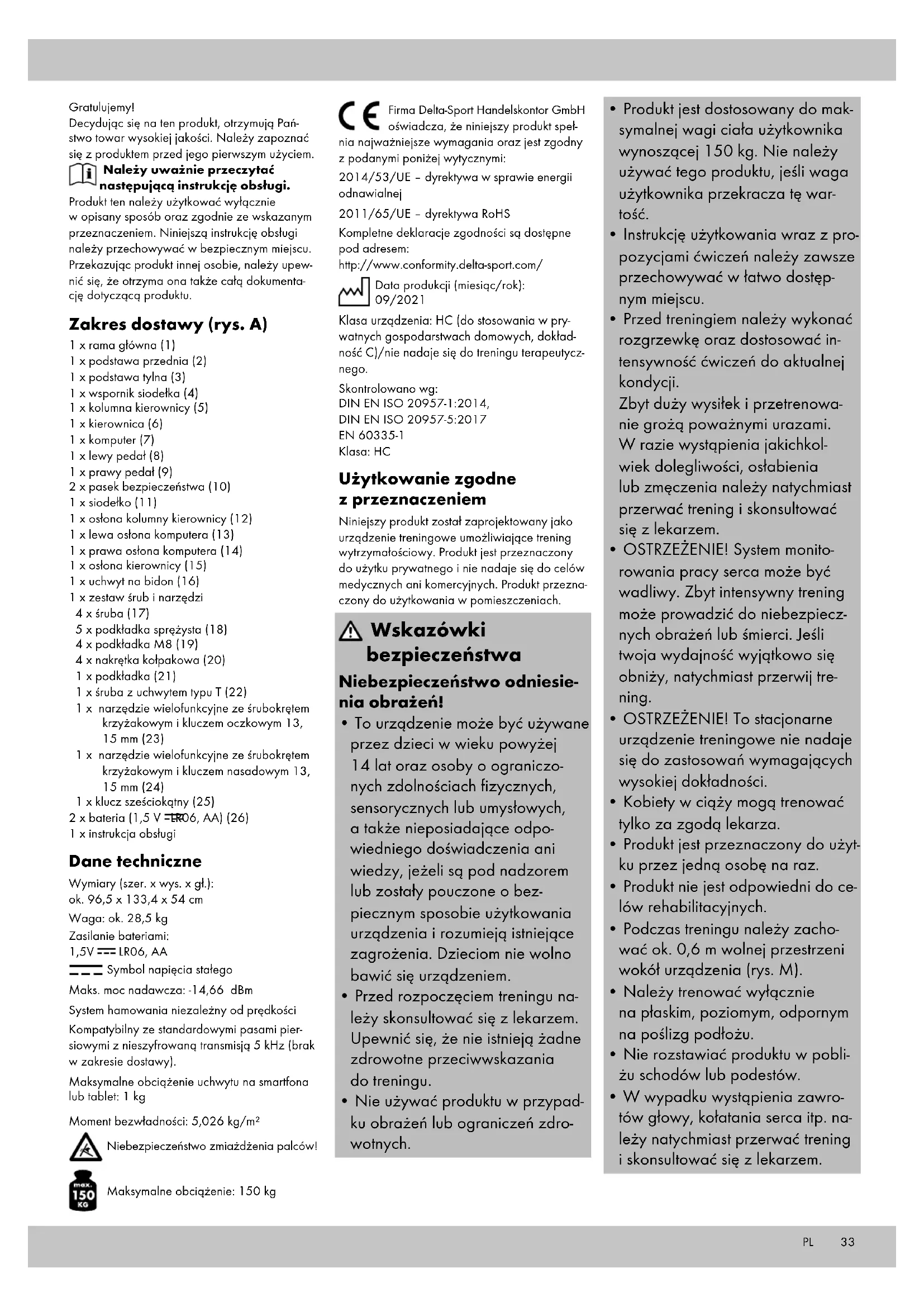 - Produkt jest dostosowany do mak- symalnej wagi ciała użytkownika wynoszącej 150 kg. Nie należy używać tego produktu, jeśli waga użytkownika przekracza tę war- tość.
