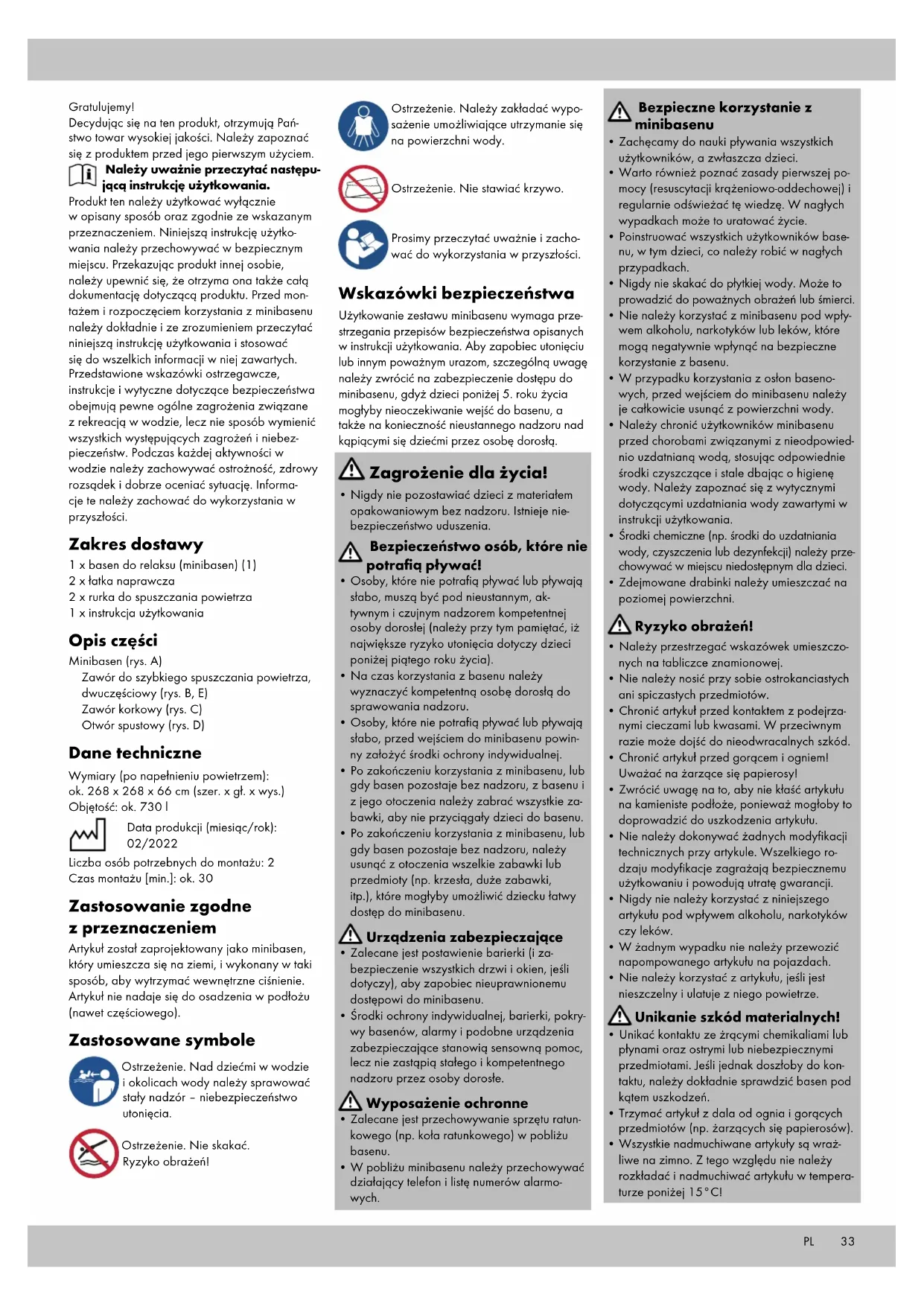 miernie 2,5 cm wody, należy wygładzić dno. Wyciągnąć ściankę zewnętrzną od górnej krawędzi dookoła dna basenu na zewnątrz. Wpływ jakości wody W celu utrzymania odpowiedniej skuteczności powłoki oraz ze względu na aspekty estetyczne, w stosownym czasie należy zastosować odpowiednie zabiegi i/lub zalecenia producenta basenu. Przed użyciem należy koniecznie zapoznać się z instruk- cjami producenta dotyczącymi produktu i stosowa- nia, aby sprawdzić ich kompatybilność z wierzchnią warstwą powłoki poliestrowej. Stosowane produkty i procedury muszą być zgodne z zaleceniami przedstawionymi w niniejszej instrukcji. Woda do napełniania może pochodzić z publicznej sieci wodociągowej, jednakże dopuszczalna jest również woda z odwiertu, zbiornika lub studni. W tym przypadku niezbędna jest regularna analiza wody, w tym analiza fizyko-chemiczna, co ma na celu wykrycie ewentualnych metali (żelazo, miedź, mangan), które mogą mieć szko- dliwy wpływ na wierzchnią warstwę, ponieważ istnieje ryzyko powstawania plam z powodu siarczków metali. PL35PL Analiza stanowi podstawę do dokonywania ustawień niezbędnych w celu zapewnienia zarówno dobrej jakości wody do kąpieli, jak i trwałości warstwy wierzchniej. Wykonaną analizę jakości wlewanej wody należy udostęp- nić producentowi minibasenu w celu oceny i zatwierdzenia. Należy jednak unikać osadzania się wodorowi- nianu potasu i/lub tworzenia się metali. W tym celu zaleca się stosowanie środków sekwestru- jących wapień (odkamieniacze) oraz środków sekwestrujących jony metali. Stosowanie produktów i/lub procesów uzdatnia- jących wymaga zatwierdzenia przez specjalistę, ponieważ w niektórych kombinacjach może dojść do nieodwracalnego uszkodzenia war- stwy wierzchniej. Podczas dezynfekcji z użyciem stabilizatorów lub produktów na bazie stabilizowanego chloru należy stosować dozowanie zalecane przez producenta (które powinno być zgodne z z normą EN 16713-3). Na czas przechowywania na zimę należy prze- strzegać wskazówek dotyczących pielęgnacji, przechowywania, napraw i konserwacji. Krótko przed przykryciem minibasenu nie należy prze- prowadzać dezynfekcji szokowej, ponieważ w ciągu 8 godzin od dezynfekcji istnieje ryzyko chemicznego uszkodzenia powłoki minibasenu. Dostępność OSTRZEŻENIE! Nigdy nie zostawiaj swojego dziecka bez nadzoru - niebezpieczeństwo utonięcia. Osoby, które nie potrafią pływać lub pływają słabo, muszą być pod nieustannym, aktywnym i czujnym nadzorem kompetentnej osoby dorosłej (należy przy tym pamiętać, iż największe ryzyko utonięcia dotyczy dzieci poniżej piątego roku życia). W pobliżu minibasenu należy trzymać telefon lub inny środek łączności, aby w razie potrzeby można było powiadomić służby ratunkowe. Nawet jeśli minibasen nie jest używany, należy postępować zgodnie z następującymi wytycz- nymi: