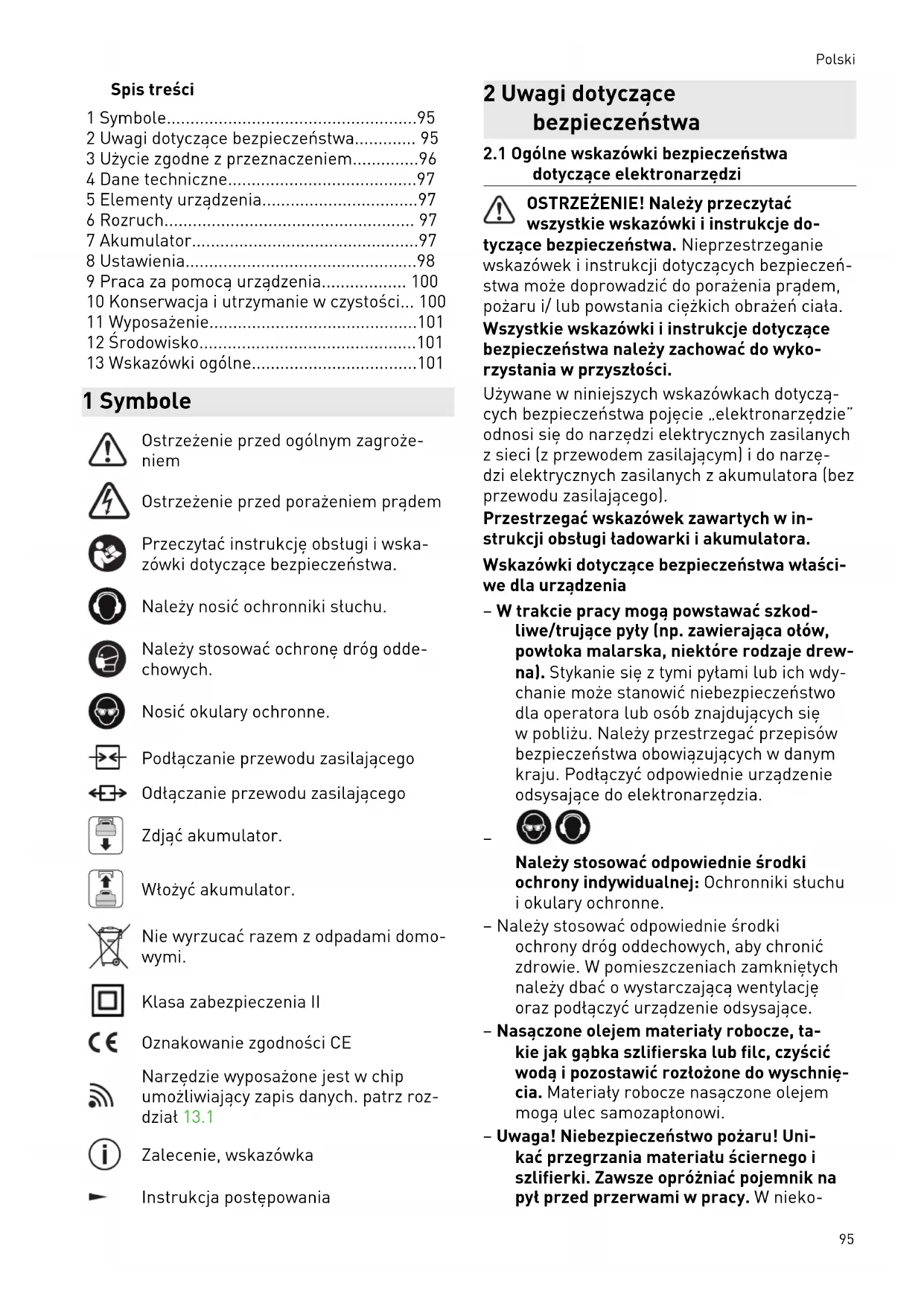 - 13 Wskazówki ogólne 1 Symbole Ostrzeżenie przed ogólnym zagroże niem Ostrzeżenie przed porażeniem prądem Przeczytać instrukcję obsługi iwska zówki dotyczące bezpieczeństwa. Należy nosić ochronniki słuchu. Należy stosować ochronę dróg odde chowych. Nosić okulary ochronne. Podłączanie przewodu zasilającego Odłączanie przewodu zasilającego Zdjąć akumulator. Włożyć akumulator. Nie wyrzucać razem z odpadami domo wymi. Klasa zabezpieczenia II Oznakowanie zgodności CE Narzędzie wyposażone jest w chip umożliwiający zapis danych. patrz roz dział13.1 Zalecenie, wskazówka Instrukcja postępowania 2 Uwagi dotyczące bezpieczeństwa p. 101