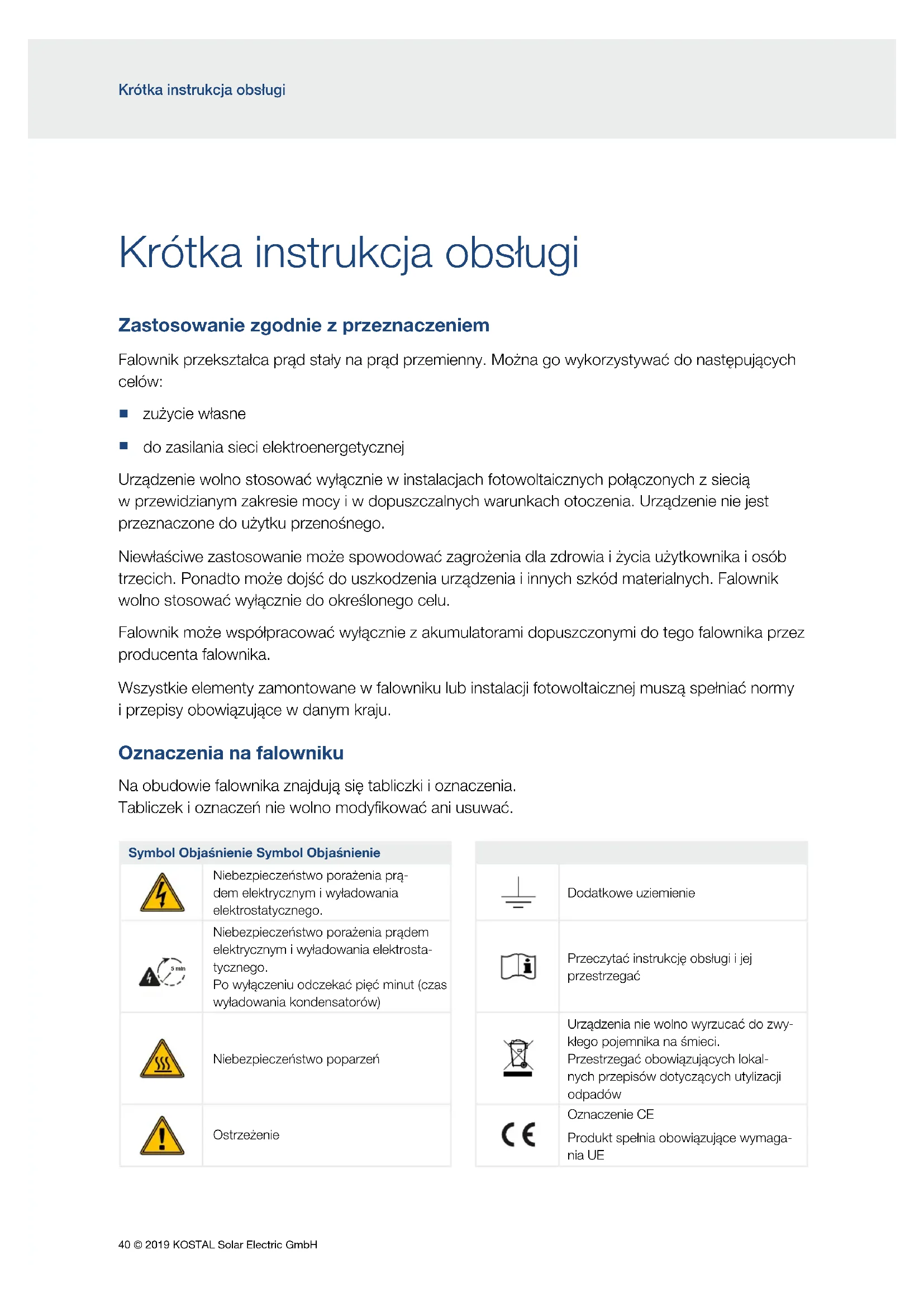 do zasilania sieci elektroenergetycznej Urządzenie wolno stosować wyłącznie winstalacjach fotowoltaicznych połączonych zsiecią wprzewidzianym zakresie mocy iw dopuszczalnych warunkach otoczenia. Urządzenie nie jest przeznaczone do użytku przenośnego. Niewłaściwe zastosowanie może spowodować zagrożenia dla zdrowia iżycia użytkownika iosób trzecich. Ponadto może dojść do uszkodzenia urządzenia iinnych szkód materialnych. Falownik wolno stosować wyłącznie do określonego celu. Falownik może współpracować wyłącznie zakumulatorami dopuszczonymi do tego falownika przez producenta falownika. Wszystkie elementy zamontowane wfalowniku lub instalacji fotowoltaicznej muszą spełniać normy iprzepisy obowiązujące wdanym kraju. Oznaczenia na falowniku Na obudowie falownika znajdują się tabliczki ioznaczenia. Tabliczek ioznaczeń nie wolno modyfikować ani usuwać. Symbol Objaśnienie Symbol Objaśnienie Niebezpieczeństwo porażenia prą- dem elektrycznym iwyładowania elektrostatycznego. Dodatkowe uziemienie 5 min Niebezpieczeństwo porażenia prądem elektrycznym iwyładowania elektrosta- tycznego. Po wyłączeniu odczekać pięć minut (czas wyładowania kondensatorów) Przeczytać instrukcję obsługi ijej przestrzegać 5 min Niebezpieczeństwo poparzeń Urządzenia nie wolno wyrzucać do zwy- kłego pojemnika na śmieci. Przestrzegać obowiązujących lokal- nych przepisów dotyczących utylizacji odpadów Ostrzeżenie Oznaczenie CE Produkt spełnia obowiązujące wymaga- nia UE© 2019 KOSTAL Solar Electric GmbH 41