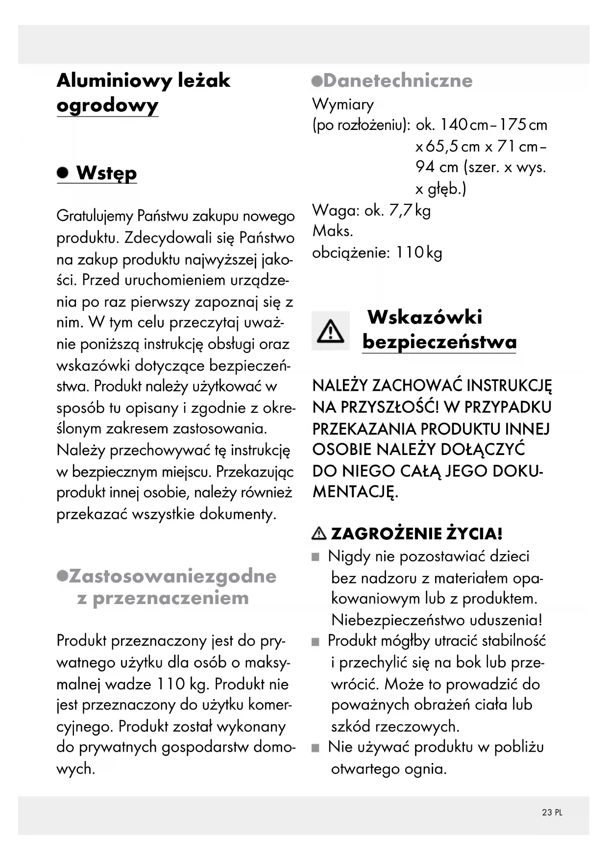 MENTACJĘ. ZAGROŻENIE ŻYCIA! Nigdy nie pozostawiać dzieci bez nadzoru z materiałem opa- kowaniowym lub z produktem. Niebezpieczeństwo uduszenia! Produkt mógłby utracić stabilność i przechylić się na bok lub prze- wrócić. Może to prowadzić do poważnych obrażeń ciała lub szkód rzeczowych. Nie używać produktu w pobliżu otwartego ognia.24 PL Przy rozpakowywaniu lub rozkła- daniu produktu należy zachować ostrożność. Przed użyciem należy sprawdzić właściwą stabilność produktu. Należy uważać na to, aby arty- kuł stał na równym i stabilnym podłożu. Należy przestrzegać maksymal- nego obciążenia 110 kg. Jeśli zostanie przekroczona ta granica wagi, może dojść do obrażeń ciała i / lub szkód rzeczowych. Ręce należy trzymać z dala od składanego mechanizmu, aby uniknąć obrażeń ciała. Przed użyciem produktu należy upewnić się, że mechanizm skła- dany jest poprawnie zablokowany. Przed użyciem należy się upewnić, że produkt jest całkowicie rozło- żony. Produkt może być używany wy- łącznie pod nadzorem dorosłych i nie jako zabawka. Produktu może używać tylko jedna osoba naraz. Produkt należy sprawdzić przed każdym użyciem pod kątem uszkodzenia lub zużycia. Pro- duktu należy używać tylko jeśli jest w nienagannym stanie. Nie używać produktu w razie stwier- dzenia widocznych uszkodzeń lub przypuszczenia, że takie mogą być. W przypadku ekstremalnych warunków pogodowych, np. przy mocnym wietrze, należy zabezpieczyć produkt. Produkt przechowywać w chronionym pomieszczeniu. Proszę nie stawać na produkcie. NIEBEZPIECZEŃSTWO