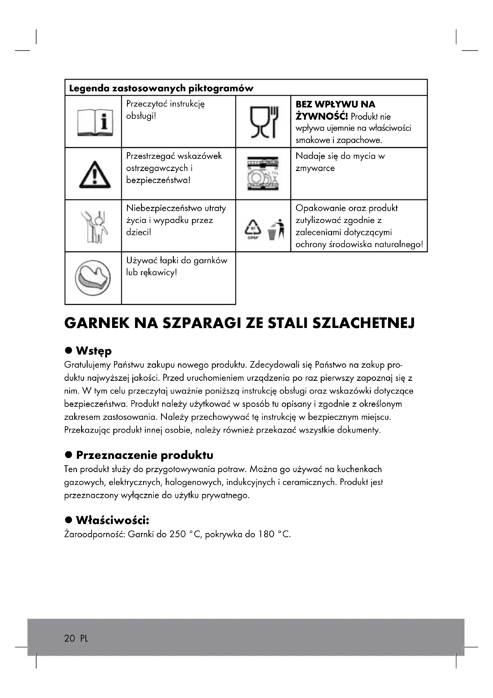 l Wstęp Gratulujemy Państwu zakupu nowego produktu. Zdecydowali się Państwo na zakup pro- duktu najwyższej jakości. Przed uruchomieniem urządzenia po raz pierwszy zapoznaj się z nim. W tym celu przeczytaj uważnie poniższą instrukcję obsługi oraz wskazówki dotyczące bezpieczeństwa. Produkt należy użytkować w sposób tu opisany i zgodnie z określonym zakresem zastosowania. Należy przechowywać tę instrukcję w bezpiecznym miejscu. Przekazując produkt innej osobie, należy również przekazać wszystkie dokumenty. l Przeznaczenie produktu Ten produkt służy do przygotowywania potraw. Można go używać na kuchenkach gazowych, elektrycznych, halogenowych, indukcyjnych i ceramicznych. Produkt jest przeznaczony wyłącznie do użytku prywatnego. l Właściwości: Żaroodporność: Garnki do 250 °C, pokrywka do 180 °C. 20 PLl Wskazówki dotyczące bezpieczeństwa n OSTRZEŻENIE! NIEBEZPIECZEŃSTWO UTRATY ŻYCIA I WYPADKU DLA DZIECI! Nigdy nie pozostawiać dzieci bez nadzoru z materiałem opakowania. Niebezpieczeństwo uduszenia. Produkt należy przechowywać poza zasięgiem dzieci. n OSTRZEŻENIE! Nigdy nie należy pozostawiać dzieci bez nadzoru w pobliżu gorącego naczynia kuchennego. n Należy pamiętać, że uchwyty i uchwyt sitka nagrzewają się podczas gotowania może być. Używaj uchwytów do garnków lub rękawic do grilla dla swojej ochrony podnieść garnek i wyjąć sitko z garnka. n Ostrożnie przy gorącym oleju lub tłuszczu! Garnka wypełnionego tłuszczem nigdy nie podgrzewać na najwyższym stopniu temperatury. W przypadku przegrzania płytę grzejną natychmiast wyłączyć. Nigdy nie podnosić garnka bezpośrednio z płyty grzejnej, lecz pozostawić go najpierw na stygnącym palniku. Nie przenosić produktu po gorącej kuchni. n Podczas gotowania ważne jest, aby garnków nie spuszczać z oka. Tłuszcz i potrawy mogą się bardzo szybko przegrzewać i zapalić.. W przypadku zapalenia się tłuszczy, nigdy nie próbować gaszenia wodą! Na gorący tłuszcz nie należy kłaść mokrego, ociekającego mięsa. Wskutek pryskającego tłuszczu na rozżarzoną płytę kuchenki łatwo można wzniecić pożar. n Palącego się tłuszczu nie gasić wodą, tylko płomienie zadusić kocem lub skorzystać z gaśnicy. n Nie schładzać produktu zimną wodą. n Nie należy podgrzewać pustego produktu. n Produkt podgrzewać przy średniej temperaturze. n Produktu nie przesuwać po płycie szklano-ceramicznej. n Nie należy skrobać lub ciąć w produkcie. Stosować przyrządy jedynie z drewna lub tworzywa sztucznego. n Nie przegrzewać produktu. Jeśli wystąpi przegrzanie, dobrze wywietrzyć pomieszczenie. PL 21 Nadaje się do następujących urządzeń: Kuchenka gazowa Kuchenka indukcyjna Kuchenka elektryczna Halogenowa płyta kuchenna Szklano-ceramiczna płyta kuchennan Wysokie temperatury mogą doprowadzić do przebarwień na odwrotnej stronie produktu. Nie jest to błąd materiału i nie obniża jakości lub funkcji produktu. n Nie dodawać soli lub słonej wody do wcześniej rozgrzanego pustego produktu, ponieważ może to prowadzić do korozji. Nie zmniejszy to jednak wydajności produktu. n BEZ WPŁYWU NA ŻYWNOŚĆ! Produkt nie wpływa ujemnie na właściwości smakowe i zapachowe. n Do optymalnego wykorzystania energii palnik płyty kuchennej powinien odpowiadać wielkości dna produktu a produkt musi być stawiany po środku tego palnika. Produkt stawiać na płycie kuchennej jedynie z suchym dnem.