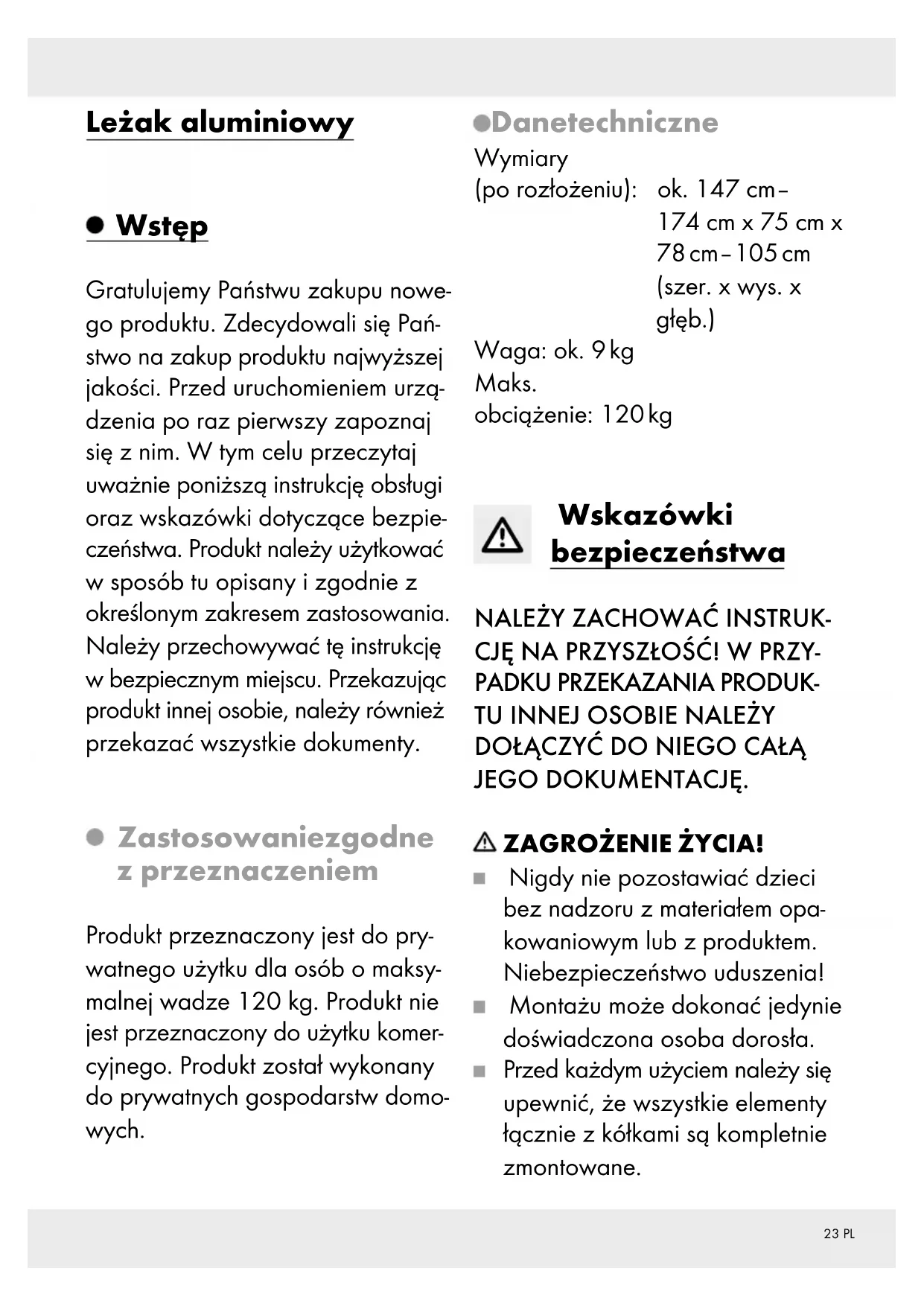 MATERIALNYCH! Nie odpowiadamy za wypadki spowodowane nieprzestrzeganiem wyżej wymienionych wskazówek bezpieczeństwa lub niewłaściwym obchodzeniem się. Czyszczenie i pielęgnacja Czyścić produkt i usuwać plamy wilgotną ściereczką z dodatkiem łagodnego środka myjącego, który jest specjalnie wskazany25 PL dla tego produktu. Zabrudzenia usuwać z produktu miękką gąbką i czystą wodą. Przed ponownym zapakowa- niem produktu, należy starannie osuszyć wszystkie części. Dzięki temu zapobiegnie się powsta- waniu pleśni, zapachów i przebarwień. Przechowywanie W razie nieużywania zalecamy przechowywanie produktu zawsze w stanie suchym i czystym, w po- mieszczeniu o stałej temperaturze, aby móc się nim długo cieszyć. Utylizacja Opakowanie wykonane jest z ma- teriałów przyjaznych dla środowiska, które można przekazać do utylizacji w lokalnym punkcie przetwarzania surowców wtórnych. Informacji na temat możliwości uty- lizacji wyeksploatowanego produktu udziela urząd gminy lub miasta. Gwarancja Produkt wyprodukowano według wysokich standardów jakości i pod- dano skrupulatnej kontroli przed wy- syłką. W przypadku wad produktu nabywcy przysługują ustawowe pra- wa. Gwarancja nie ogranicza usta- wowych praw nabywcy produktu. Produkt objęte jest 3 gwarancją, licząc od daty zakupu. Gwarancja wygasa w razie zawinionego przez użytkownika uszkodzenia produktu, niewłaściwego użycia lub konser- wacji. W przypadku wystąpienia w ciągu 3 lat od daty zakupu wad materia- łowych lub fabrycznych, dokonuje- my – według własnej oceny – bez- płatnej naprawy lub wymiany produktu. Świadczenie gwarancyjne obejmu- je wady materiałowe i fabryczne. Gwarancja nie obejmuje części pro- duktu ulegających normalnemu zu- życiu, uznawanych za części zuży- walne (np. baterie) oraz uszkodzeń części łamliwych, np. przełączników, akumulatorów lub wykonanych ze szkła.26 PL Zgodnie z Kodeksem Cywilnym art. 581 §1 wraz z wymianą urządze- nia lub ważnej części czas gwaran- cji rozpoczyna się na nowo. Sposób postępowania w przypadku naprawy gwarancyjnej Aby zapewnić szybkie rozpatrzenie Państwa wniosku, prosimy stosować się do następujących wskazówek: Przed skontaktowaniem się z dzia- łem serwisowym należy przygoto- wać paragon i numer artykułu (np. IAN 123456_7890) jako dowód zakupu. Numery artykułów można znaleźć na tabliczce znamionowe, na gra- werunku, na stronie tytułowej jego instrukcji (na dole po lewej stronie) lub jako naklejkę na stronie odwrot- nej lub spodniej. W razie wystąpienia błędów w działaniu lub innych wad, należy skontaktować się najpierw z wy- mienionym poniżej działem serwi- sowym telefonicznie lub pocztą elektroniczną. Produkt uznany za uszkodzony można następnie z dołączeniem dowodu zakupu (paragonu) i po- daniem, na czym polega wada i kiedy wystąpiła, przesłać bezpłatnie na podany Państwu adres serwisu. Serwis Serwis Polska Tel.: 008004911946 E-Mail: owim@lidl.pl27 CZ Hliníkové polohovací lehátko Úvod Blahopřejeme Vám ke koupi nového výrobku. Rozhodli jste se pro kvalit- ní výrobek. Před prvním uvedením do provozu se seznamte s výrobkem. K tomu si pozorně přečtěte násle- dující návod k obsluze a bezpeč- nostní pokyny. Používejte výrobek jen popsaným způsobem a pouze pro uvedené oblasti použití. Uscho- vejte si tento návod na bezpečném místě. Všechny podklady vydejte při předání výrobku i třetí osobě.
