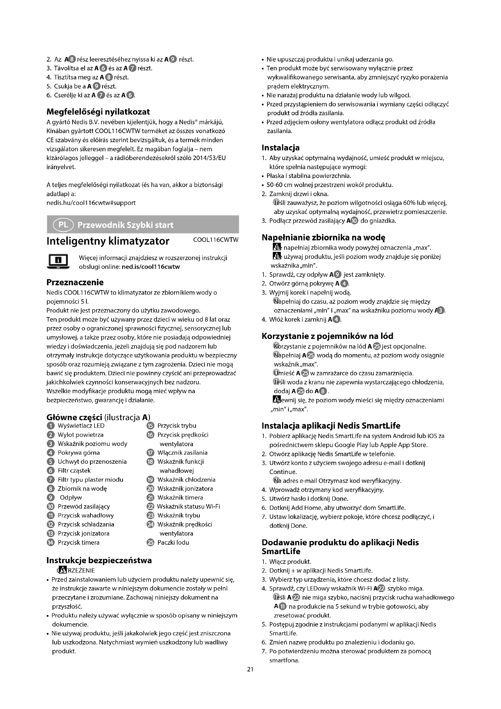 Przewodnik Szybki start Inteligentny klimatyzator COOL116CWTWWięcej informacji znajdziesz w rozszerzonej instrukcji obsługi online: ned.is/cool116cwtw Przeznaczenie Nedis COOL116CWTW to klimatyzator ze zbiornikiem wody o pojemności 5 l.Produkt nie jest przeznaczony do użytku zawodowego.Ten produkt może być używany przez dzieci w wieku od 8 lat oraz przez osoby o ograniczonej sprawności zycznej, sensorycznej lub umysłowej, a także przez osoby, które nie posiadają odpowiedniej wiedzy i doświadczenia, jeżeli znajdują się pod nadzorem lub otrzymały instrukcje dotyczące użytkowania produktu w bezpieczny sposób oraz rozumieją związane z tym zagrożenia. Dzieci nie mogą bawić się produktem. Dzieci nie powinny czyścić ani przeprowadzać jakichkolwiek czynności konserwacyjnych bez nadzoru.Wszelkie modykacje produktu mogą mieć wpływ na bezpieczeństwo, gwarancję i działanie. Główne części (ilustracja A) 1 Wyświetlacz LED2 Wylot powietrza3 Wskaźnik poziomu wody4 Pokrywa górna5 Uchwyt do przenoszenia6 Filtr cząstek7 Filtr typu plaster miodu8 Zbiornik na wodę9 Odpływq Przewód zasilającyw Przycisk wahadłowye Przycisk schładzaniar Przycisk jonizatorat Przycisk timeray Przycisk trybuu Przycisk prędkości wentylatorai Włącznik zasilaniao Wskaźnik funkcji wahadłowejp Wskaźnik chłodzeniaa Wskaźnik jonizatoras Wskaźnik timerad Wskaźnik statusu Wi-Fif Wskaźnik trybug Wskaźnik prędkości wentylatorah Paczki lodu Instrukcje bezpieczeństwa