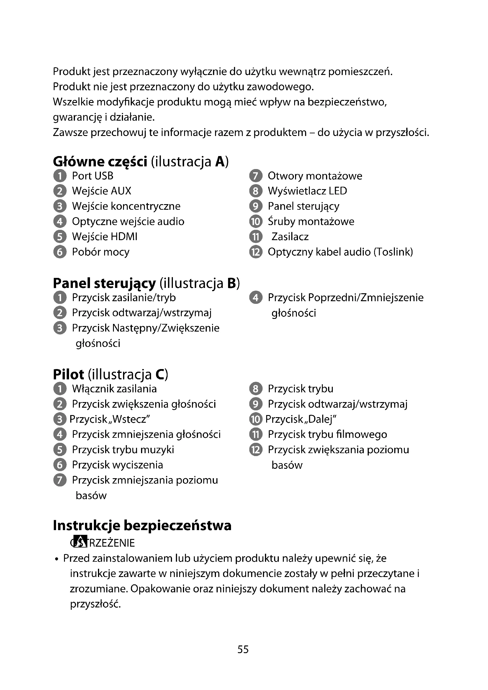 Przewodnik Szybki start Soundbar SPSB200BK Więcej informacji znajdziesz w rozszerzonej instrukcji obsługi online: ned.is/spsb200bk Przeznaczenie Ten produkt to soundbar, który można zamontować na ścianie lub umieścić pod telewizorem, aby odtwarzać dźwięk z urządzenia multimedialnego przez Bluetooth®, kabel audio lub urządzenie USB.55 Produkt jest przeznaczony wyłącznie do użytku wewnątrz pomieszczeń. Produkt nie jest przeznaczony do użytku zawodowego. Wszelkie modykacje produktu mogą mieć wpływ na bezpieczeństwo, gwarancję i działanie. Zawsze przechowuj te informacje razem z produktem – do użycia w przyszłości. Główne części (ilustracja A) 1 Port USB 2 Wejście AUX 3 Wejście koncentryczne 4 Optyczne wejście audio 5 Wejście HDMI 6 Pobór mocy 7 Otwory montażowe 8 Wyświetlacz LED 9 Panel sterujący q Śruby montażowe w Zasilacz e Optyczny kabel audio (Toslink) Panel sterujący (illustracja B) 1 Przycisk zasilanie/tryb 2 Przycisk odtwarzaj/wstrzymaj 3 Przycisk Następny/Zwiększenie głośności 4 Przycisk Poprzedni/Zmniejszenie głośności Pilot (illustracja C) 1 Włącznik zasilania 2 Przycisk zwiększenia głośności 3 Przycisk „Wstecz” 4 Przycisk zmniejszenia głośności 5 Przycisk trybu muzyki 6 Przycisk wyciszenia 7 Przycisk zmniejszania poziomu basów 8 Przycisk trybu 9 Przycisk odtwarzaj/wstrzymaj q Przycisk „Dalej” w Przycisk trybu lmowego e Przycisk zwiększania poziomu basów Instrukcje bezpieczeństwa
