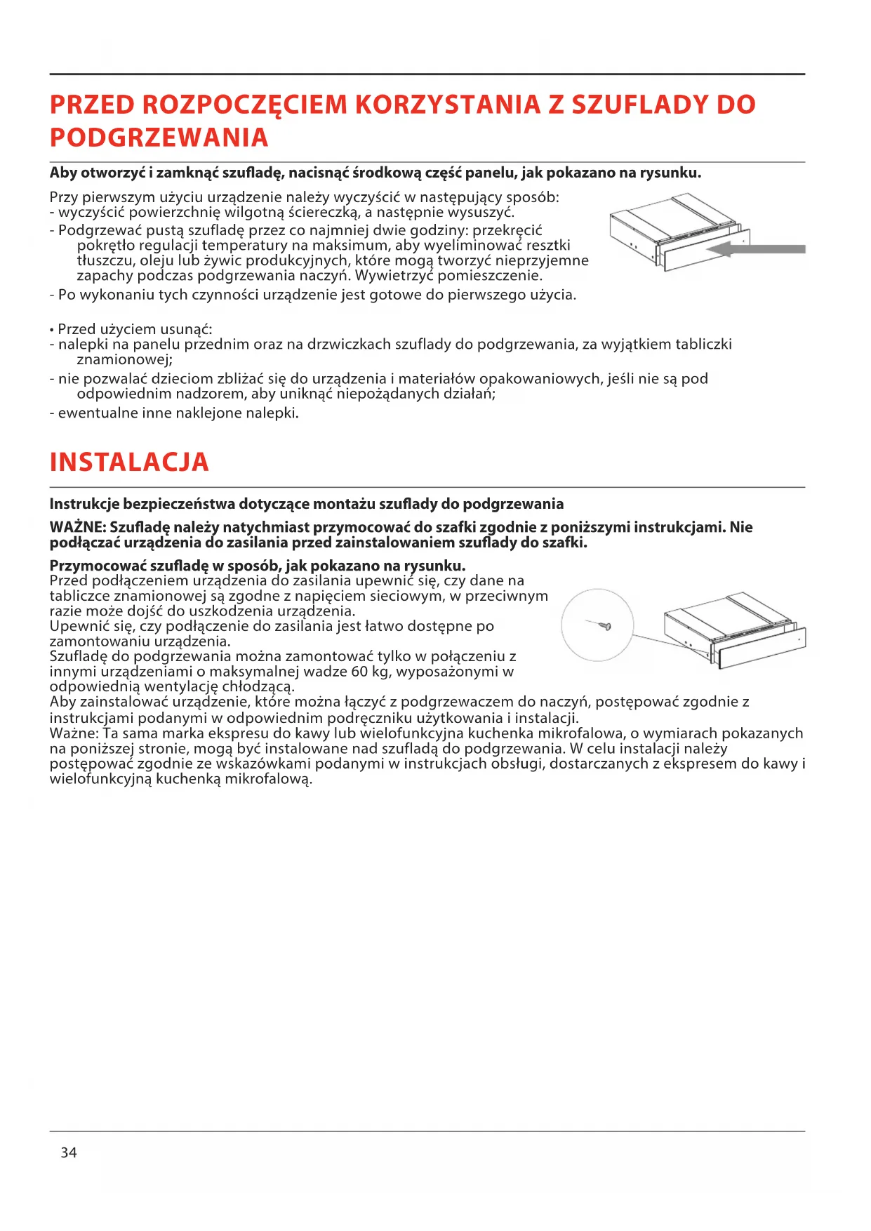- Przed użyciem usunąć: - nalepki na panelu przednim oraz na drzwiczkach szuflady do podgrzewania, za wyjątkiem tabliczki znamionowej; - nie pozwalać dzieciom zbliżać się do urządzenia i materiałów opakowaniowych, jeśli nie są pod odpowiednim nadzorem, aby uniknąć niepożądanych działań; - ewentualne inne naklejone nalepki. INSTALACJA Instrukcje bezpieczeństwa dotyczące montażu szuady do podgrzewania WAŻNE: Szuadę należy natychmiast przymocować do szafki zgodnie z poniższymi instrukcjami. Nie podłączać urządzenia do zasilania przed zainstalowaniem szuady do szafki. Przymocować szuadę w sposób, jak pokazano na rysunku. Przed podłączeniem urządzenia do zasilania upewnić się, czy dane na tabliczce znamionowej są zgodne z napięciem sieciowym, w przeciwnym razie może dojść do uszkodzenia urządzenia. Upewnić się, czy podłączenie do zasilania jest łatwo dostępne po zamontowaniu urządzenia. Szufladę do podgrzewania można zamontować tylko w połączeniu z innymi urządzeniami o maksymalnej wadze 60 kg, wyposażonymi w odpowiednią wentylację chłodzącą. Aby zainstalować urządzenie, które można łączyć z podgrzewaczem do naczyń, postępować zgodnie z instrukcjami podanymi w odpowiednim podręczniku użytkowania i instalacji. Ważne: Ta sama marka ekspresu do kawy lub wielofunkcyjna kuchenka mikrofalowa, o wymiarach pokazanych na poniższej stronie, mogą być instalowane nad szufladą do podgrzewania. W celu instalacji należy postępować zgodnie ze wskazówkami podanymi w instrukcjach obsługi, dostarczanych z ekspresem do kawy i wielofunkcyjną kuchenką mikrofalową.PL