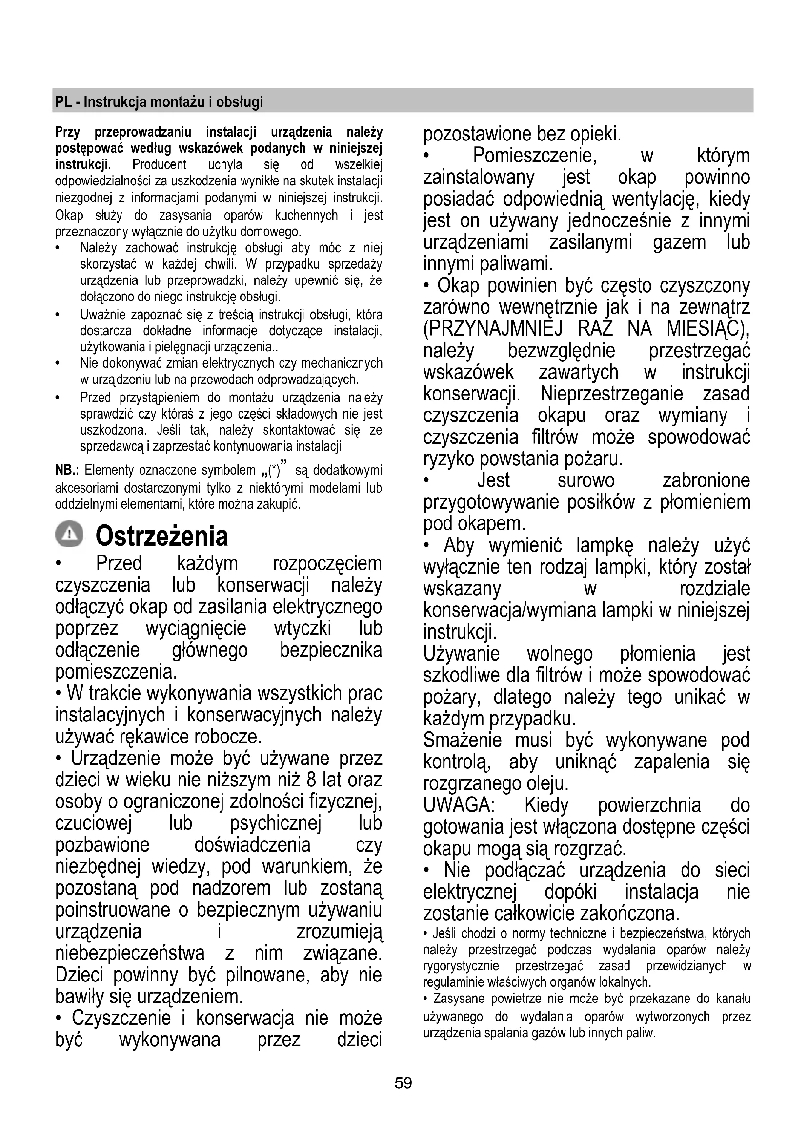 - Okap powinien być często czyszczony zarówno wewnętrznie jak i na zewnątrz (PRZYNAJMNIEJ RAZ NA MIESIĄC), należy bezwzględnie przestrzegać wskazówek zawartych w instrukcji konserwacji. Nieprzestrzeganie zasad czyszczenia okapu oraz wymiany i czyszczenia filtrów może spowodować ryzyko powstania pożaru.