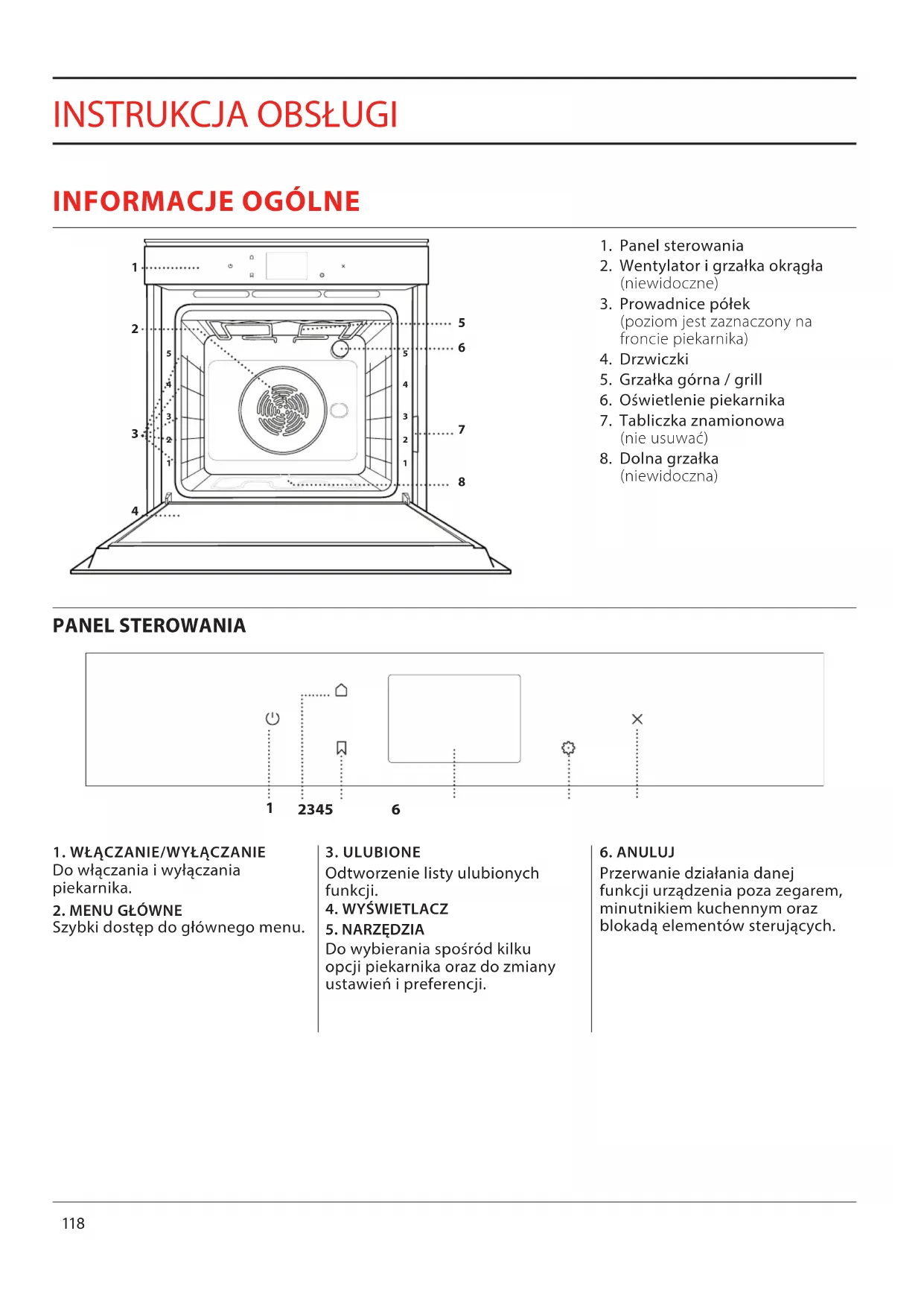 WSPARCIE TECHNICZNE 135118 1 Panel sterowania 2 Wentylator i grzałka okrągła (niewidoczne) 3 Prowadnice półek (poziom jest zaznaczony na froncie piekarnika) 4 Drzwiczki 5 Grzałka górna / grill 6 Oświetlenie piekarnika 7 Tabliczka znamionowa (nie usuwać) 8 Dolna grzałka (niewidoczna)