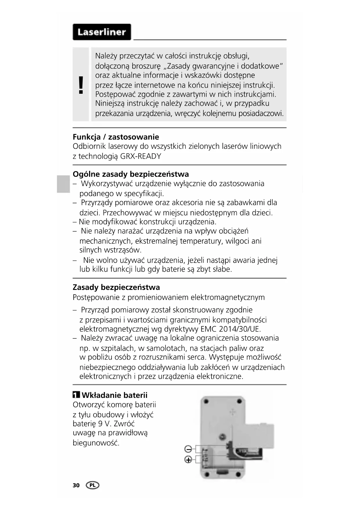 Ogólne zasady bezpieczeństwa – Wykorzystywać urządzenie wyłącznie do zastosowania podanego wspecykacji. – Przyrządy pomiarowe oraz akcesoria nie są zabawkami dla dzieci. Przechowywać wmiejscu niedostępnym dla dzieci. – Nie modykować konstrukcji urządzenia. – Nie należy narażać urządzenia na wpływ obciążeń mechanicznych, ekstremalnej temperatury, wilgoci ani silnych wstrząsów. – Nie wolno używać urządzenia, jeżeli nastąpi awaria jednej lub kilku funkcji lub gdy baterie są zbyt słabe. Zasady bezpieczeństwa Postępowanie z promieniowaniem elektromagnetycznym – Przyrząd pomiarowy został skonstruowany zgodnie z przepisami i wartościami granicznymi kompatybilności elektromagnetycznej wg dyrektywy EMC 2014/30/UE. – Należy zwracać uwagę na lokalne ograniczenia stosowania np. w szpitalach, w samolotach, na stacjach paliw oraz w pobliżu osób z rozrusznikami serca. Występuje możliwość niebezpiecznego oddziaływania lub zakłóceń wurządzeniach elektronicznych iprzez urządzenia elektroniczne. PLRangeXtender G 30