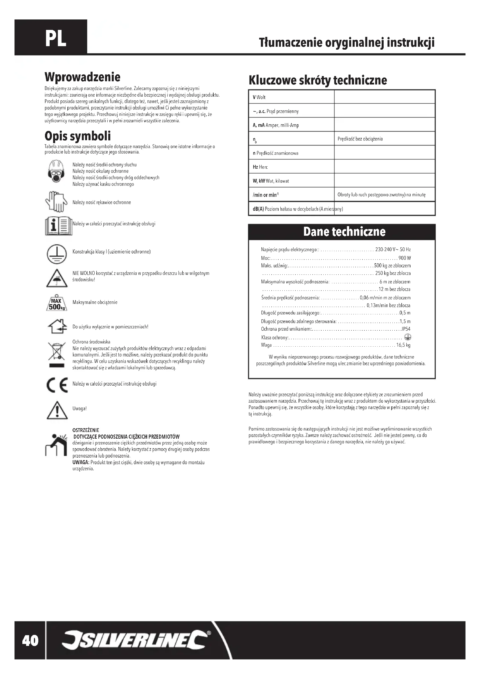 Napięcieprąduelektrycznego:: ......................... 230-240 V~ 50 Hz Moc:...........................................................900 W Maks.udźwig:........................................500kgzezbloczem ....................................................250kgbezzblocza Maksymalnawysokośćpodnoszenia: ......................6mzezbloczem ......................................................12mbezzblocza Średniaprędkośćpodnoszenia: ..................0,06m/minmzezbloczem ................................................ 0,13m/minbezzblocza Długośćprzewoduzasilającego:.....................................0,5 m Długośćprzewoduzdalnegosterowania: .............................1,5 m Ochrona przed wnikaniem:..........................................IP54 Klasaochrony:..................................................... Waga .........................................................16,5 kg Wwynikunieprzerwanegoprocesurozwojowegoproduktów,danetechniczneposzczególnychproduktówSilverlinemogąuleczmianiebezuprzedniegopowiadomienia. Kluczowe skróty techniczne Dane techniczne V Wolt~, a.c. PrądprzemiennyA, mA Amper, milli-Amp