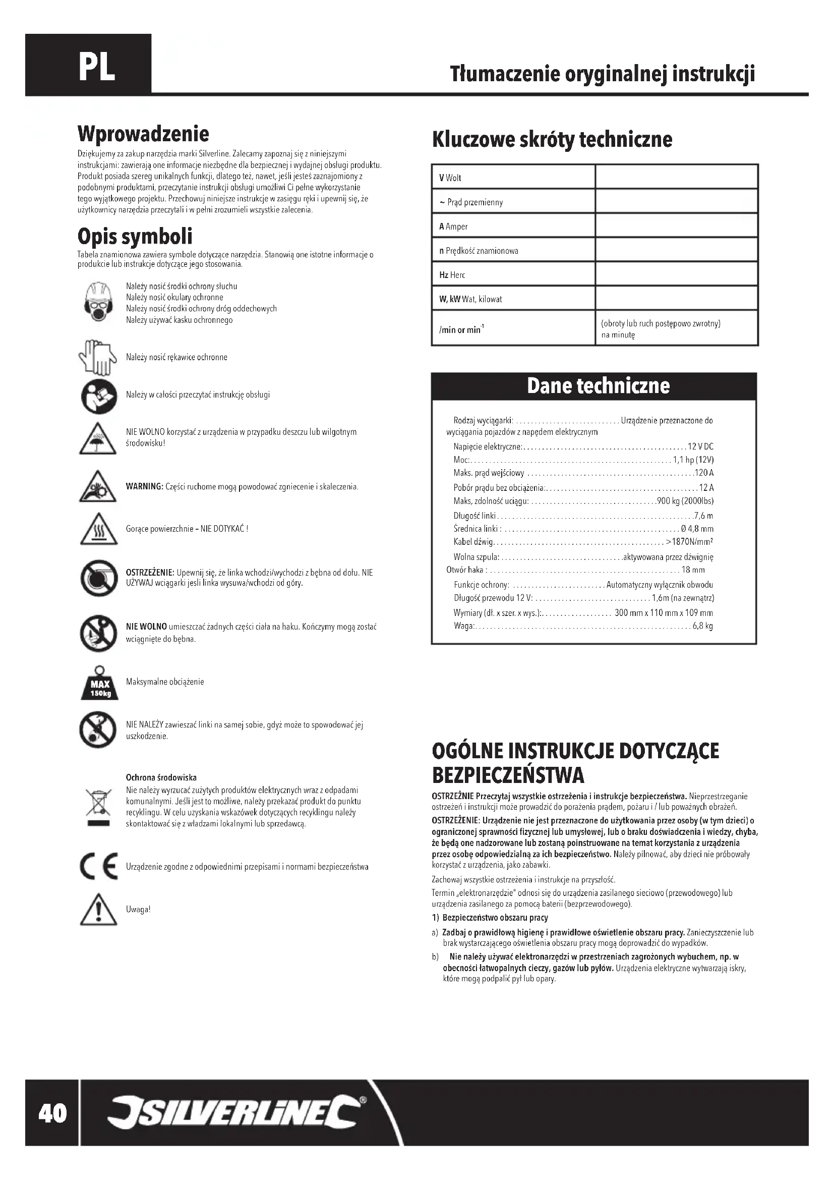 Opis symboli Tabelaznamionowazawierasymboledotyczącenarzędzia.Stanowiąoneistotneinformacjeoprodukcielubinstrukcjedotyczącejegostosowania.Należynosićśrodkiochronysłuchu Należynosićokularyochronne Należynosićśrodkiochronydrógoddechowych NależyużywaćkaskuochronnegoNależynosićrękawiceochronneNależywcałościprzeczytaćinstrukcjęobsługiNIEWOLNOkorzystaćzurządzeniawprzypadkudeszczulubwilgotnymśrodowisku!WARNING:Częściruchomemogąpowodowaćzgniecenieiskaleczenia.Gorącepowierzchnie–NIEDOTYKAĆ!OSTRZEŻENIE: Upewnijsię,żelinkawchodzi/wychodzizbębnaoddołu.NIEUŻYWAJwciągarkijeslilinkawysuwa/wchodziodgóry.NIE WOLNOumieszczaćżadnychczęściciałanahaku.Kończymymogązostaćwciągniętedobębna.MaksymalneobciążenieNIENALEŻYzawieszaćlinkinasamejsobie,gdyżmożetospowodowaćjejuszkodzenie.Ochrona środowiska Nienależywyrzucaćzużytychproduktówelektrycznychwrazzodpadamikomunalnymi.Jeślijesttomożliwe,należyprzekazaćproduktdopunkturecyklingu.Wceluuzyskaniawskazówekdotyczącychrecyklingunależyskontaktowaćsięzwładzamilokalnymilubsprzedawcą.UrządzeniezgodnezodpowiednimiprzepisamiinormamibezpieczeństwaUwaga! Wprowadzenie DziękujemyzazakupnarzędziamarkiSilverline.Zalecamyzapoznajsięzniniejszymiinstrukcjami:zawierająoneinformacjeniezbędnedlabezpiecznejiwydajnejobsługiproduktu.Produktposiadaszeregunikalnychfunkcji,dlategoteż,nawet,jeślijesteśzaznajomionyzpodobnymiproduktami,przeczytanieinstrukcjiobsługiumożliwiCipełnewykorzystanietegowyjątkowegoprojektu.Przechowujniniejszeinstrukcjewzasięgurękiiupewnijsię,żeużytkownicynarzędziaprzeczytaliiwpełnizrozumieliwszystkiezalecenia.