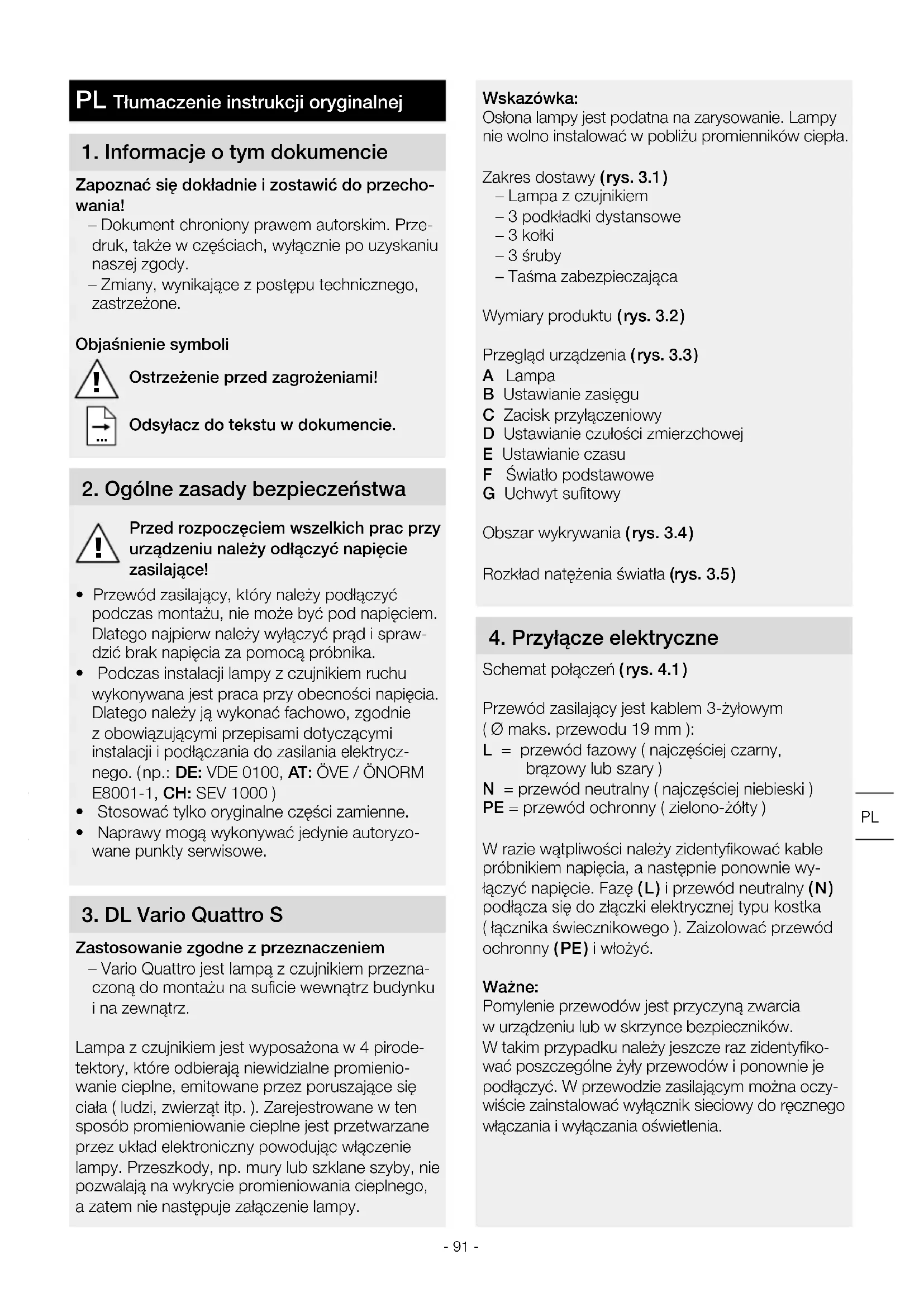 Zastosowanie zgodne zprzeznaczeniem – Vario Quattro jest lampą z czujnikiem przezna-czoną do montażu na suficie wewnątrz budynku i na zewnątrz.Lampa z czujnikiem jest wyposażona w4 pirode-tektory, które odbierają niewidzialne promienio-wanie cieplne, emitowane przez poruszające się ciała ( ludzi, zwierząt itp. ). Zarejestrowane wten sposób promieniowanie cieplne jest przetwarzane przez układ elektroniczny powodując włączenie lampy. Przeszkody, np. mury lub szklane szyby, nie pozwalają na wykrycie promieniowania cieplnego, azatem nie następuje załączenie lampy. Wskazówka: Osłona lampy jest podatna na zarysowanie. Lampy nie wolno instalować w pobliżu promienników ciepła.Zakres dostawy ( rys. 31 ) – Lampa z czujnikiem – 3 podkładki dystansowe – 3 kołki – 3 śruby – Taśma zabezpieczającaWymiary produktu ( rys. 32 ) Przegląd urządzenia ( rys. 33 )A LampaB Ustawianie zasięguC Zacisk przyłączeniowyD Ustawianie czułości zmierzchowejE Ustawianie czasuF Światło podstawoweG Uchwyt sufitowyObszar wykrywania ( rys.34 )Rozkład natężenia światła (rys35 )