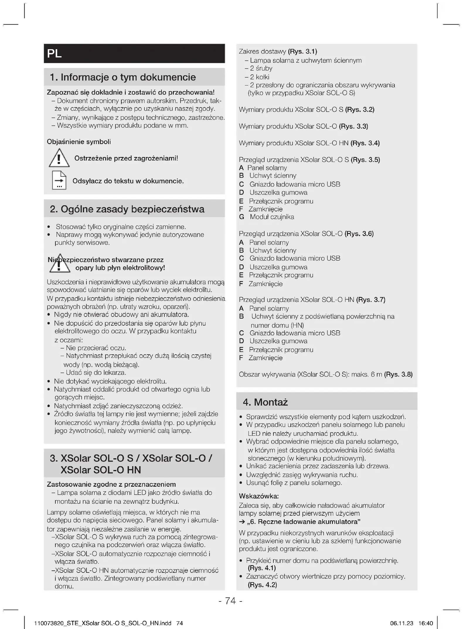 110073820_STE_XSolar SOL-O S_SOL-O_HN.indd 73110073820_STE_XSolar SOL-O S_SOL-O_HN.indd 73 06.11.23 16:4006.11.23 16:40- 74 - Zakres dostawy (Rys 31) – Lampa solarna z uchwytem ściennym – 2 śruby – 2 kołki – 2 przesłony do ograniczania obszaru wykrywania (tylko w przypadku XSolarSOL-OS) Wymiary produktu XSolarSOL-OS (Rys 32) Wymiary produktu XSolarSOL-O (Rys 33) Wymiary produktu XSolarSOL-OHN (Rys 34) Przegląd urządzenia XSolarSOL-OS (Rys 35) A Panel solarny B Uchwyt ścienny C Gniazdo ładowania micro USB D Uszczelka gumowa E Przełącznik programu F Zamknięcie G Moduł czujnika Przegląd urządzenia XSolarSOL-O (Rys 36) A Panel solarny B Uchwyt ścienny C Gniazdo ładowania micro USB D Uszczelka gumowa E Przełącznik programu F Zamknięcie Przegląd urządzenia XSolarSOL-OHN (Rys 37) A Panel solarny B Uchwyt ścienny z podświetlaną powierzchnią na numer domu (HN) C Gniazdo ładowania micro USB D Uszczelka gumowa E Przełącznik programu F Zamknięcie Obszar wykrywania (XSolarSOL-OS): maks. 6m (Rys 38) 4 Montaż