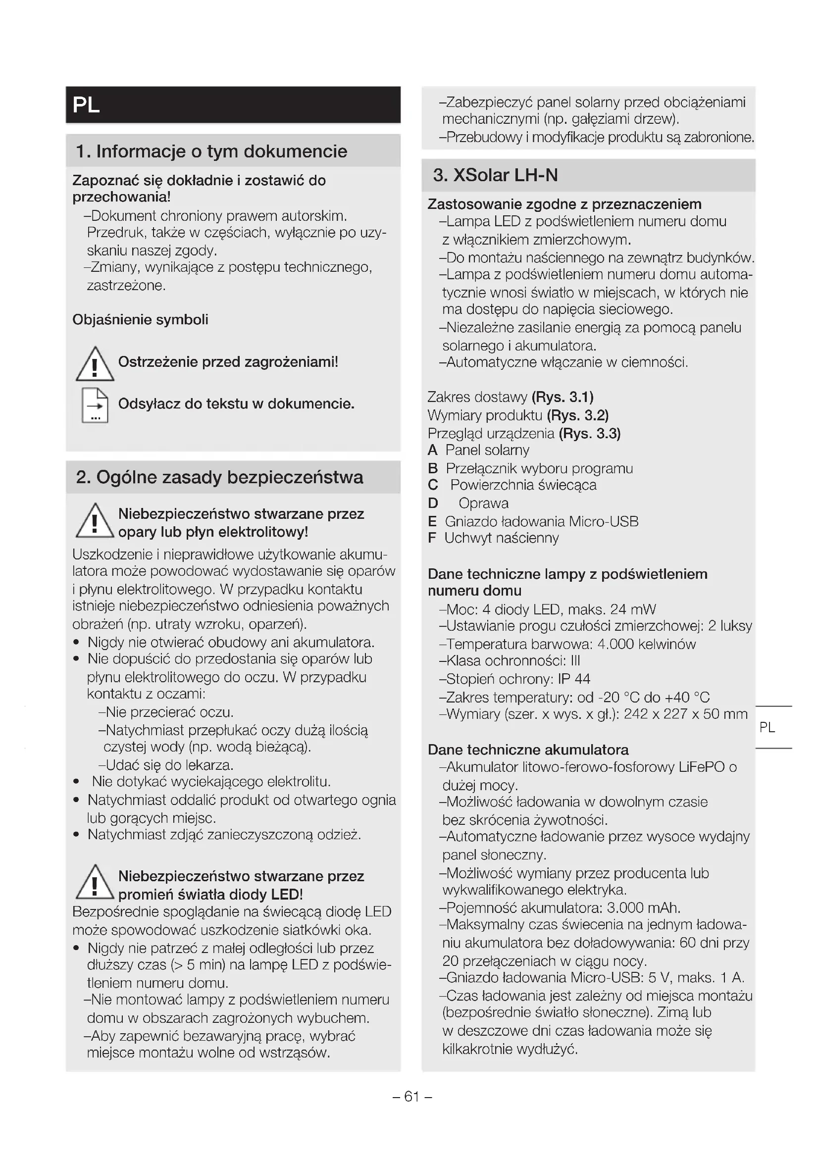 - Nigdy nie patrzeć zmałej odległości lub przez dłuższy czas (>5min) na lampę LED z podświe- tleniem numeru domu. – Nie montować lampy z podświetleniem numeru domu w obszarach zagrożonych wybuchem. – Aby zapewnić bezawaryjną pracę, wybrać miejsce montażu wolne od wstrząsów. – Zabezpieczyć panel solarny przed obciążeniami mechanicznymi (np. gałęziami drzew). – Przebudowy imodyfikacje produktu są zabronione. 3 XSolar LH-N Zastosowanie zgodne zprzeznaczeniem – Lampa LED z podświetleniem numeru domu z włącznikiem zmierzchowym. – Do montażu naściennego na zewnątrz budynków. – Lampa z podświetleniem numeru domu automa- tycznie wnosi światło wmiejscach, wktórych nie ma dostępu do napięcia sieciowego. – Niezależne zasilanie energią za pomocą panelu solarnego iakumulatora. – Automatyczne włączanie w ciemności. Zakres dostawy (Rys 31) Wymiary produktu (Rys 32) Przegląd urządzenia (Rys 33) A Panel solarny B Przełącznik wyboru programu C Powierzchnia świecąca D Oprawa E Gniazdo ładowania Micro-USB F Uchwyt naścienny Dane techniczne lampy z podświetleniem numeru domu – Moc: 4 diody LED, maks. 24 mW – Ustawianie progu czułości zmierzchowej: 2 luksy – Temperatura barwowa: 4.000kelwinów – Klasa ochronności: III – Stopień ochrony: IP 44 – Zakres temperatury: od -20°C do +40°C – Wymiary (szer. x wys. x gł.): 242 x 227 x 50 mm Dane techniczne akumulatora – Akumulator litowo-ferowo-fosforowy LiFePO o dużej mocy. – Możliwość ładowania wdowolnym czasie bez skrócenia żywotności. – Automatyczne ładowanie przez wysoce wydajny panel słoneczny. – Możliwość wymiany przez producenta lub wykwalifikowanego elektryka. – Pojemność akumulatora: 3.000mAh. – Maksymalny czas świecenia na jednym ładowa- niu akumulatora bez doładowywania: 60 dni przy 20 przełączeniach w ciągu nocy. – Gniazdo ładowania Micro-USB: 5 V, maks. 1 A. – Czas ładowania jest zależny od miejsca montażu (bezpośrednie światło słoneczne). Zimą lub wdeszczowe dni czas ładowania może się kilkakrotnie wydłużyć. PL– 62 – 4 Montaż