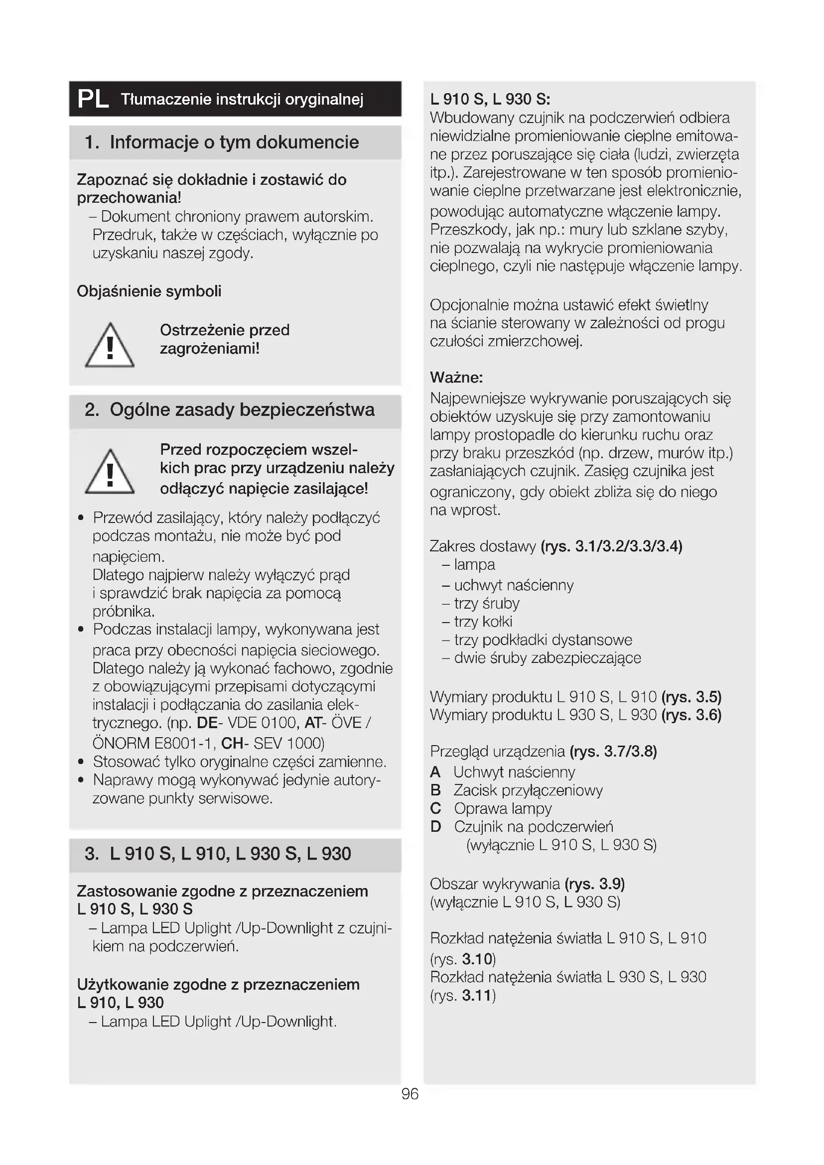 - Naprawy mogą wykonywać jedynie autory- zowane punkty serwisowe. 3 L910S, L910, L930S, L930 Zastosowanie zgodne zprzeznaczeniem L910S, L930S – Lampa LED Uplight /Up-Downlight z czujni- kiem na podczerwień. Użytkowanie zgodne zprzeznaczeniem L910, L930 – Lampa LED Uplight /Up-Downlight. L910S, L930S: Wbudowany czujnik na podczerwień odbiera niewidzialne promieniowanie cieplne emitowa- ne przez poruszające się ciała (ludzi, zwierzęta itp.). Zarejestrowane wten sposób promienio- wanie cieplne przetwarzane jest elektronicznie, powodując automatyczne włączenie lampy. Przeszkody, jak np.: mury lub szklane szyby, nie pozwalają na wykrycie promieniowania cieplnego, czyli nie następuje włączenie lampy. Opcjonalnie można ustawić efekt świetlny na ścianie sterowany w zależności od progu czułości zmierzchowej. Ważne: Najpewniejsze wykrywanie poruszającychsię obiektów uzyskujesię przy zamontowaniu lampy prostopadle do kierunku ruchu oraz przy braku przeszkód (np. drzew, murów itp.) zasłaniających czujnik. Zasięg czujnika jest ograniczony, gdy obiekt zbliża się do niego na wprost. Zakres dostawy (rys 31/32/33/34) – lampa – uchwyt naścienny – trzy śruby – trzy kołki – trzy podkładki dystansowe – dwie śruby zabezpieczające Wymiary produktu L910S, L910 (rys 35) Wymiary produktu L930S, L930 (rys 36) Przegląd urządzenia (rys 37/38) A Uchwyt naścienny B Zacisk przyłączeniowy C Oprawa lampy D Czujnik na podczerwień (wyłącznie L910S, L930S) Obszar wykrywania (rys 39) (wyłącznie L910S, L930S) Rozkład natężenia światła L910S, L910 (rys. 310) Rozkład natężenia światła L930S, L930 (rys. 311) Tłumaczenie instrukcji oryginalnej97 4 Przyłącze elektryczne Schemat połączeń (rys 41) Przewód zasilający jest kablem 3-żyłowym: L = przewód fazowy (najczęściej czarny, brązowy lub szary) N = przewód zerowy (najczęściej niebieski) PE = przewód ochronny (zielono-żółty) K = przewód komunikacyjny (opcjonalny) (wyłącznie L910S, L930S) Wrazie wątpliwości należy zidentyfikować przewody próbnikiem napięcia, anastępnie ponownie wyłączyć napięcie. Fazę (L) iprze- wód neutralny (N) podłącza się do zacisku przyłączeniowego, a przewód ochronny (PE) do zacisku (E). (rys 55/56) Ważne: Pomylenie przewodów jest przyczyną później- szego zwarcia wurządzeniu lub wskrzynce bezpieczników. W takim przypadku należy jeszcze raz zidentyfikować poszczególne prze- wody iponownie je podłączyć. Wprzewodzie zasilającym można oczywiście zainstalować wyłącznik sieciowy do ręcznego włączania iwyłączania oświetlenia. Źródło światła tej lampy nie jest wymienne; jeżeli zajdzie konieczność wymiany źródła świa- tła (np. po upłynięciu jego żywotności), należy wymienić całą lampę. Zachowanie grupowe Za pomocą przewodu komunikacyjnego (K) możliwe jest stworzenie wewnętrznej sieci grup modeli L910S, L930SLED. W tym celu nale- ży wyłamać nakładkę maskującą w przestrzeni przyłączeniowej. (rys 42) W sieci można połączyć maks. 10 lamp. Mak- symalna długość przewodu komunikacyjnego wynosi 50 m. Pierwsza lampa grupy, która wykrywa ruch, włącza całą grupę. Jeżeli po upłynięciu ustawionego czasu nie zostanie wykryty żaden dalszy ruch, ostatnia lampa danej grupy wyłączy całą grupę. Wskazówka: – Przez przewód komunikacyjny nie może przechodzić napięcie zasilające. Nie wolno podłączać obciążeń zewnętrznych! – W obrębie sieci grup wszystkie lampy działa- ją zgodnie z indywidualnie ustawionymi, za pomocą przełącznika DIP, wartościami. – W trybie testowym nie jest możliwe tworze- nie sieci grup. 5 Montaż