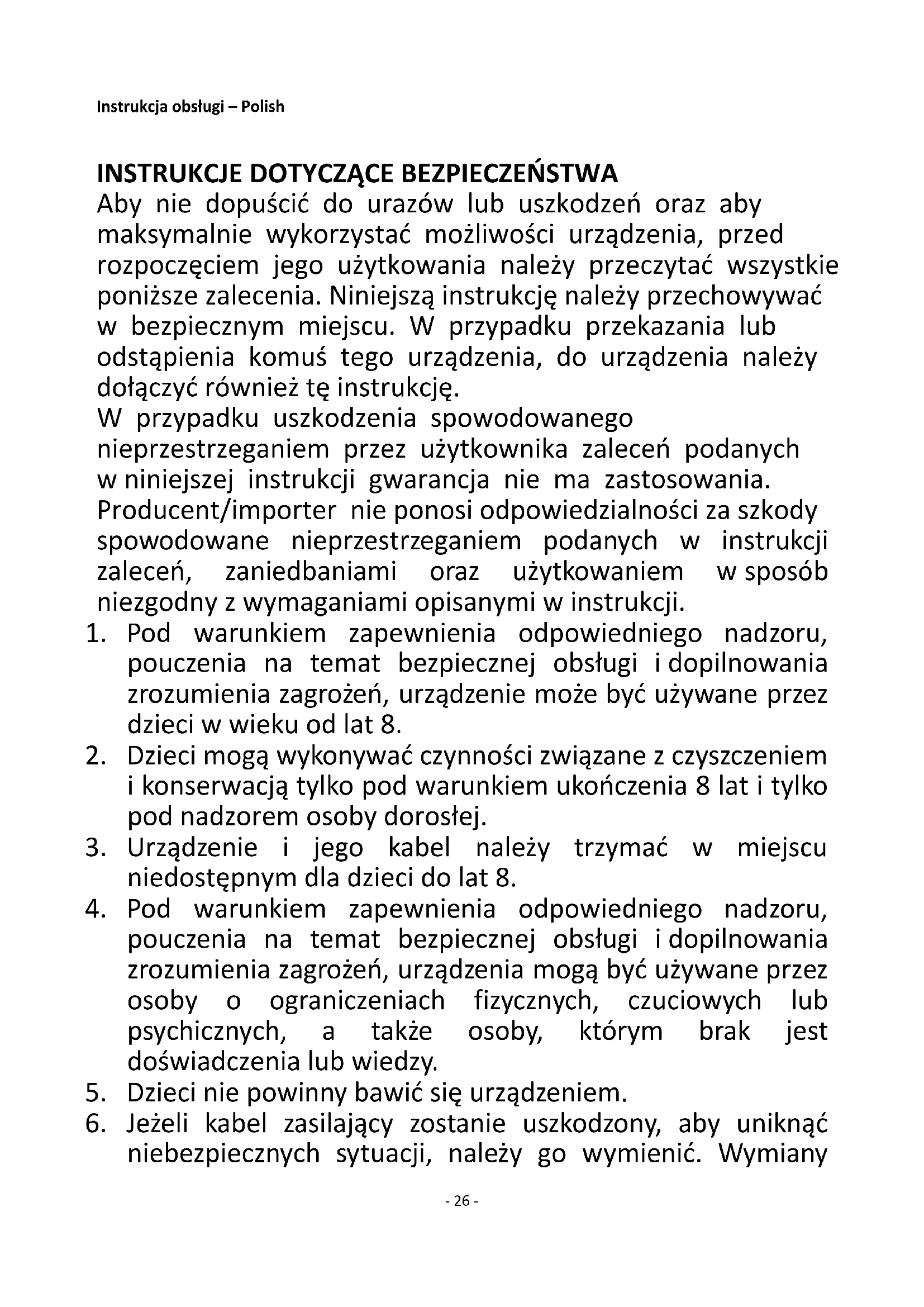 Aby nie dopuścić do urazów lub uszkodzeń oraz aby maksymalnie wykorzystać możliwości urządzenia, przed rozpoczęciem jego użytkowania należy przeczytać wszystkie poniższe zalecenia. Niniejszą instrukcję należy przechowywać w bezpiecznym miejscu. W przypadku przekazania lub odstąpienia komuś tego urządzenia, do urządzenia należy dołączyć również tę instrukcję. W przypadku uszkodzenia spowodowanego nieprzestrzeganiem przez użytkownika zaleceń podanych w niniejszej instrukcji gwarancja nie ma zastosowania. Producent/importer nie ponosi odpowiedzialności za szkody spowodowane nieprzestrzeganiem podanych w instrukcji zaleceń, zaniedbaniami oraz użytkowaniem w sposób niezgodny z wymaganiami opisanymi w instrukcji.