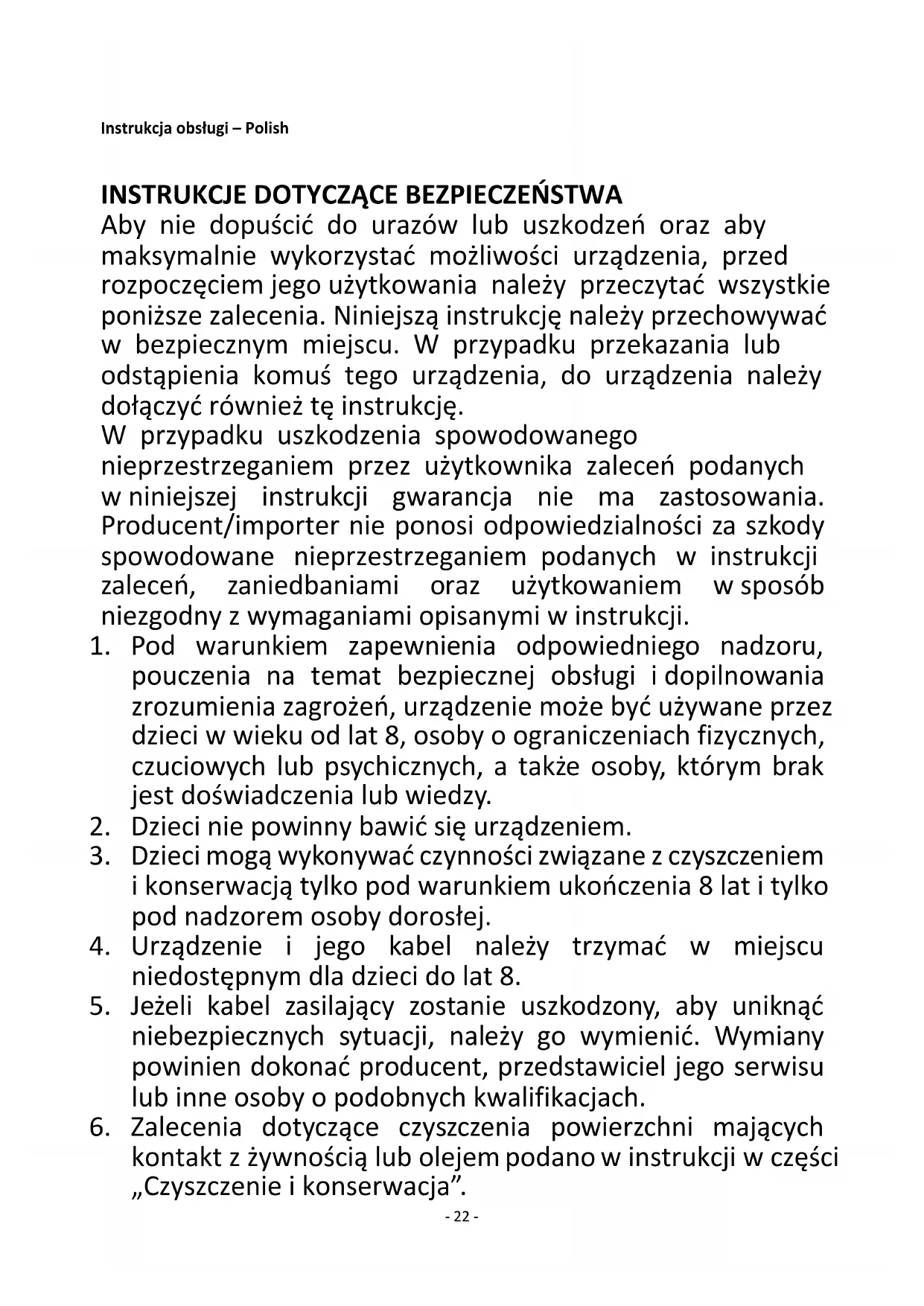 Aby nie dopuścić do urazów lub uszkodzeń oraz aby maksymalnie wykorzystać możliwości urządzenia, przed rozpoczęciem jego użytkowania należy przeczytać wszystkie poniższe zalecenia. Niniejszą instrukcję należy przechowywać w bezpiecznym miejscu. W przypadku przekazania lub odstąpienia komuś tego urządzenia, do urządzenia należy dołączyć również tę instrukcję. W przypadku uszkodzenia spowodowanego nieprzestrzeganiem przez użytkownika zaleceń podanych w niniejszej instrukcji gwarancja nie ma zastosowania. Producent/importer nie ponosi odpowiedzialności za szkody spowodowane nieprzestrzeganiem podanych w instrukcji zaleceń, zaniedbaniami oraz użytkowaniem w sposób niezgodny z wymaganiami opisanymi w instrukcji.