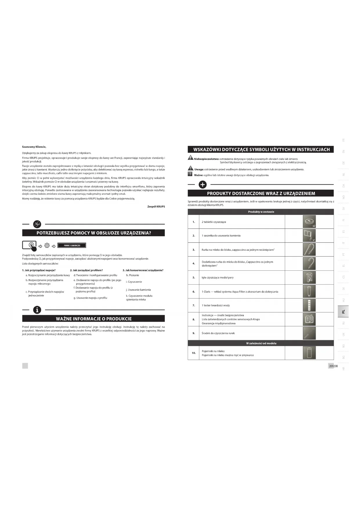 Szanowny Kliencie, Dziękujemy za zakup ekspresu do kawy KRUPS z młynkiem. Firma KRUPS projektuje, opracowuje i produkuje swoje ekspresy do kawy we Francji, zapewniając najwyższe standardy i jakość produkcji. Twoje urządzenie zostało zaprojektowane z myślą o łatwości obsługi i pozwala bez wysiłku przygotować w domu napoje, jakie znasz z kawiarni. Wystarczy jedno dotknięcie przycisku, aby delektować się kawą espresso, ristretto lub lungo, a także cappuccino, latte macchiato, cae latte oraz innymi napojami z mlekiem. Aby pomóc Ci w pełni wykorzystać możliwości urządzenia każdego dnia, rma KRUPS opracowała intuicyjny wskaźnik świetlny. Wskaźnik pomoże Ci w obsłudze urządzenia i urozmaici przerwy na kawę. Ekspres do kawy KRUPS ma także duż y intuicyjny ekran dotykowy podobny do interfejsu smartfonu, który zapewnia intuicyjną obsługę. Ponadto zastosowana w urządzeniu zaawansowana technologia pozwala uzyskać najlepsze rezultaty, dzięki czemu świeżo zmielone ziarna kawy zapewniają maksymalny aromat i pełny smak. Mamy nadzieję, że robienie kawy za pomocą urządzenia KRUPS będzie dla Ciebie przyjemnością. Zespół KRUPS POTRZEBUJESZ POMOCY W OBSŁUDZE URZĄDZENIA?