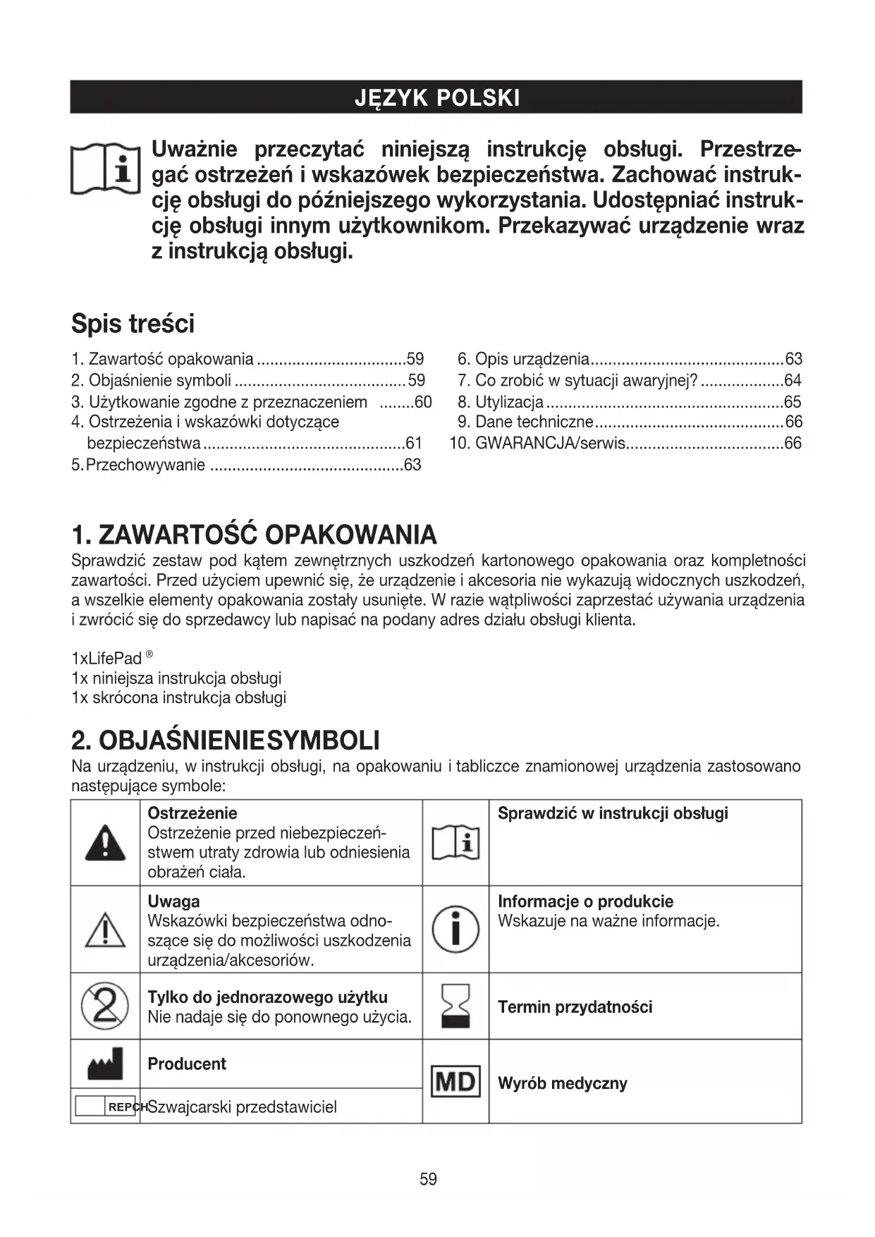 szące się do możliwości uszkodzenia urządzenia/akcesoriów. Informacje oprodukcie Wskazuje na ważne informacje. Tylko do jednorazowego użytku Nie nadaje się do ponownego użycia. Termin przydatności Producent Wyrób medyczny REPCH Szwajcarski przedstawiciel60 UDI Unikalny identyfikator urządzenia (UDI) Identyfikator do jednoznacznej iden